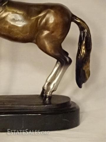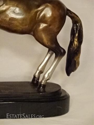 LOT 69B: BRONZE HORSE SCULPTURE, ON MARBLE BASE, LIMITED EDITION NUMBERED 17/50 AND SIGNED JAY WILLIAMS ON BASE, EXCELLENT CONDIITON, 14"H X 15"W X 5.5"D, SKU388.02H159