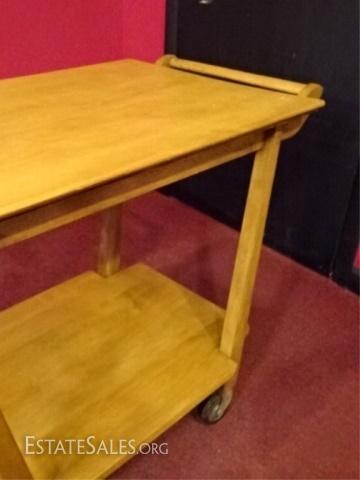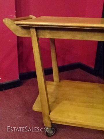 LOT 69D: MID CENTURY MODERN SERVING CART, JOHN WIDDICOMB STYLE, WITH UNDER TIER AND CASTERS, VERY GOOD CONDITION, BLONDE FINISH, 36"W X 20"D X 27.5"H, SKU355.01
