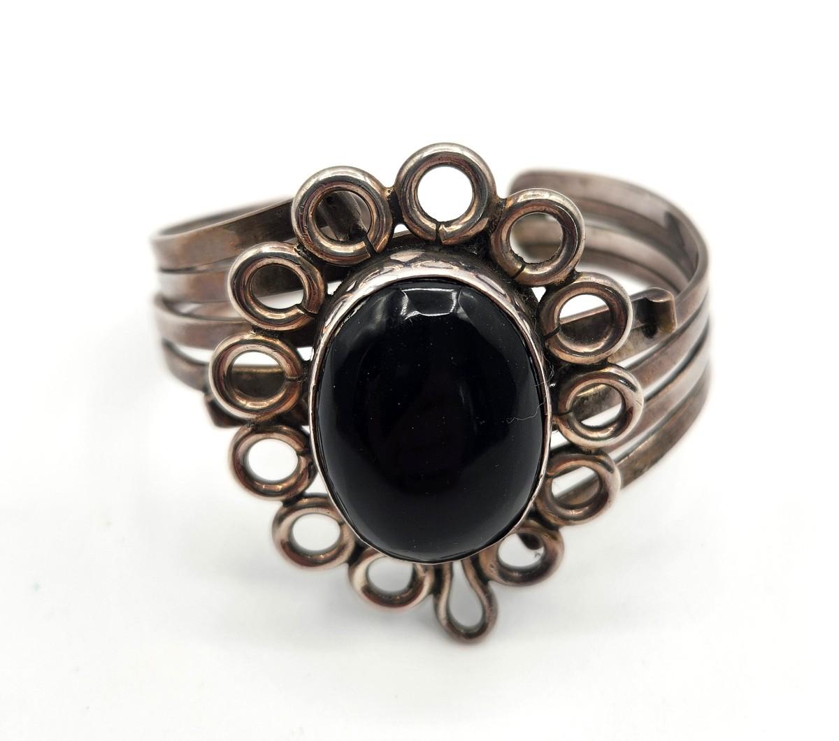 Nice, marked sterling silver Mexican Taxco bracelet - heavy. Has large inset onyx in center. Artisan piece.