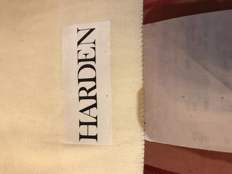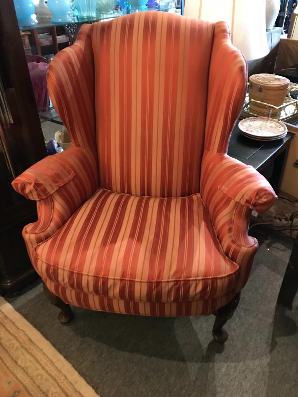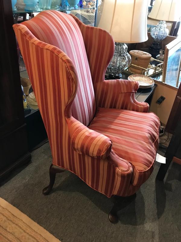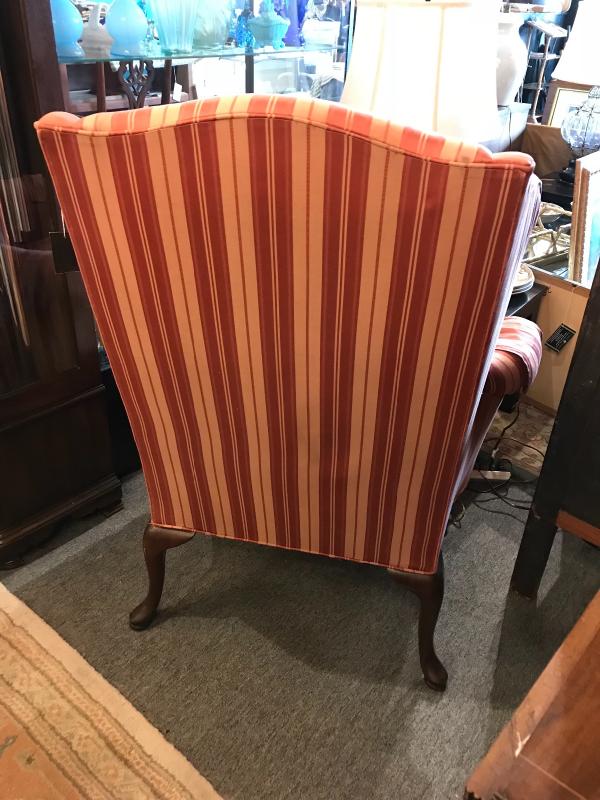 Very nice Harden wing chair with mahogany shell carved Queen Anne legs. From Harden catalog #8402. Down cushion. Deep rose damask stripe upholstery. 36" x 32" x 44" H Pair available.