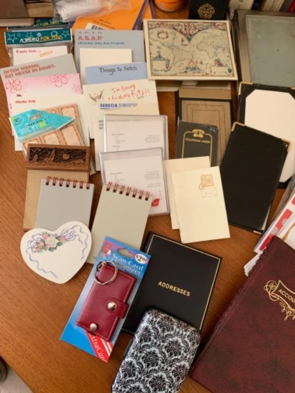 Lot 6U. Office supplies, note pads, address labels, reference books, leather business card cases vintage postcards, etc.--Was$20- Now$10