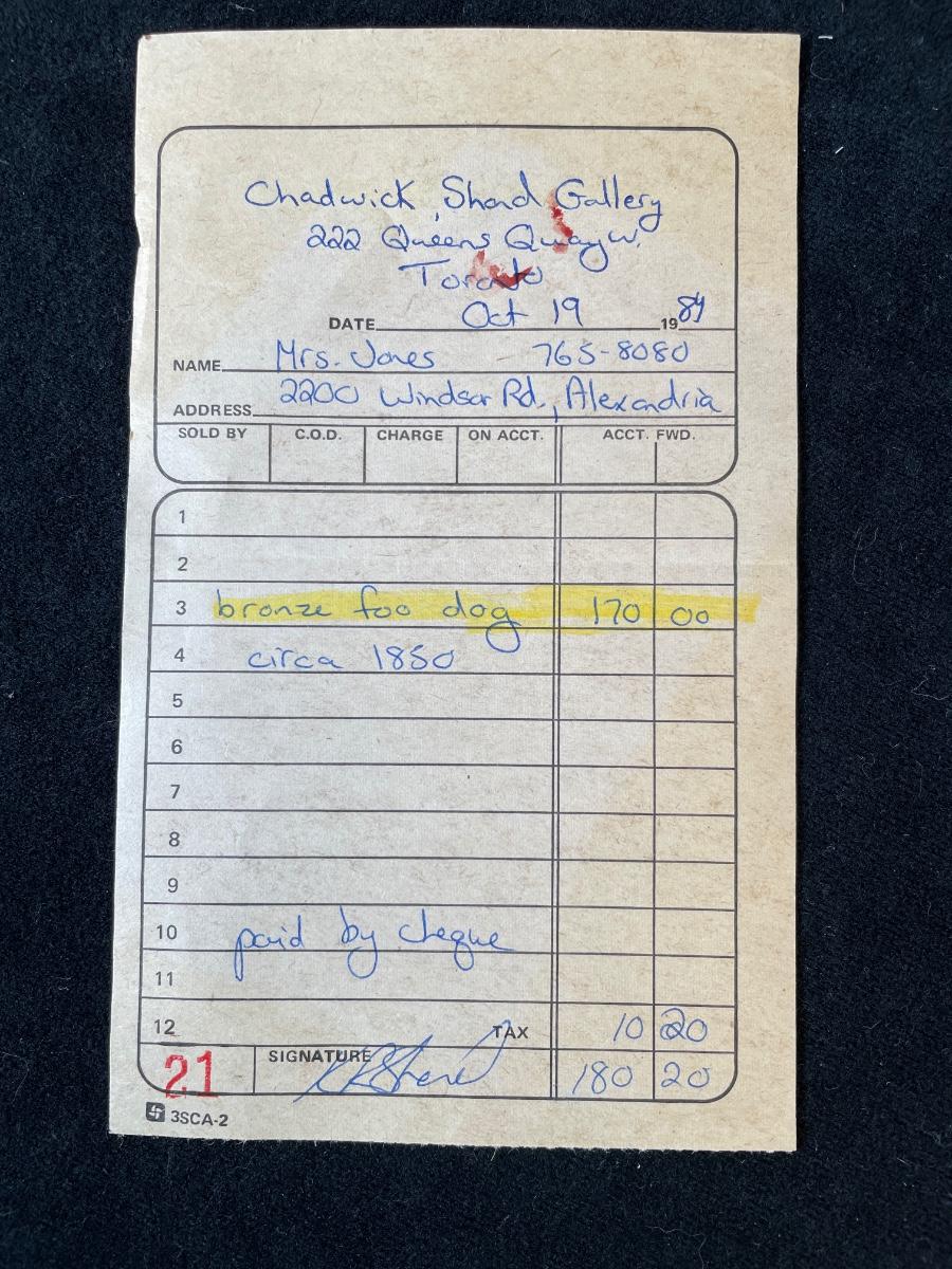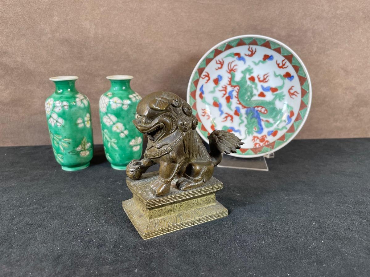 Antique Bronze Foo dog from 1850s measures 4" tall X 4" wide (see receipt in photos); pair of vintage Asian porcelain vases 4" tall and a porcelain dish 6" dia.