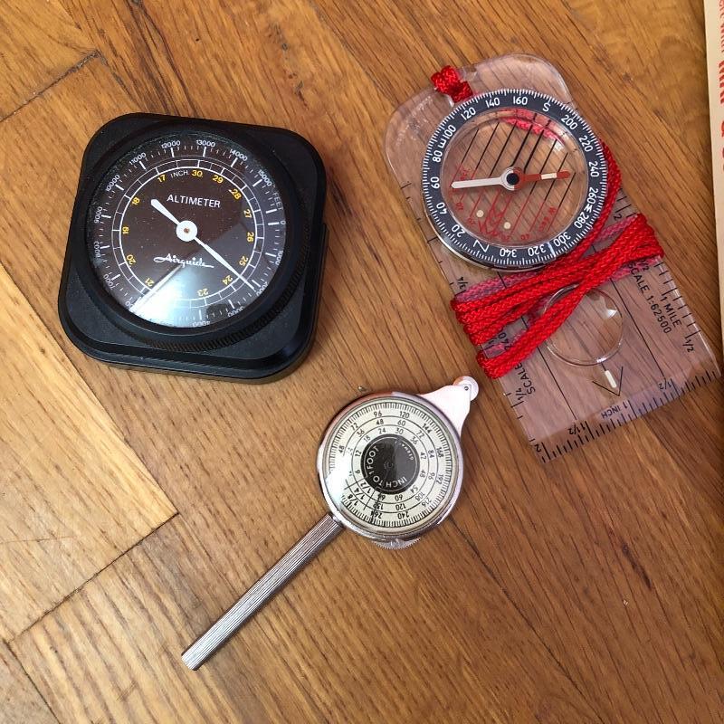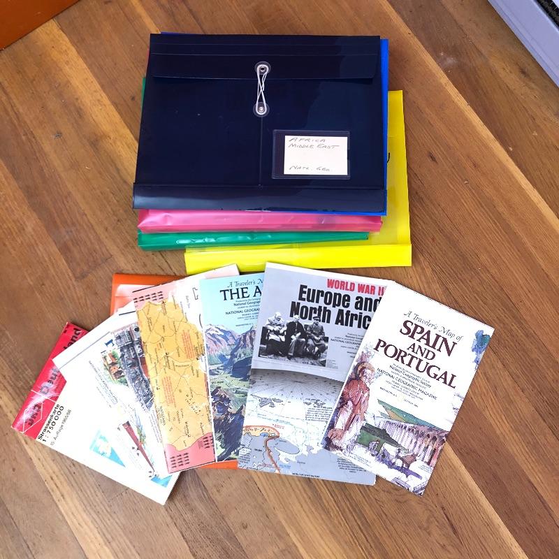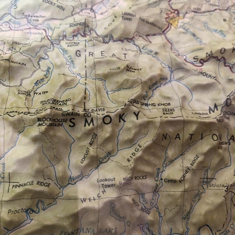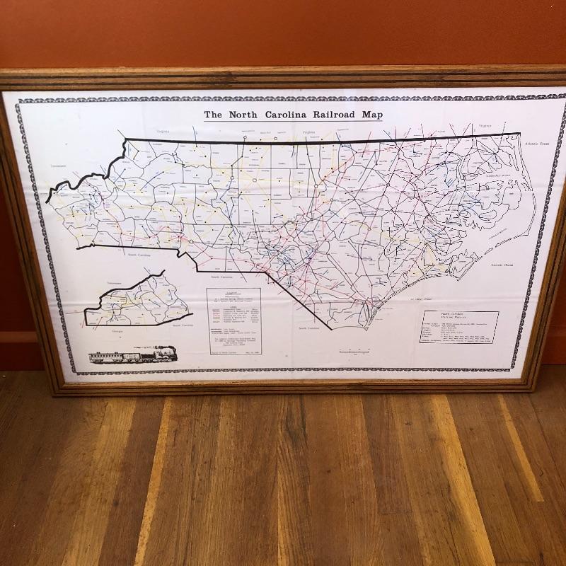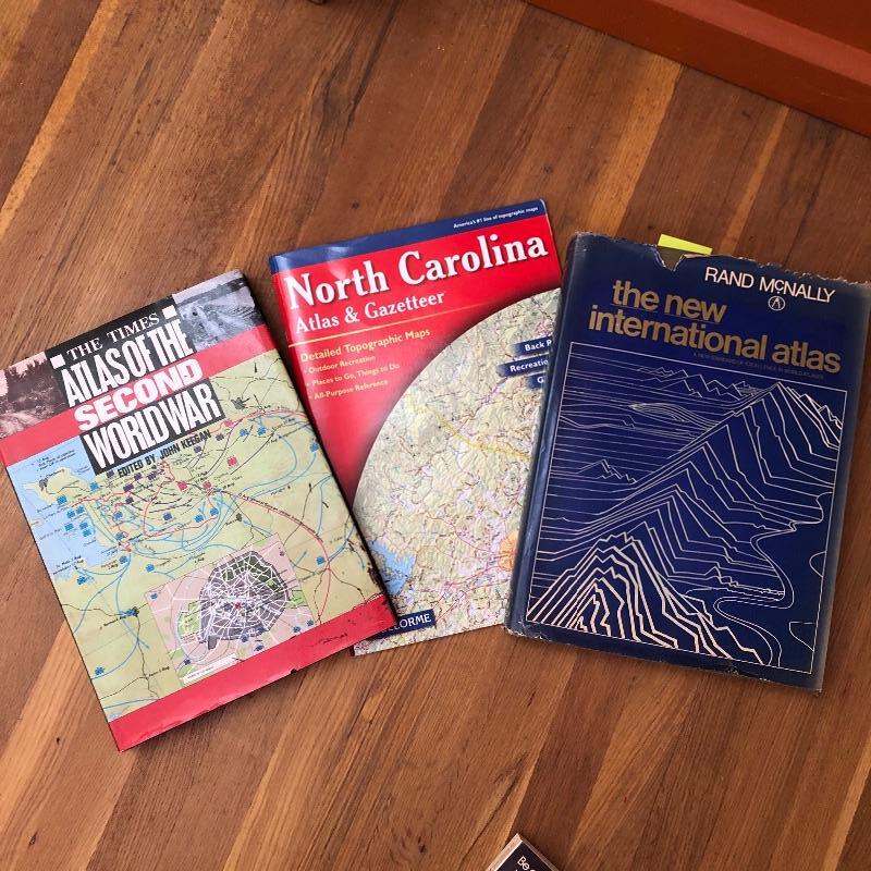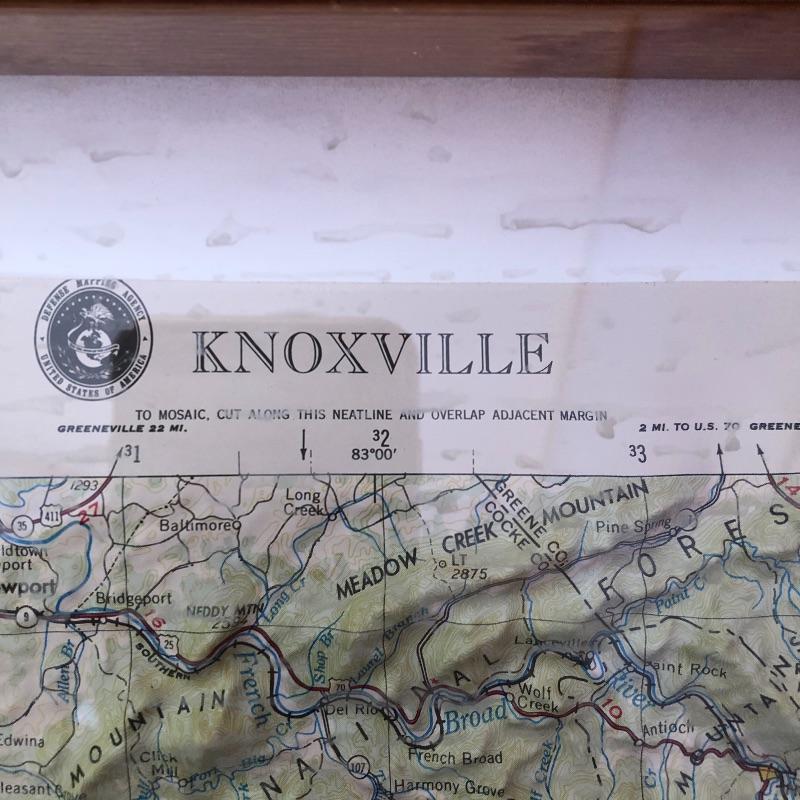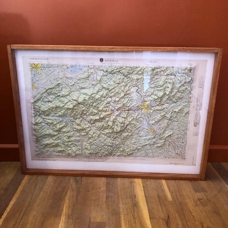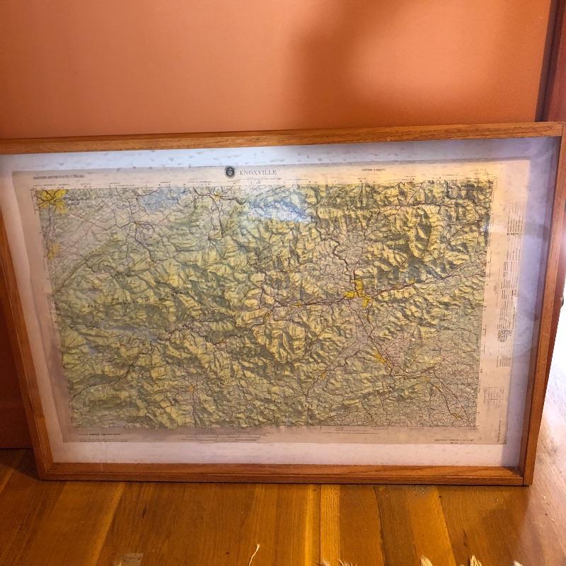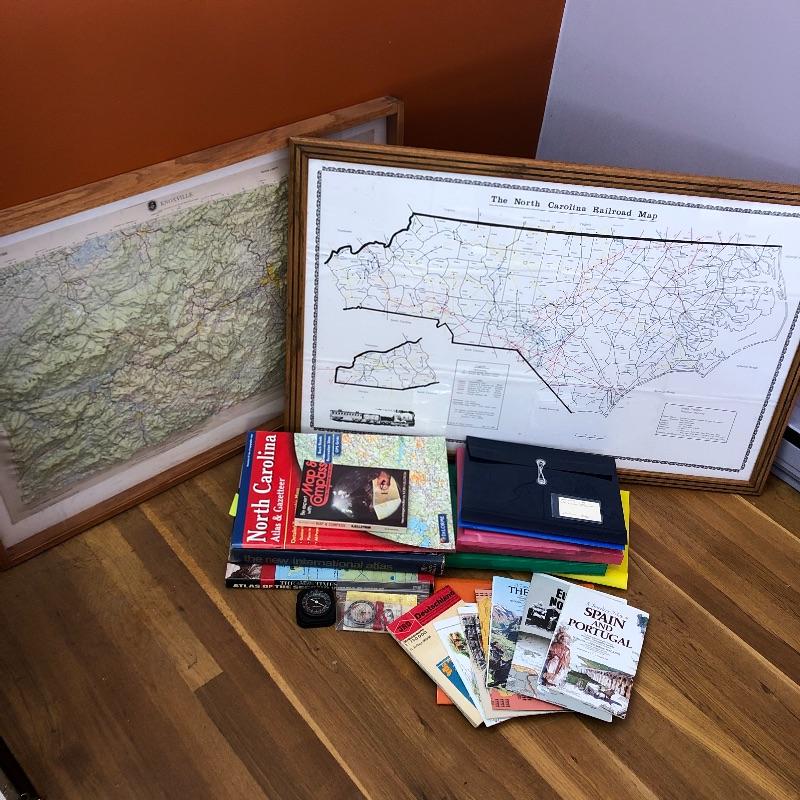 This lot contains two framed maps; the first is a raised map of Knoxville (36” x 25” x 1.5”). The second is a flat map of the North Carolina Railroad system (40” x 25.5”). It also contains several historical books, including ones about maps, an atlas, a world about WWII, and more. Lastly, it contains several compasses and a blue bin filled with small maps and informational packets about different countries around the world. Local pickup only.