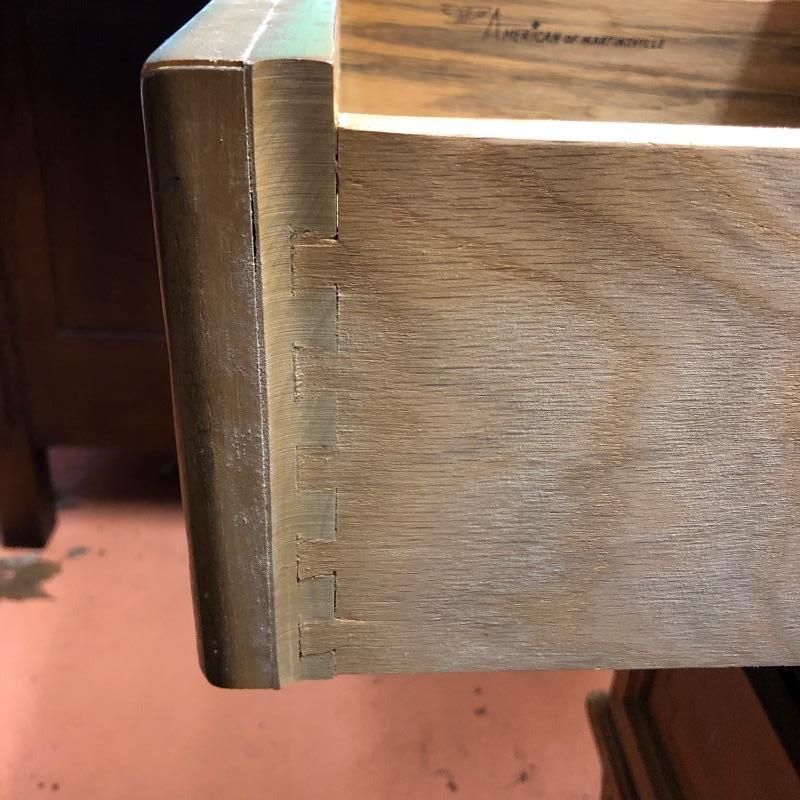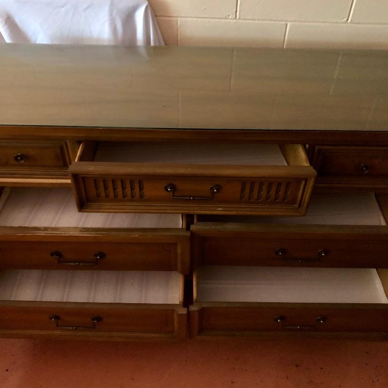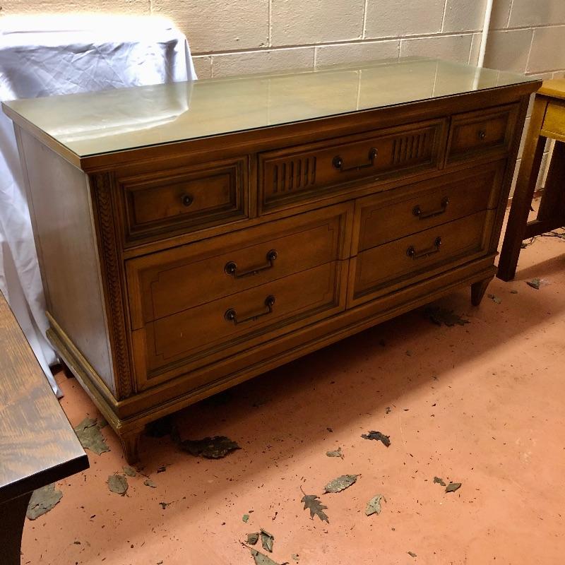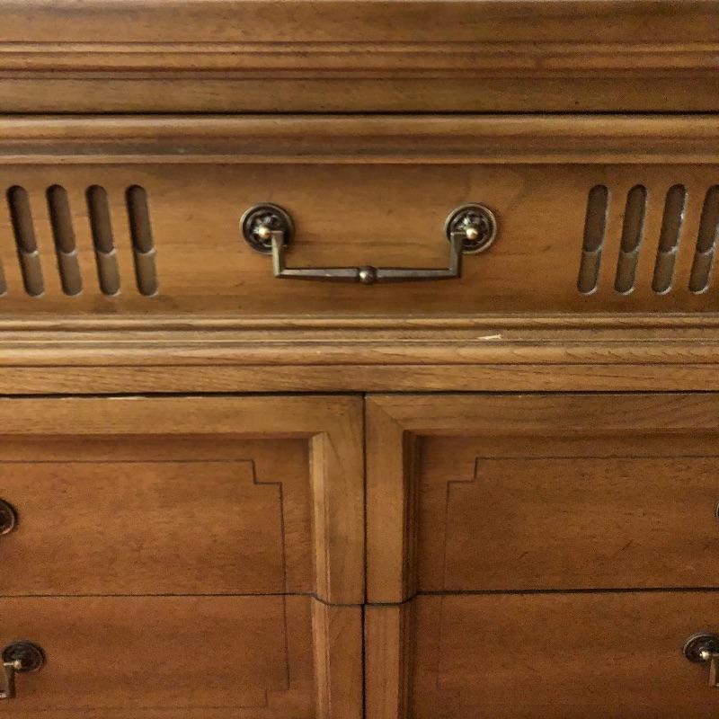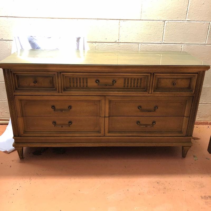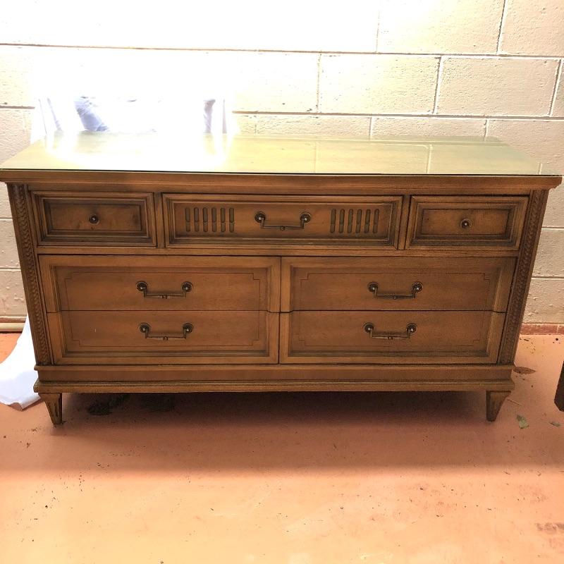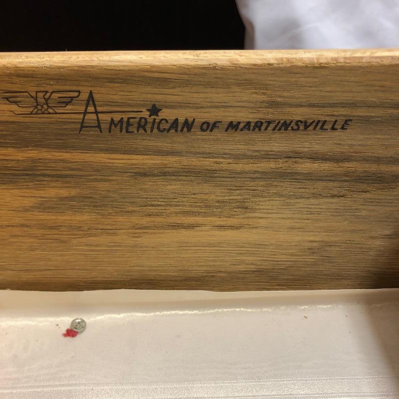 There are lots of exquisite details in this light colored American of Martinsville wood dresser with its Mid Century, slightly Art Deco look. It has five large dovetailed drawers and two smaller ones, all have metal hardware pulls. There is a glass panel protecting its surface top. It does have a few nicks that can be seen in images.
