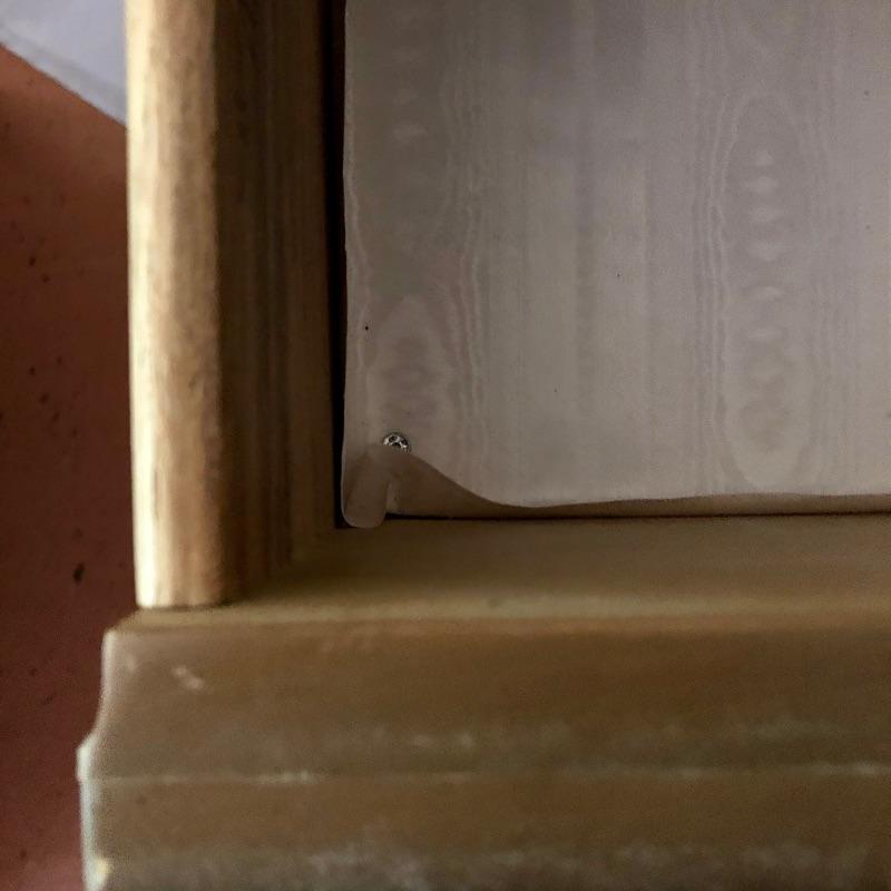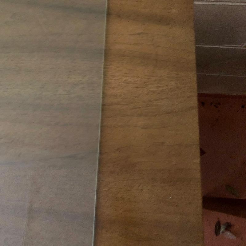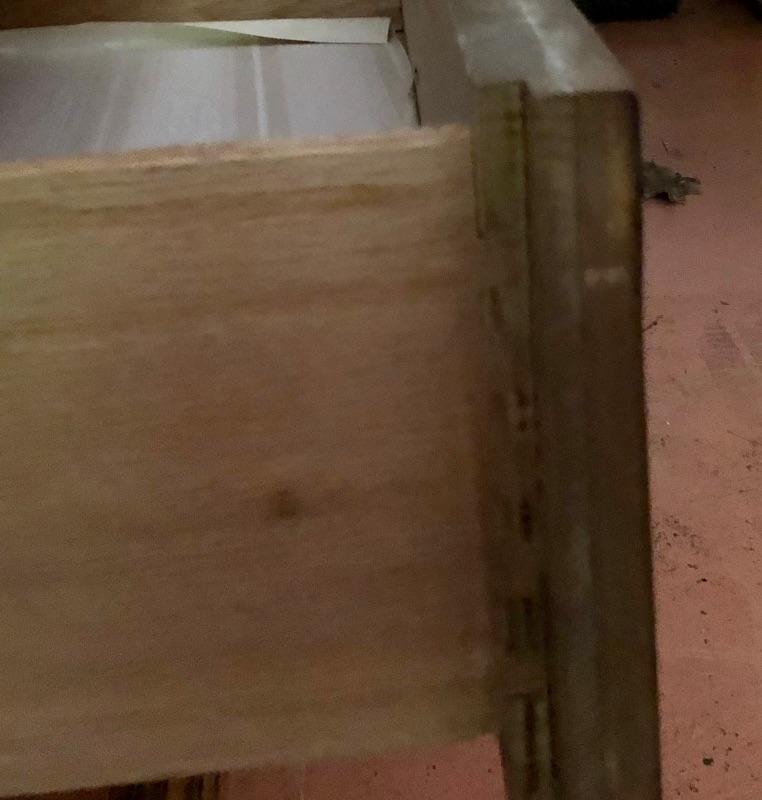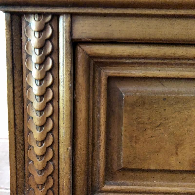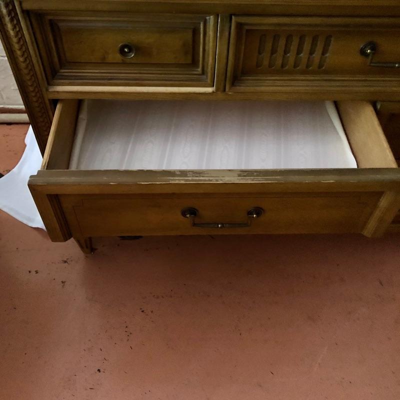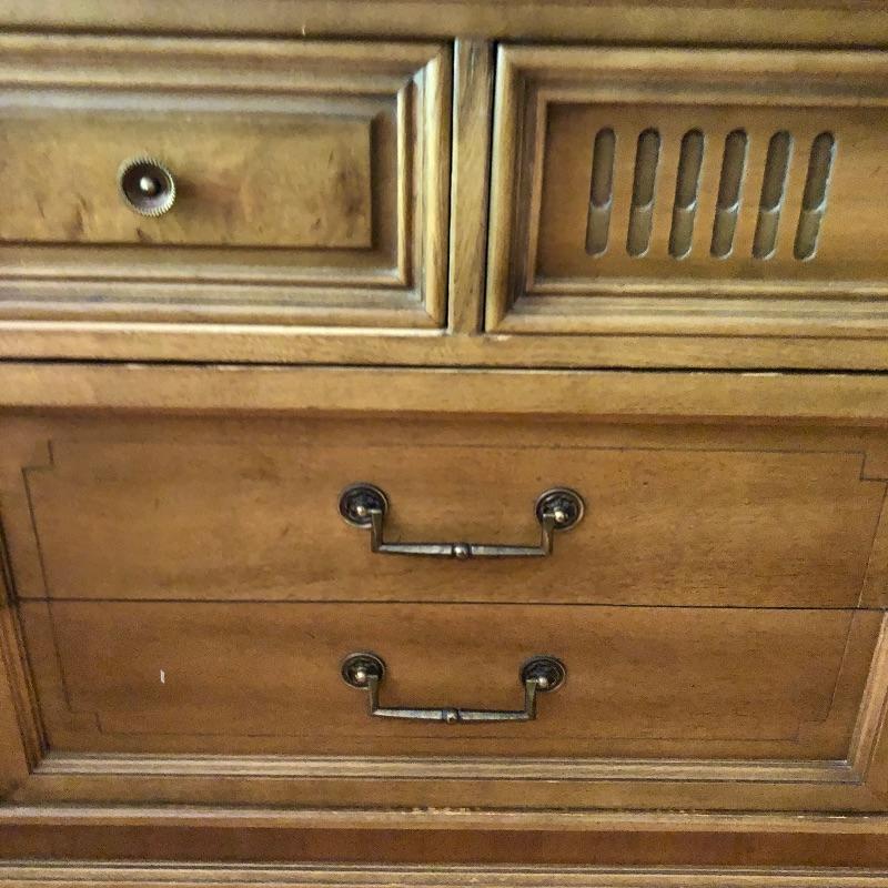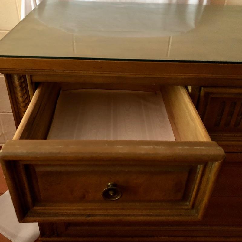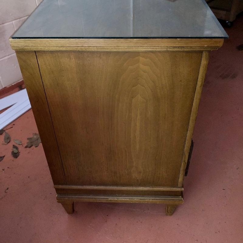 There are lots of exquisite details in this light colored American of Martinsville wood dresser with its Mid Century, slightly Art Deco look. It has five large dovetailed drawers and two smaller ones, all have metal hardware pulls. There is a glass panel protecting its surface top. It does have a few nicks that can be seen in images.