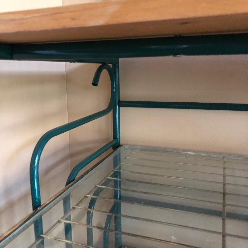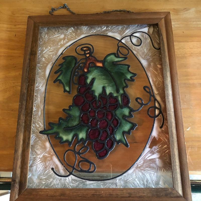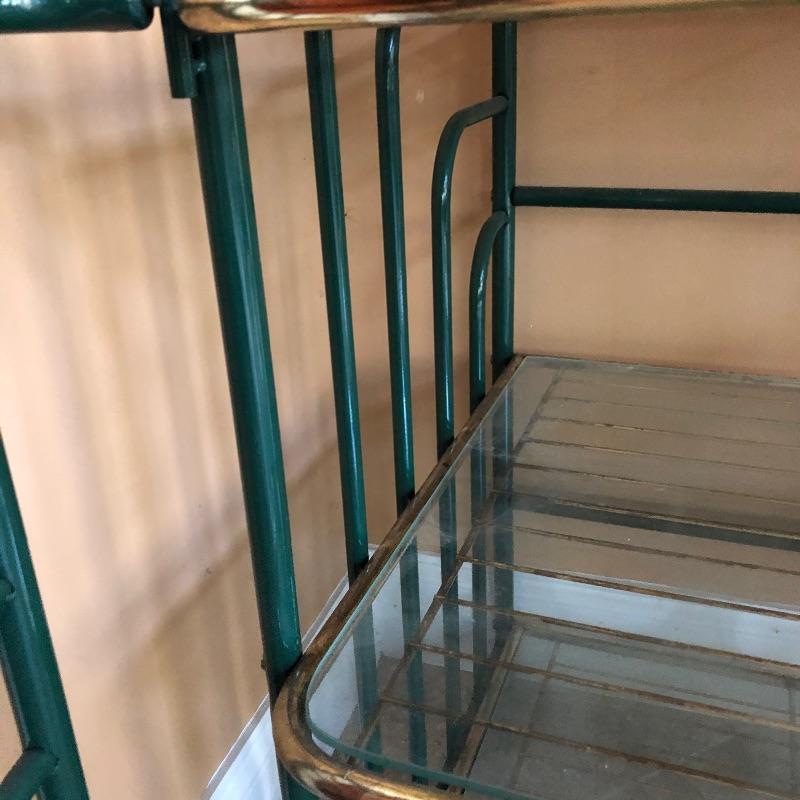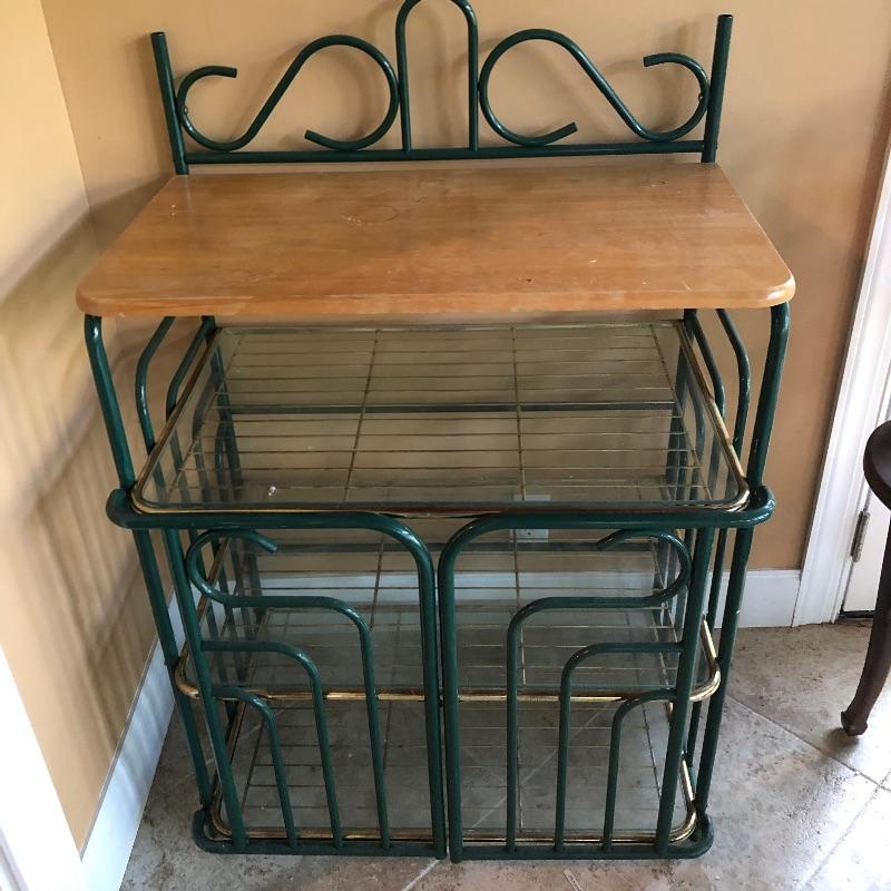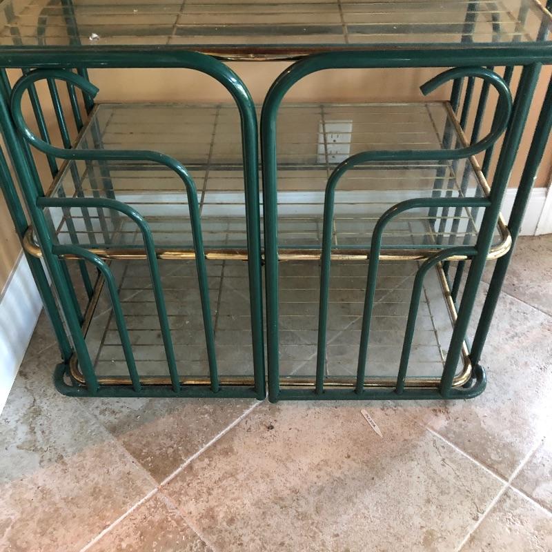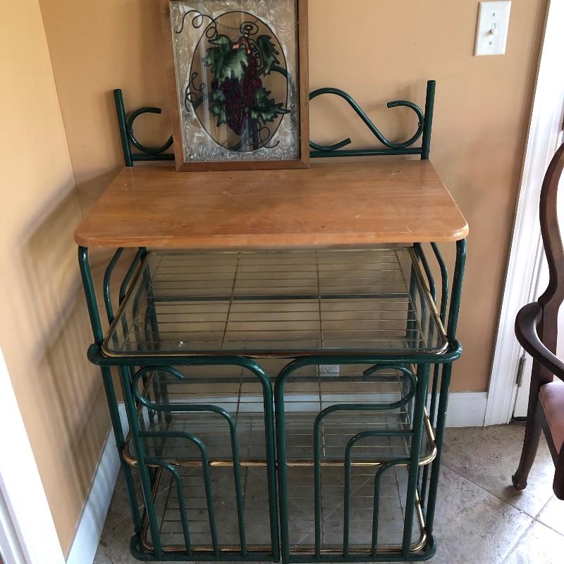 This lot is perfect for the entertainer! Included in this lot is one glass and metal material bar caddy and one stained glass picture of grapes. The caddy has green metal and gold designs. Caddy is in good condition but glass shelves may have some scratches. The stained glass picture is in a wooden frame and is in good condition. The caddy measures about 43") x 30" x 20". The stained glass 16" x 13" x 1". Local pick up only.