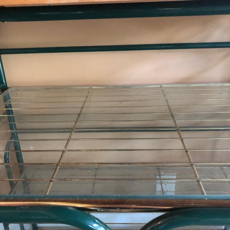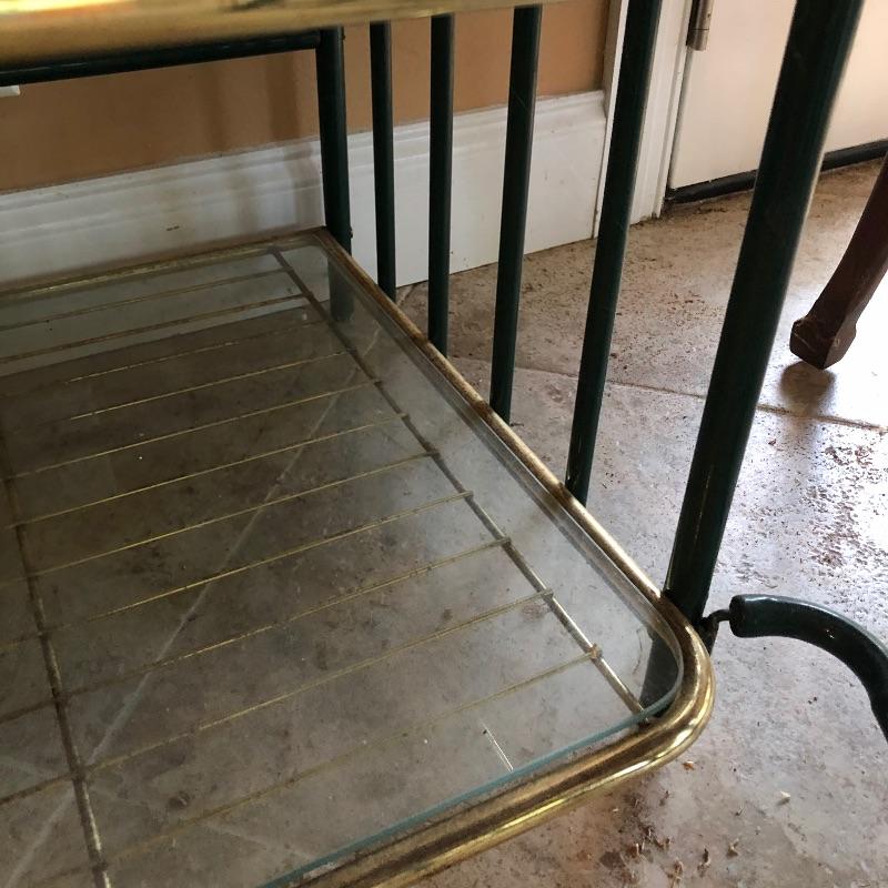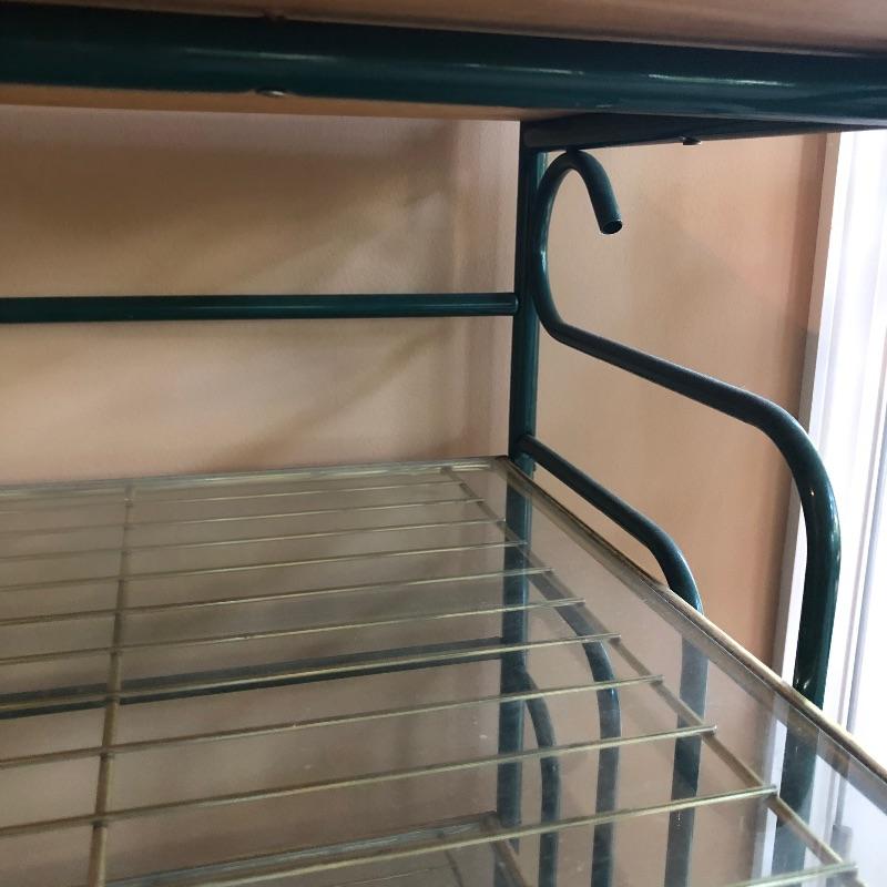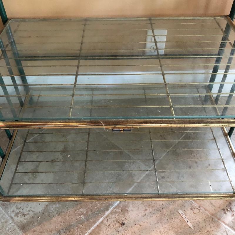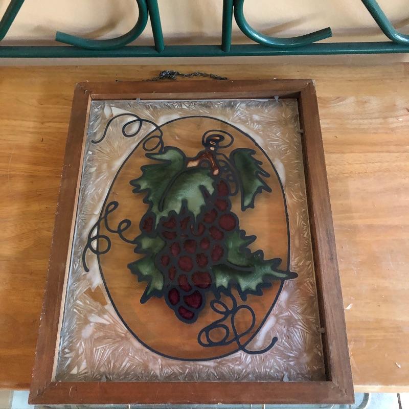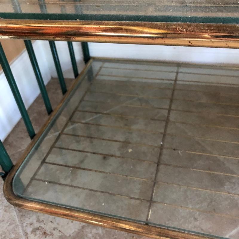 This lot is perfect for the entertainer! Included in this lot is one glass and metal material bar caddy and one stained glass picture of grapes. The caddy has green metal and gold designs. Caddy is in good condition but glass shelves may have some scratches. The stained glass picture is in a wooden frame and is in good condition. The caddy measures about 43") x 30" x 20". The stained glass 16" x 13" x 1". Local pick up only.