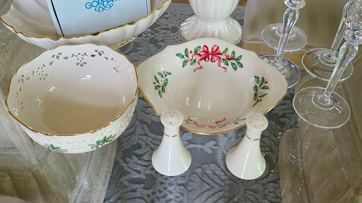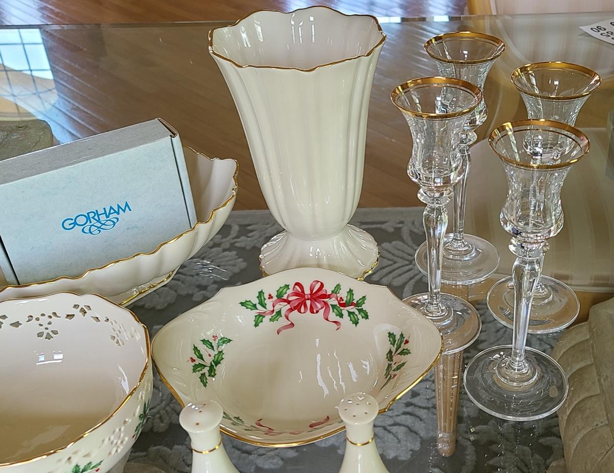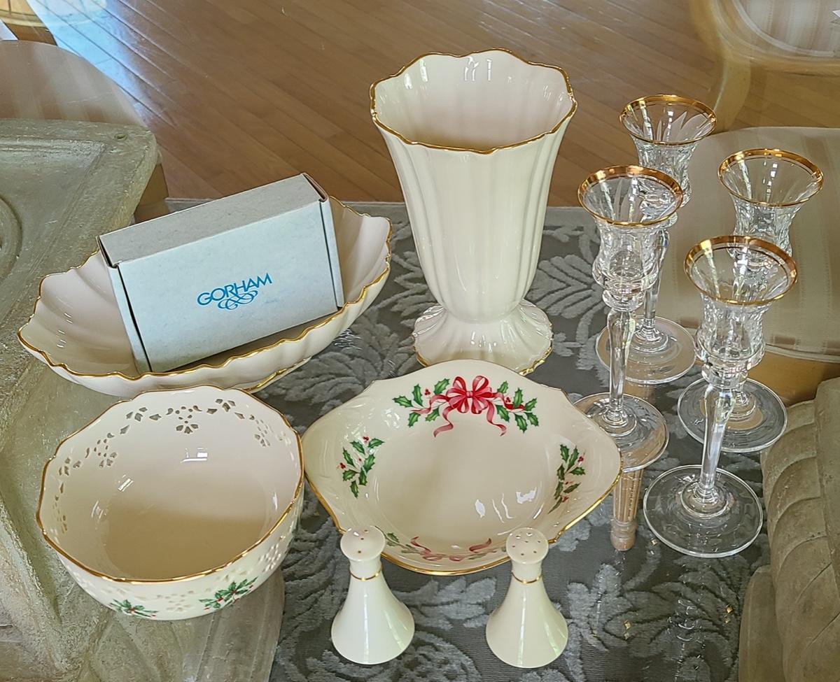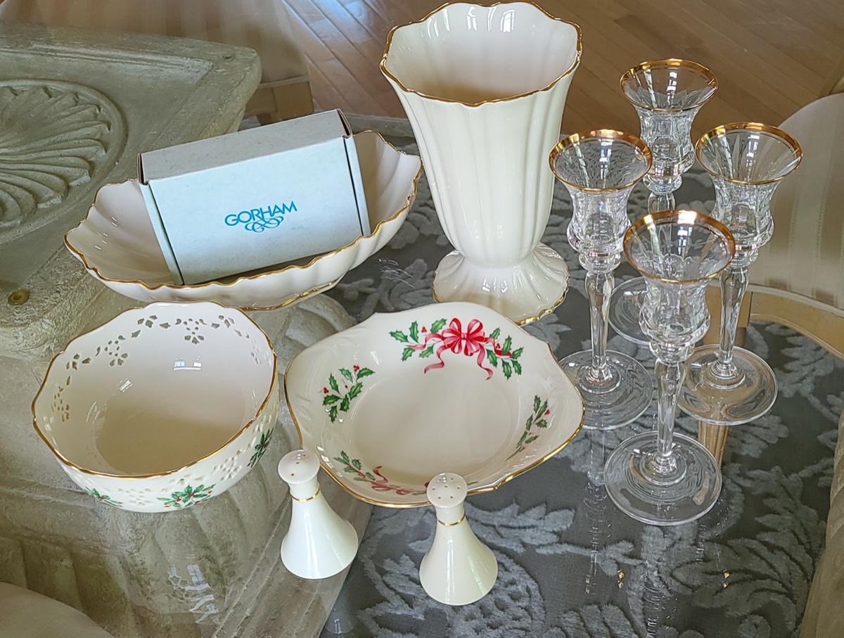 Nice lot of decorative setting pieces for the holidays, including Lenox Holiday, Lenox with elegant gold rim, gold rim cordials, salt and pepper set, and Gotham/Lenox napkin rings set of four. Please see all pictures for content of the lot, condition of the lot, and measurements if taken. Pictures are the best representation of the items listed and items are untested unless indicated in description. Thank you for looking and have fun bidding!