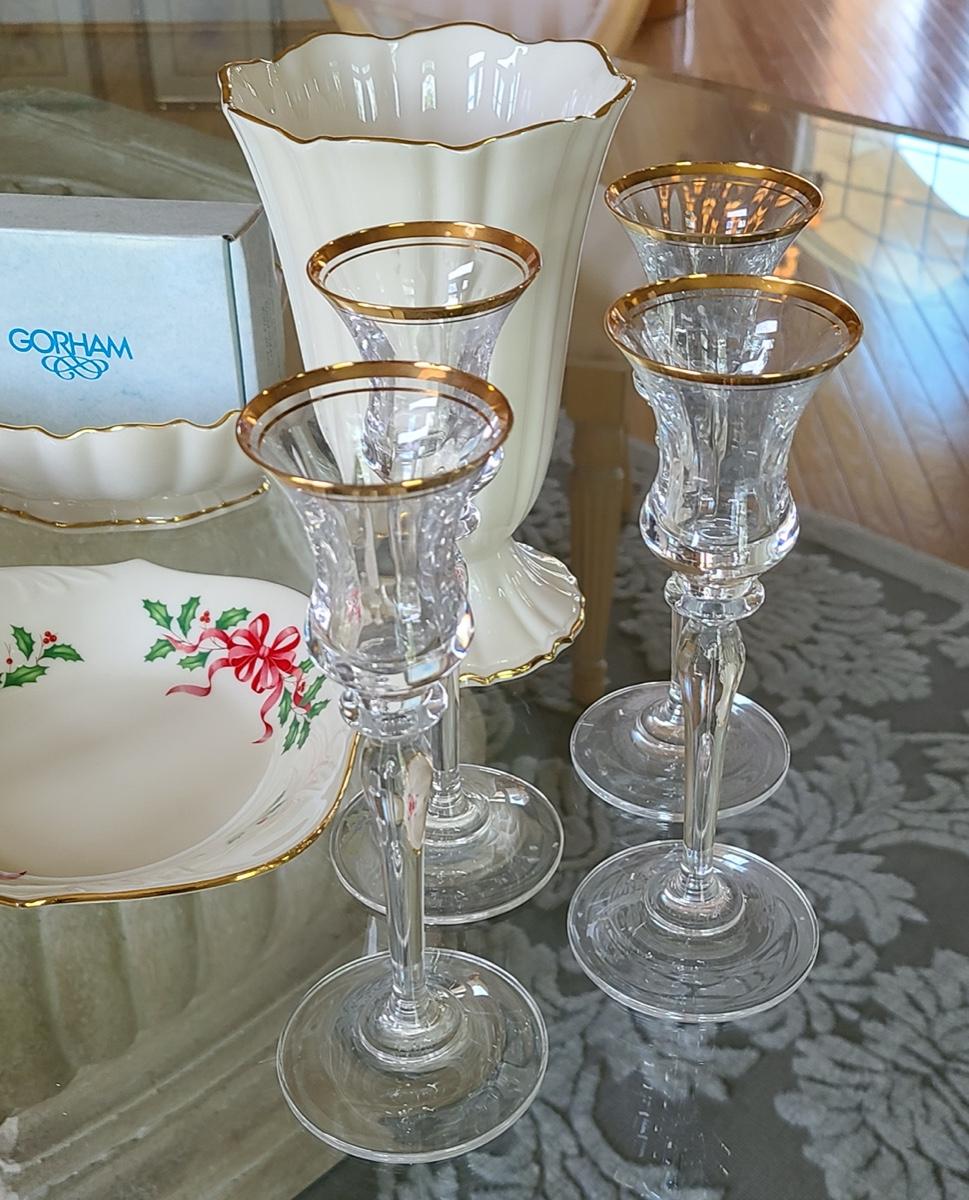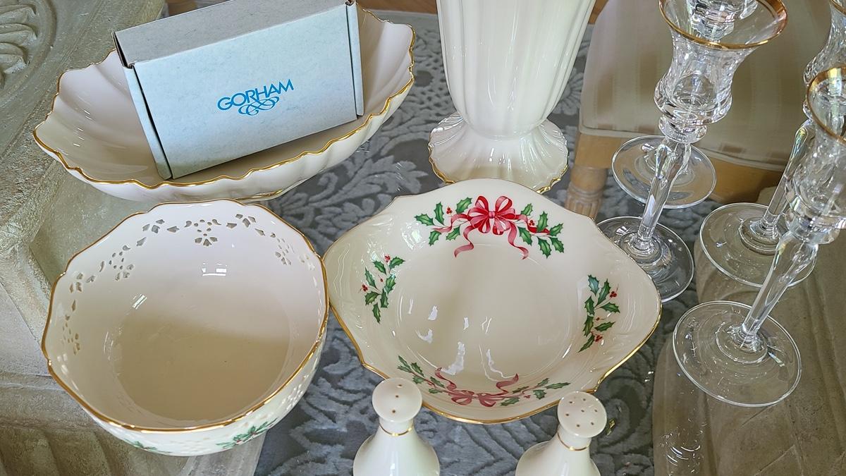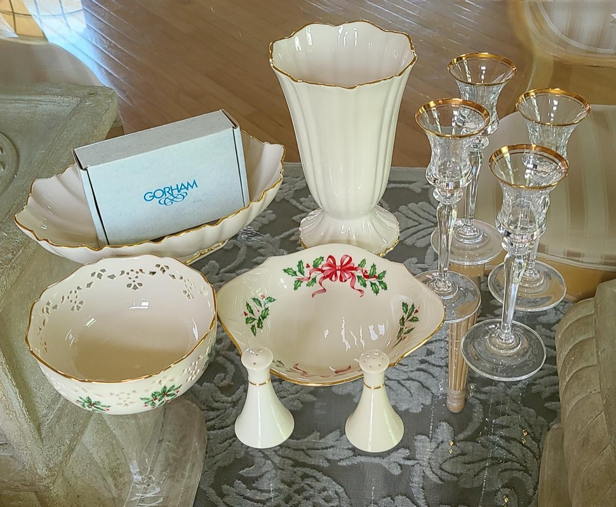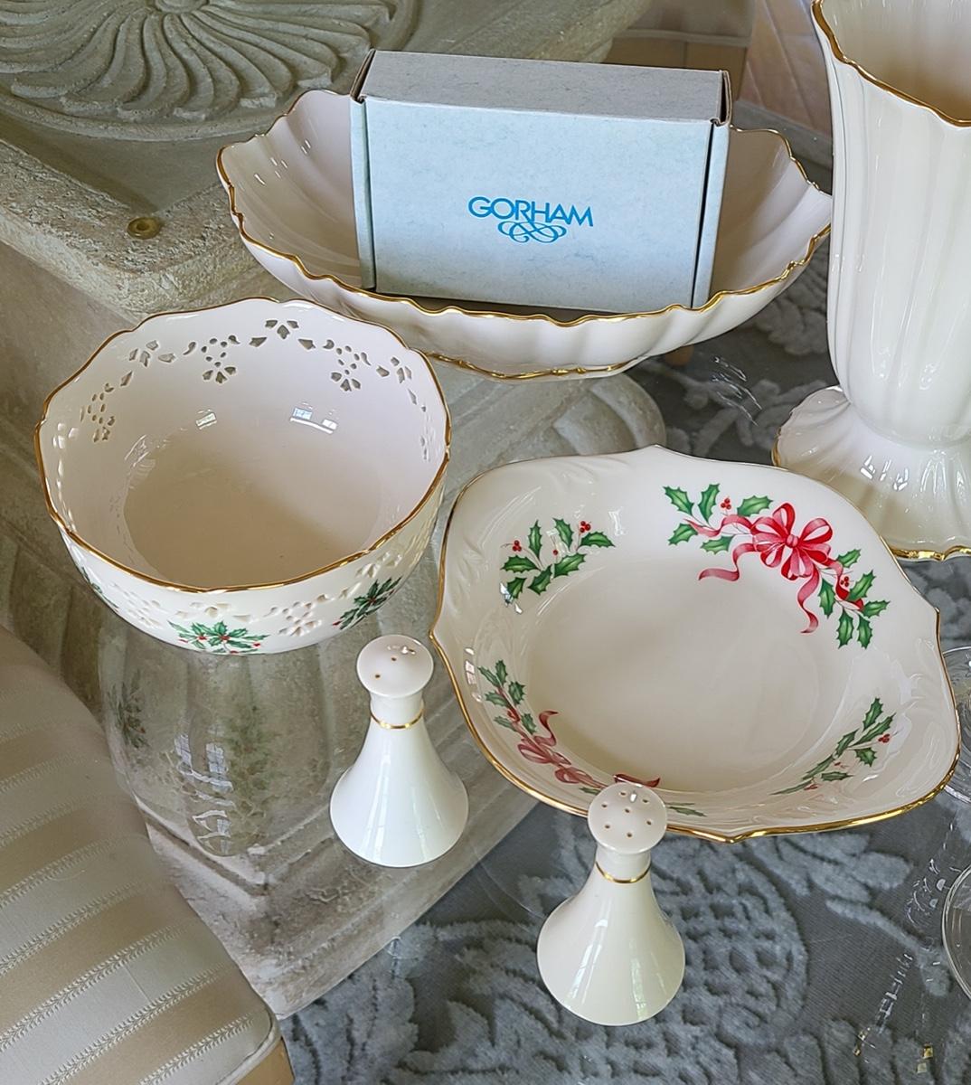 Nice lot of decorative setting pieces for the holidays, including Lenox Holiday, Lenox with elegant gold rim, gold rim cordials, salt and pepper set, and Gotham/Lenox napkin rings set of four. Please see all pictures for content of the lot, condition of the lot, and measurements if taken. Pictures are the best representation of the items listed and items are untested unless indicated in description. Thank you for looking and have fun bidding!