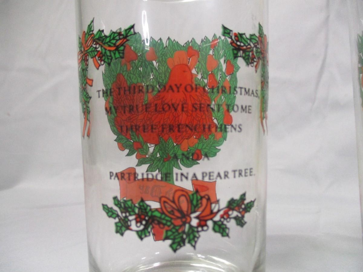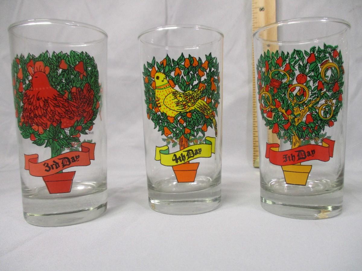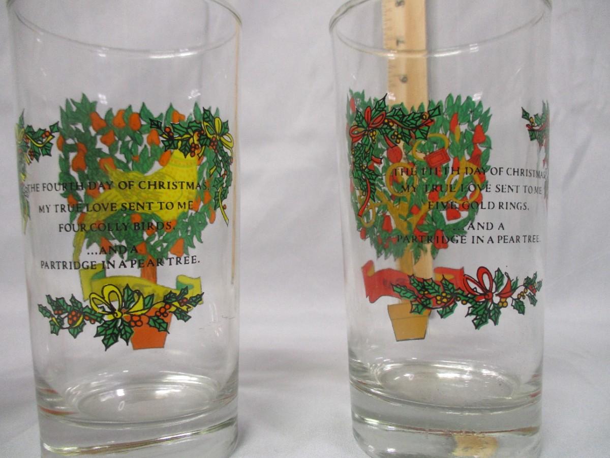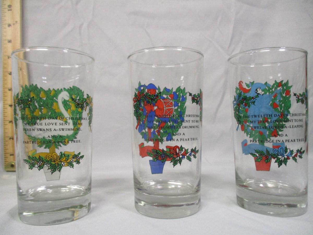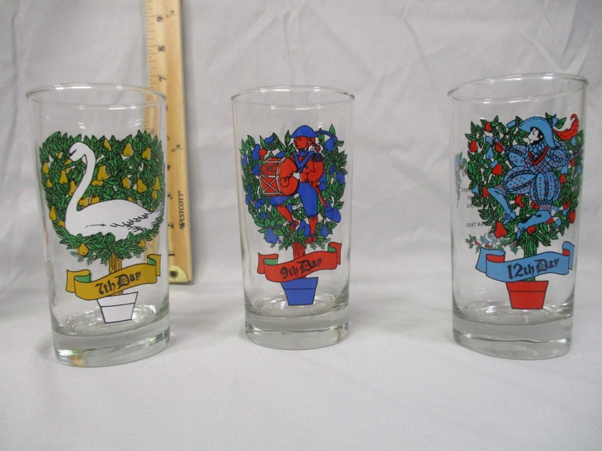 These Christmas glasses are for the 12 days of Chirstmas, but 1, 2, 6, 8, 10, and 11 are missing from this collection. All are in excellent condition.