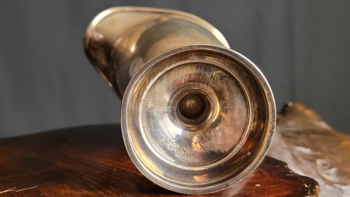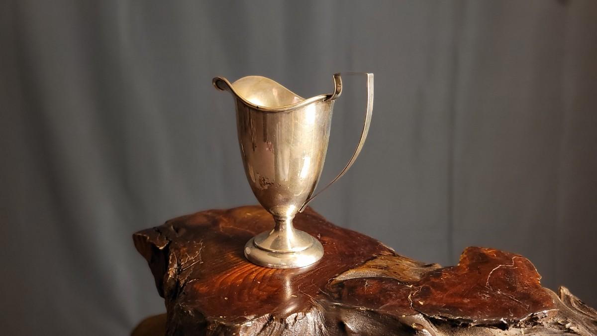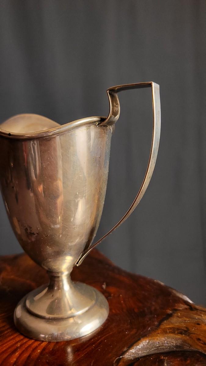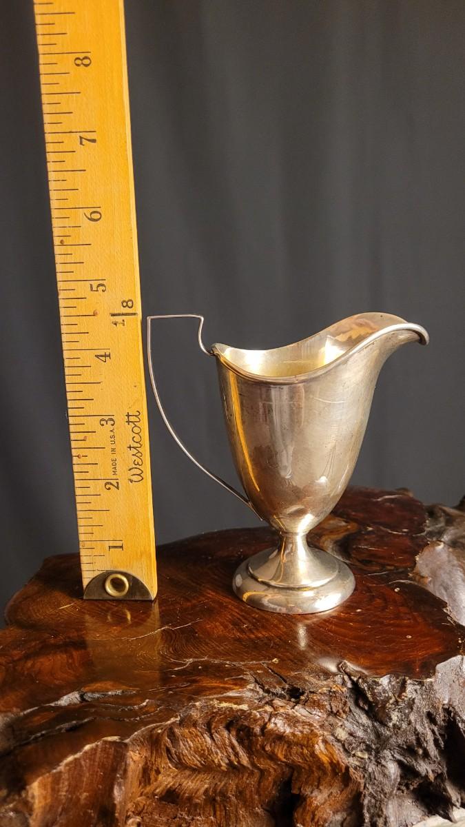 This Vintage Sterling Silver Creamer has a few dings (shown in photos) but is otherwise a nice example. Measures about 4.5 " Tall.