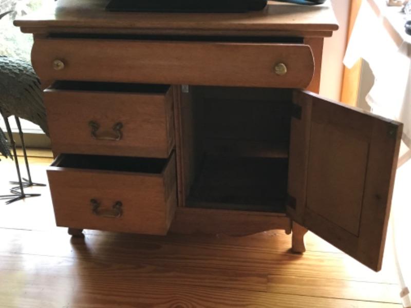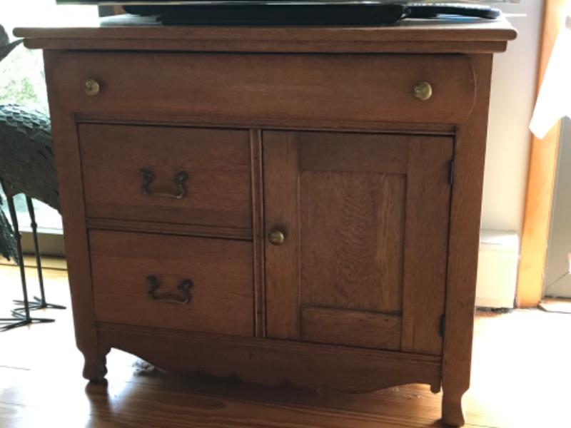 Oak Washstand with three drawers and a cabinet. Measures 2’5-1/2” high 2’10” wide and 1’7” deep.