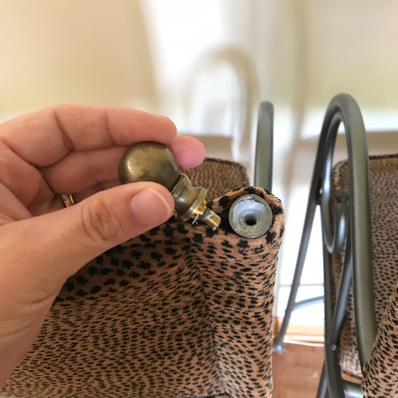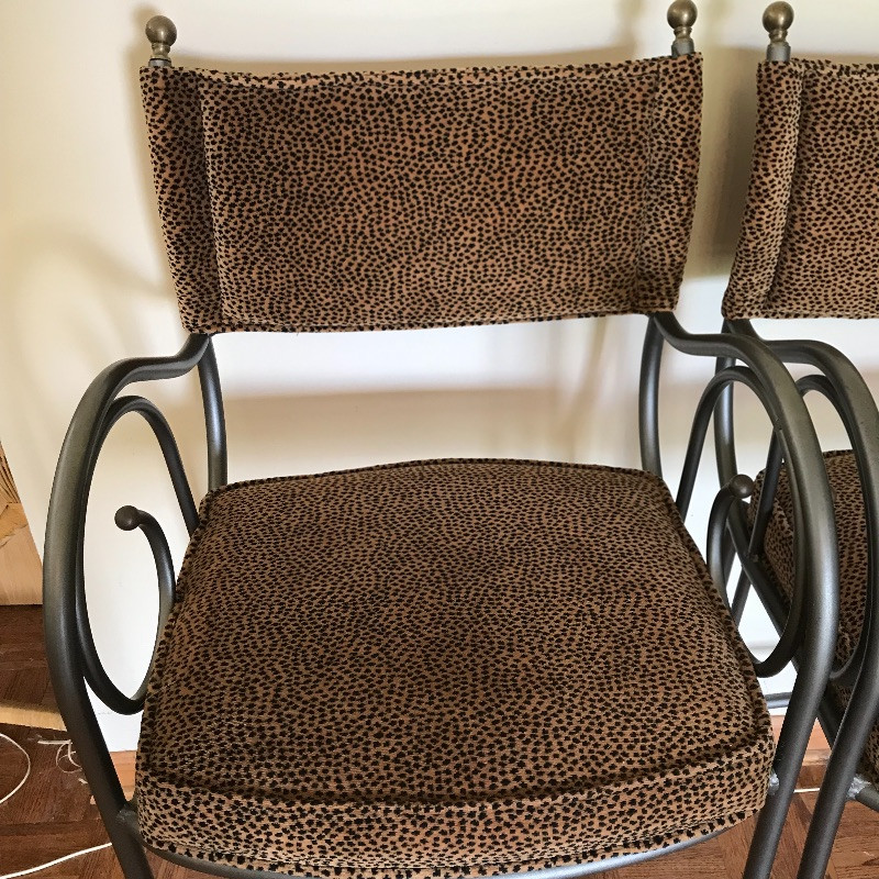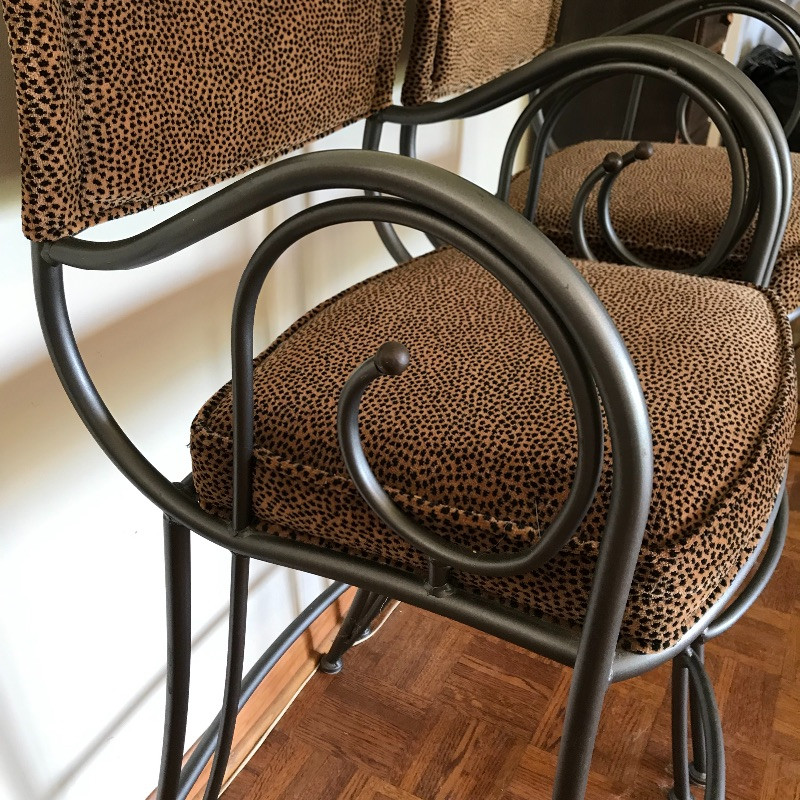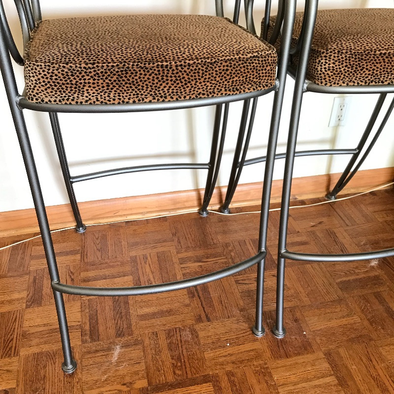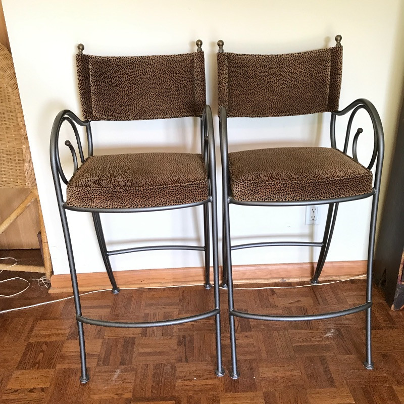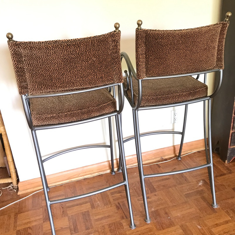 Fashionable animal print metal bar stools with slate colored metal, foot rest and comfortable seats. Stools are sturdy and have fun swirly arm rests. The ornamental bulb hardware on the high back seats need to be secured, but sit nicely if not tugged on. Seats measure approximately 19” x 17” x 44.5” with the seat cushion 29.5” off the floor.