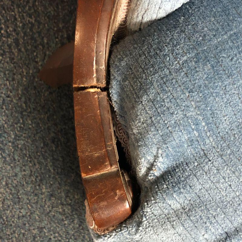 There is a spot of damage on the frame that I'm assuming could be repaired, but I don't know. Other than that, it is in excellent condition. It has a spring bottom and the upholstery is clean and not dated. It is 35.5" tall and the seat is 18" from the ground.