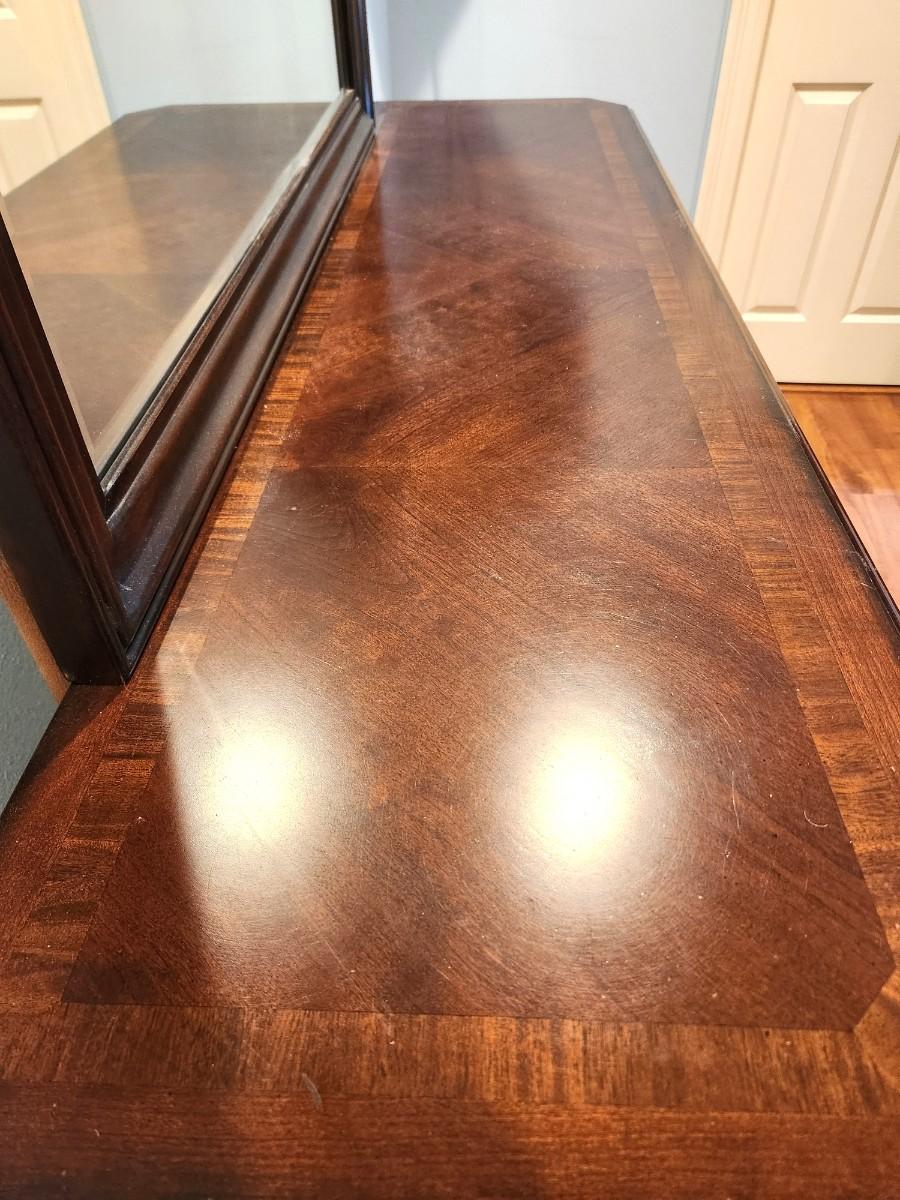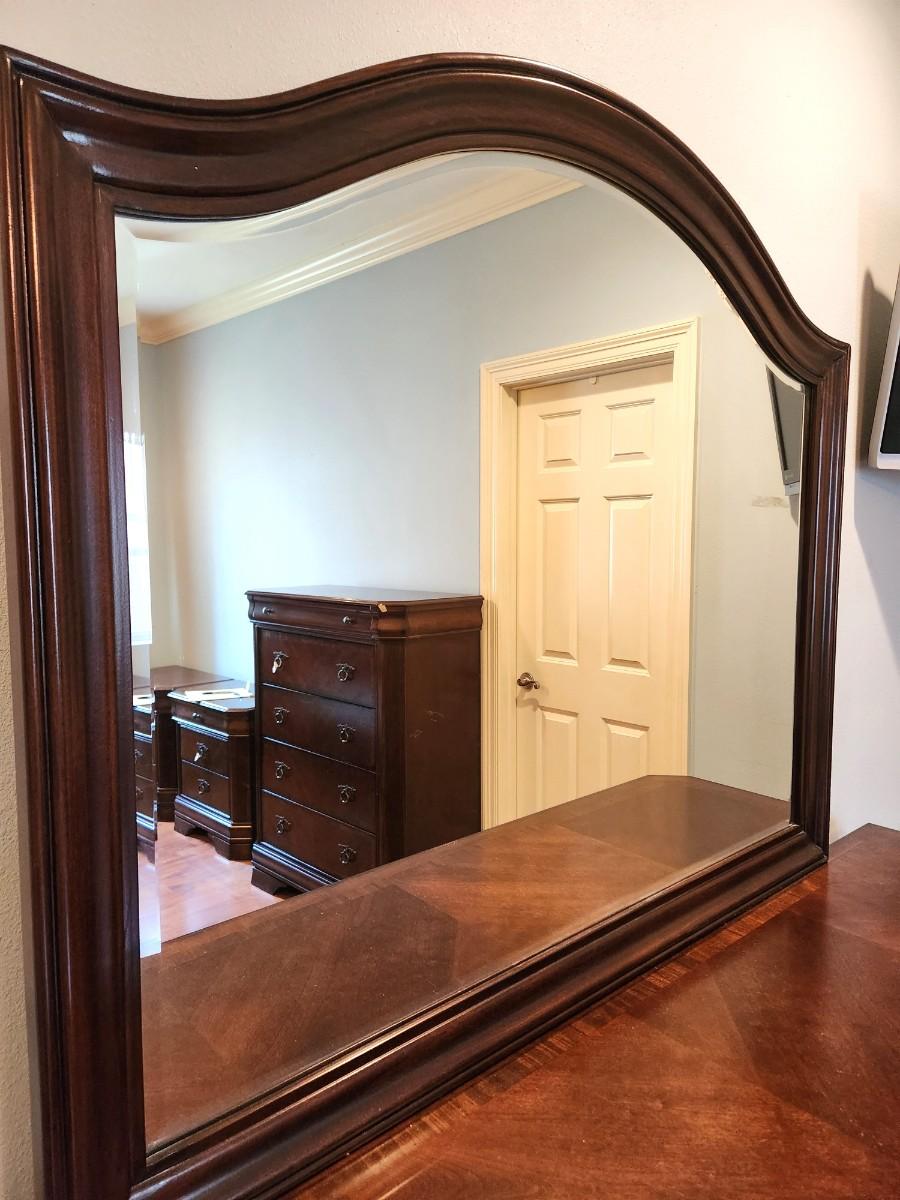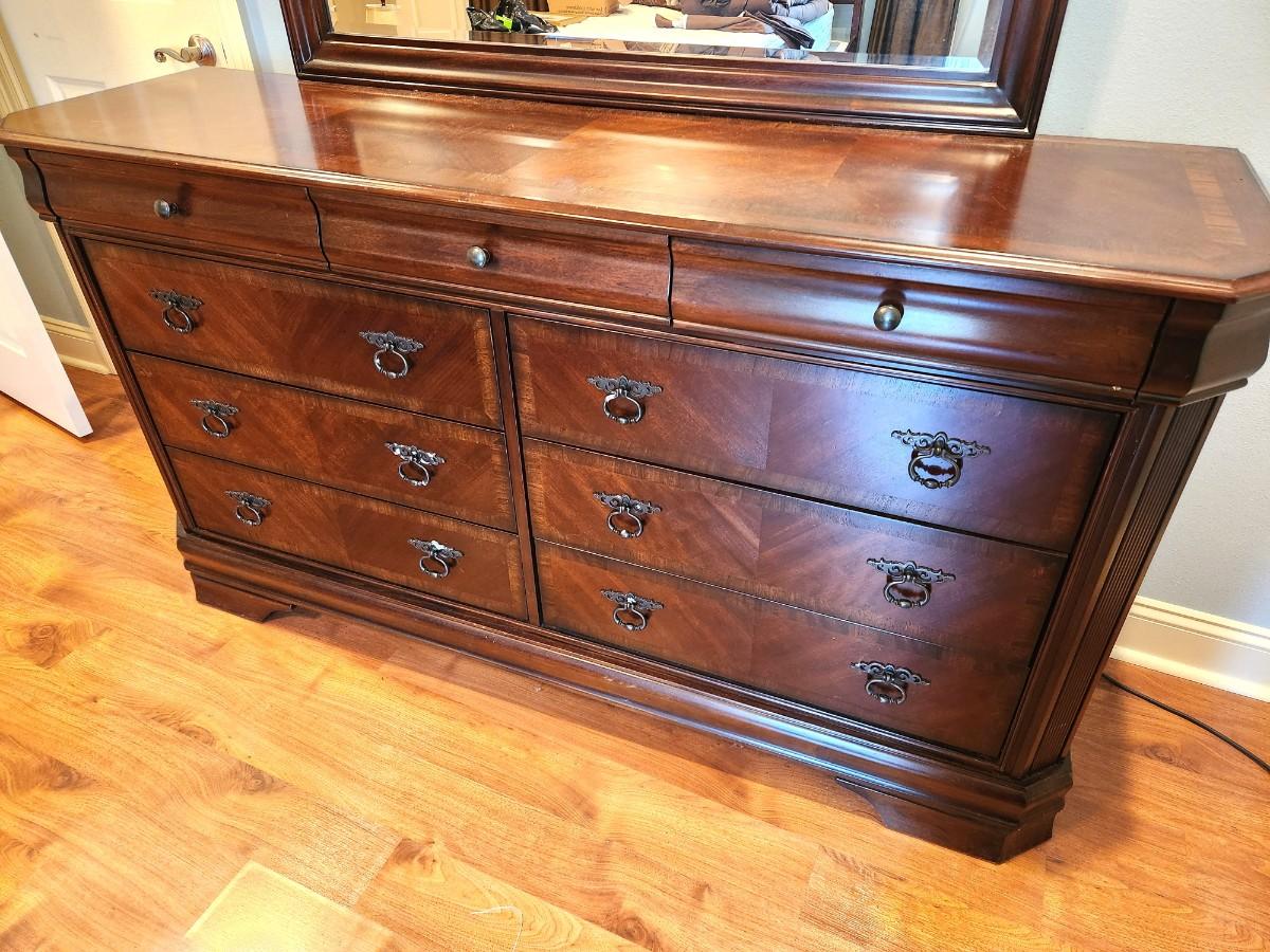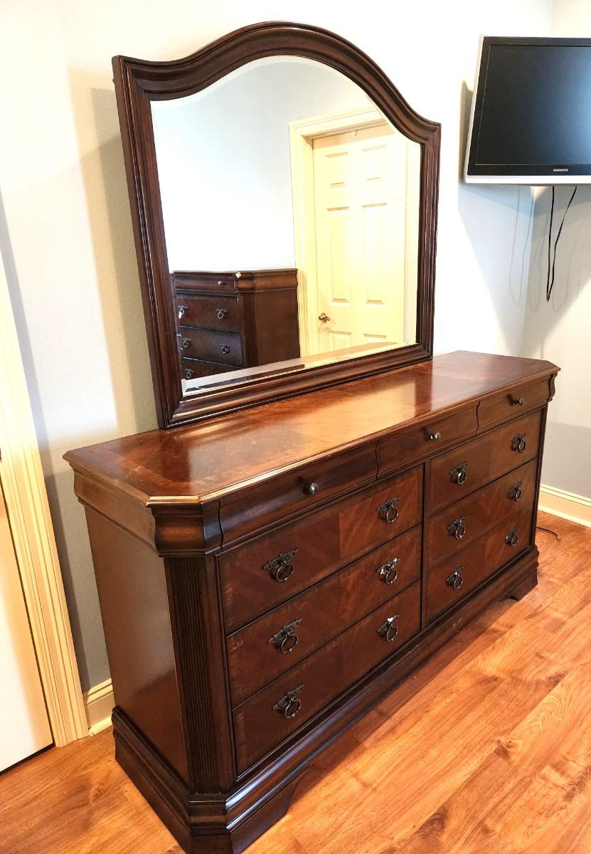Pretty Ashley Furniture Co. Traditional style bedroom dresser - mirrored w/beveled glass - 9 drawers, 40" across, 18" deep, 50.5" tall including mirror. Mirror can be removed. This piece is upstairs. Gently used condition.
