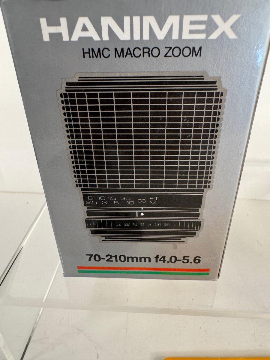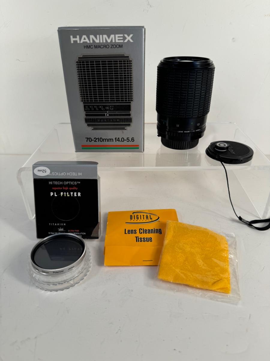 Includes Hanimex HMC Macro Zoom 70 - 210mm lens, Hi Tech Optics PL Filter titanium ultra thin high resolution multi-coated filter and lens cleaning tissue.