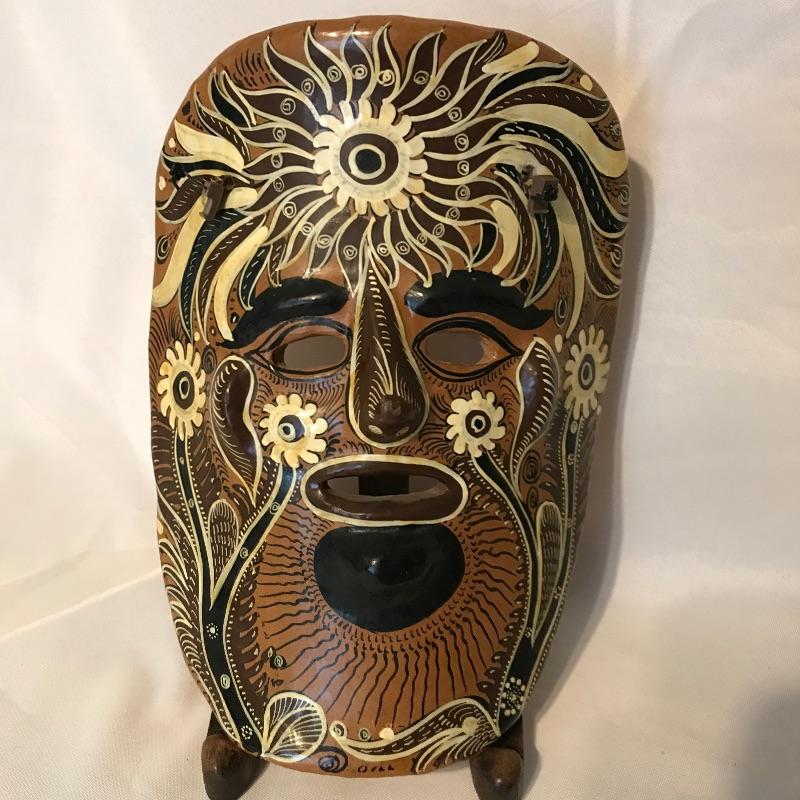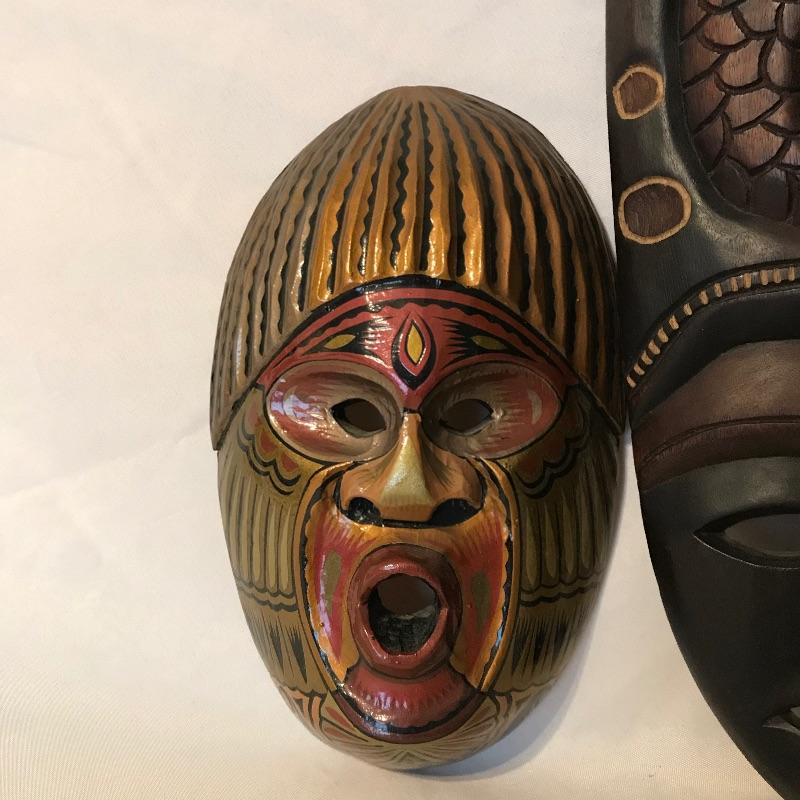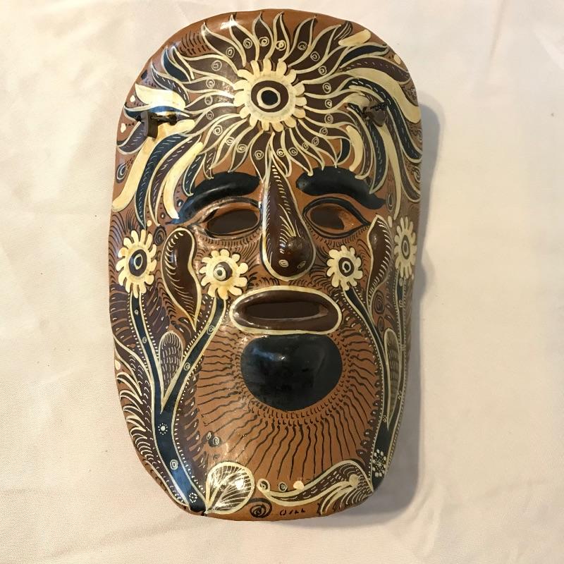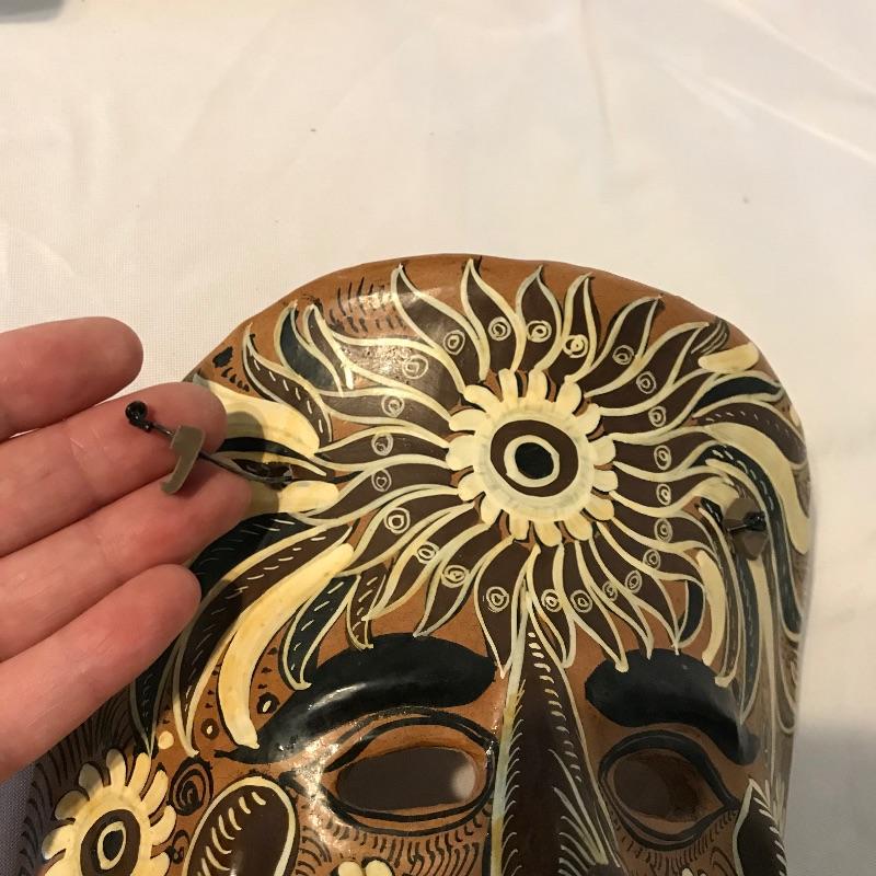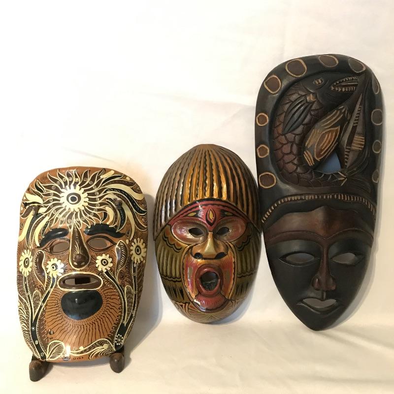Awesome 3 piece collection of folk and traditional masks. Lot features a ceramic mask that appears to be traditional Mexican style folk art and carries a hefty price tag on the back. The other two are carved from a lightweight wood-like material with metal in place for mounting on a wall. All three appear to be easy to hang, the ceramic has wire and safety plastic already attached. All three masks have hollow eyes and mouths, the ceramic is placed on a stand in the first image, stand is not included. The largest mask measures approximately 6.25” x 15” Shipping available.