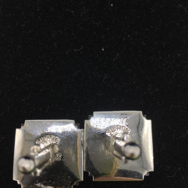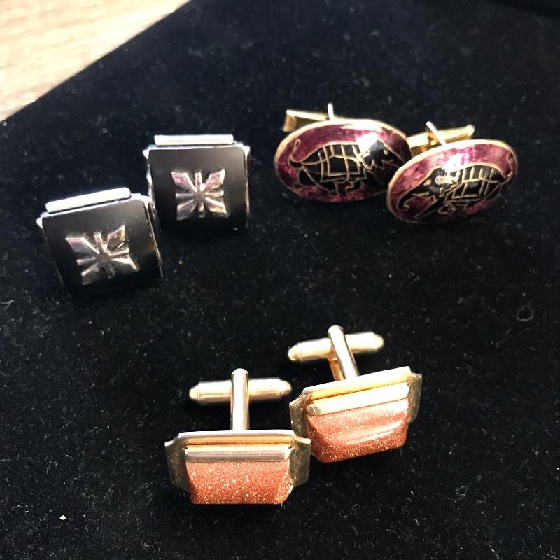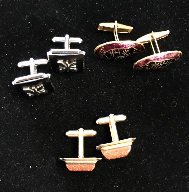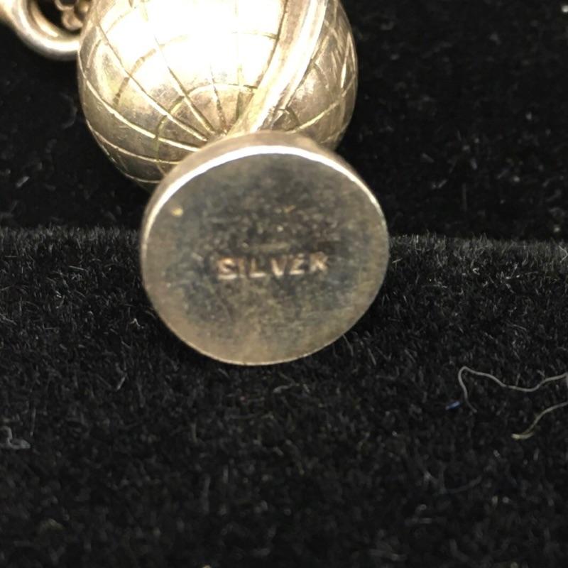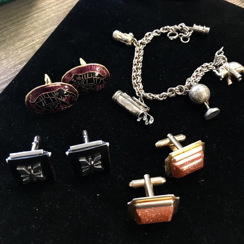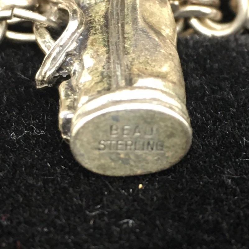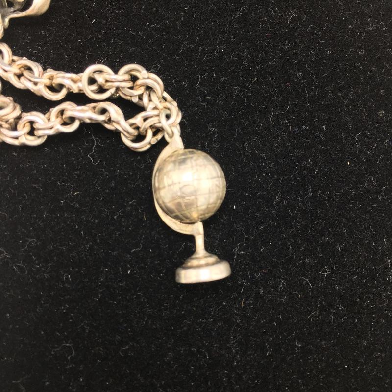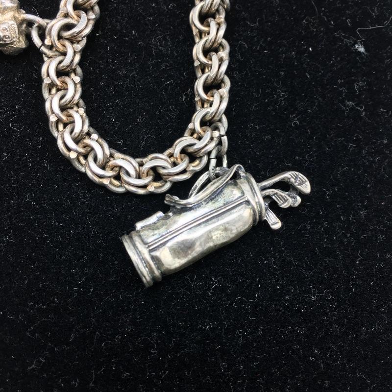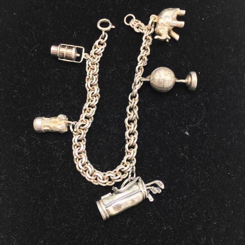 Lot includes a silver charm bracelet that is marked with what appears to be 900 with five charms. Photos show markings on each pendant. Globe is marked silver, golf bag is marked sterling and the other three are unmarked. Lot also includes three sets of cuff links with one marked Swank. Bracelet measures 7”.