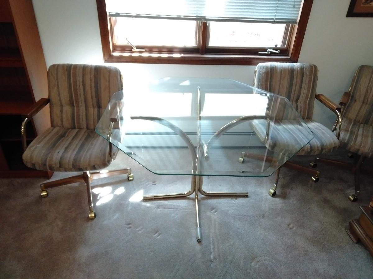 GLASS TOPPED BRASS FRAME CHROME CRAFT DINING ROOM TABLE AND 4 MATCHING CLOTH CHAIRS ON CASTERS 28" X 46" X 46"