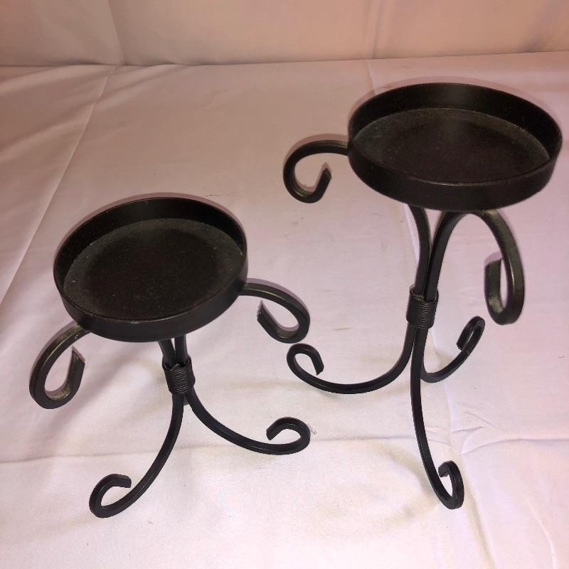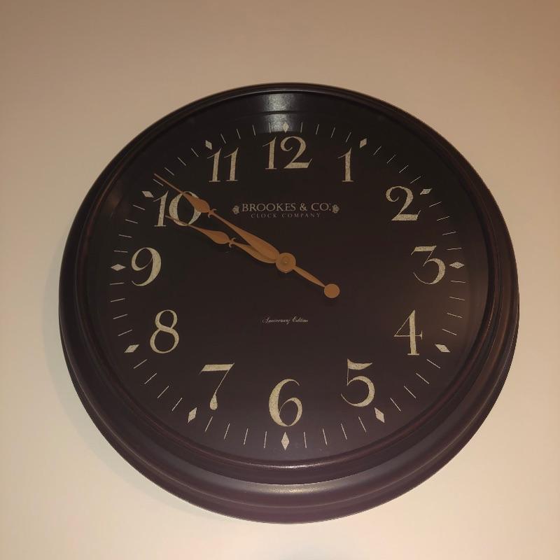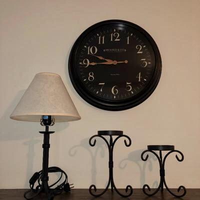 Timeless decor for any home or office. This lot includes a Brookes & Co. Anniversary Edition battery operated Clock, a lamp, and two metal candle holders. These pieces add class to any space. Clock measures 18” in diameter and lamp measures 19” tall. Clock worked when tested.