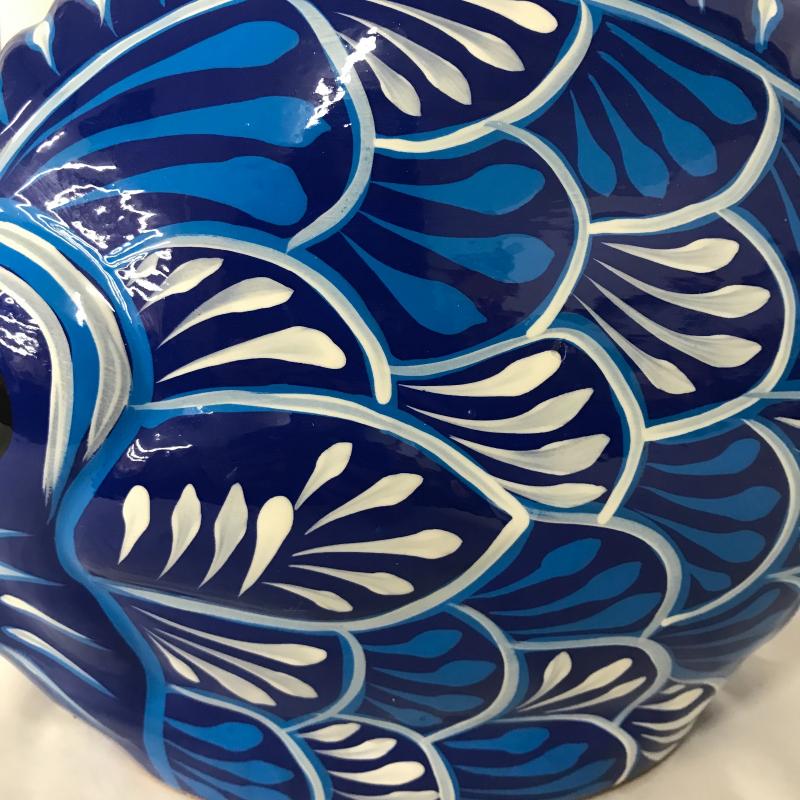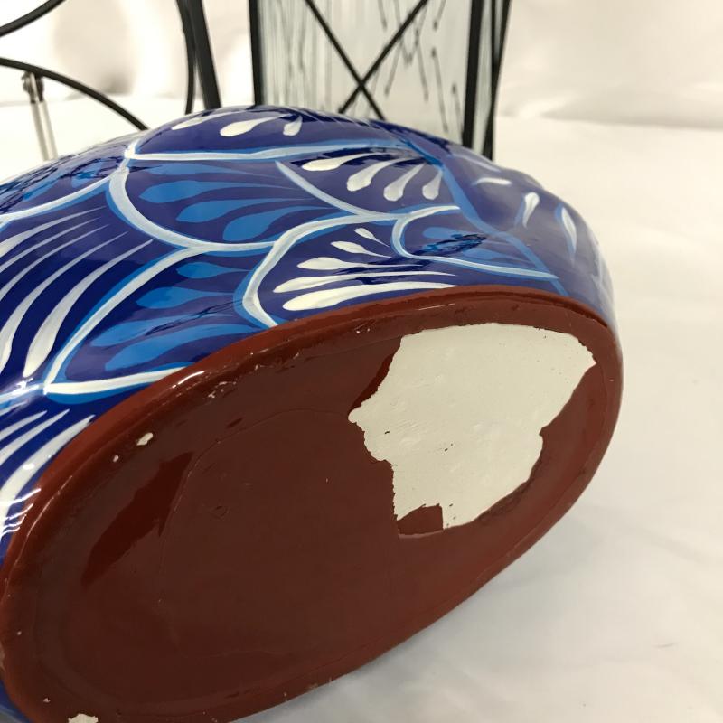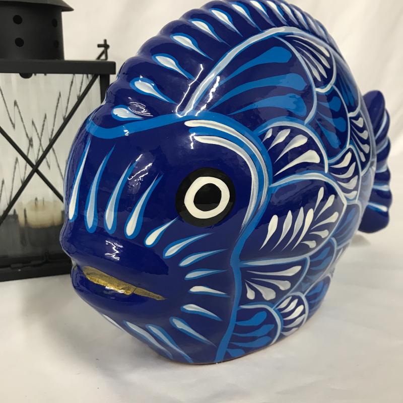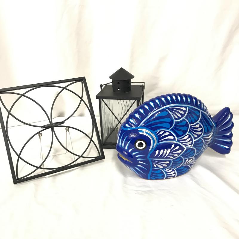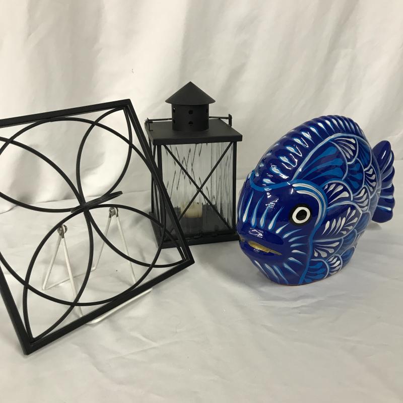 This bright blue ceramic fish will add whimsy to your summer decor. 14”x 5” x 9”h. Lot also includes metal lantern and candle/flower holder. Local pick up only in Maggie Valley.
