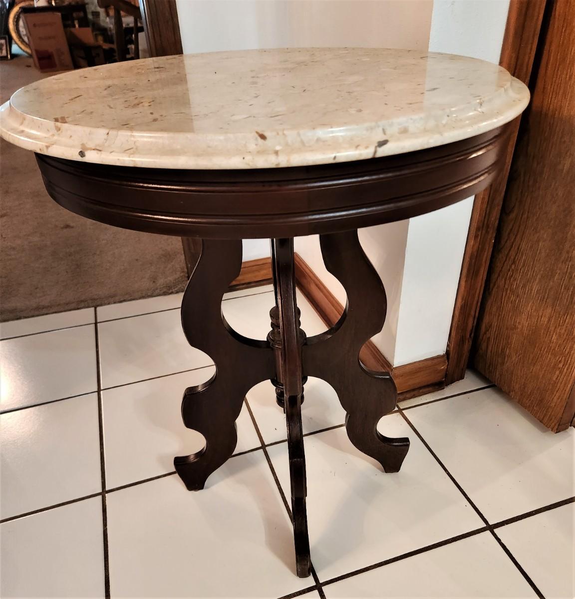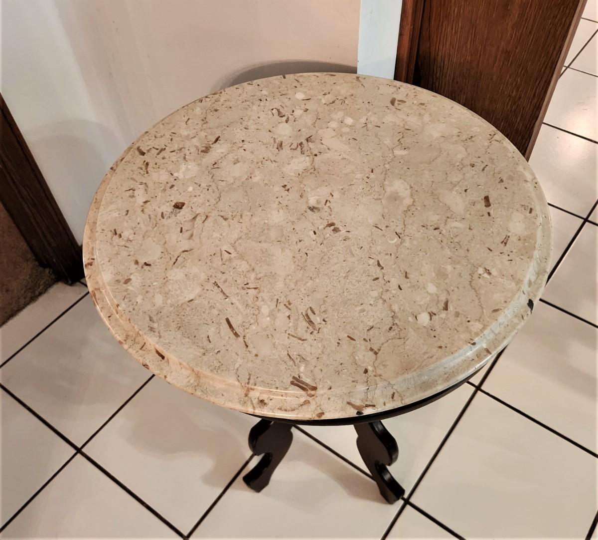 Contemporary reproduction of an antique marble topped side table. 22" across - 25.5" tall. No maker noted. Good condition. There will be a matching one later in the sale.