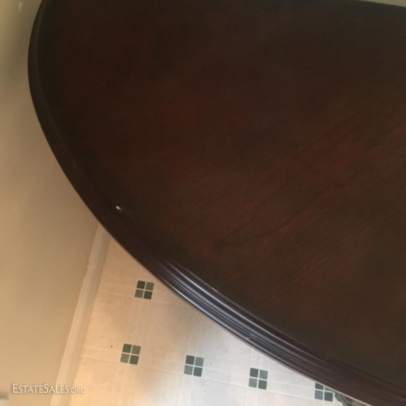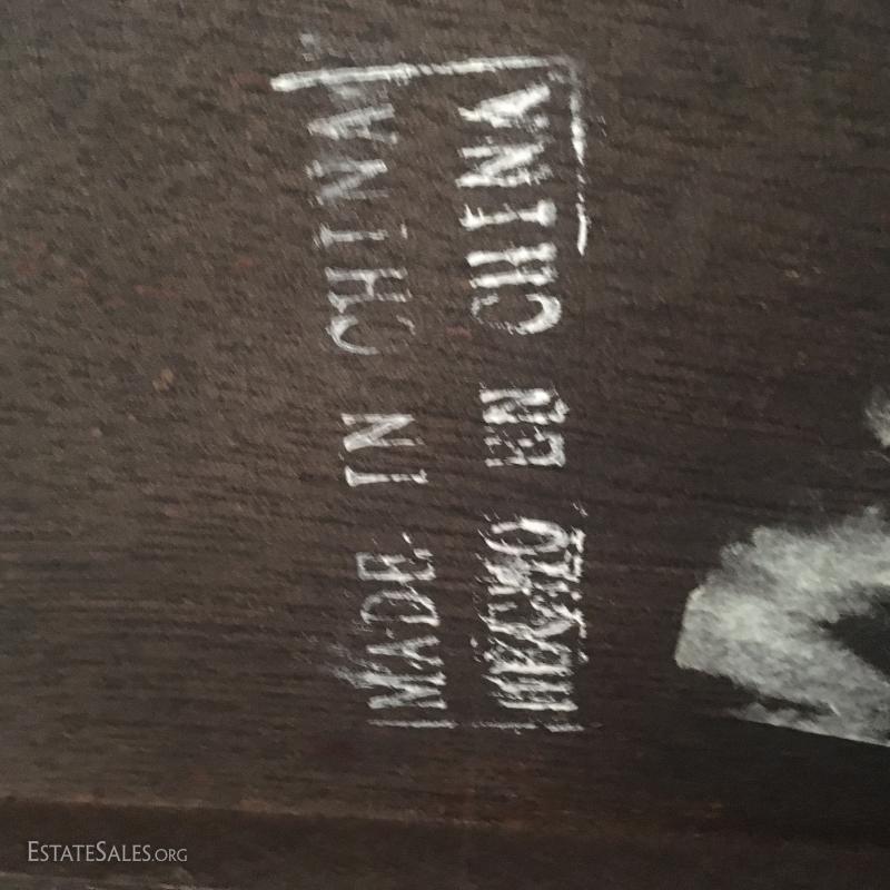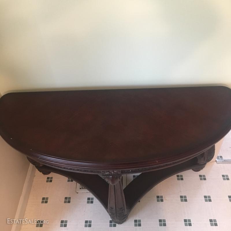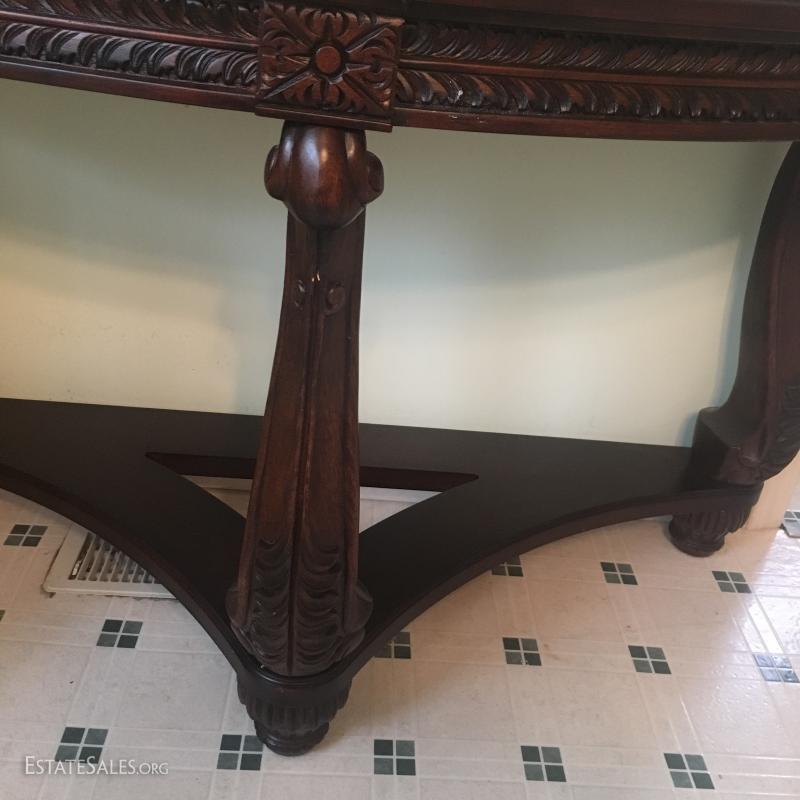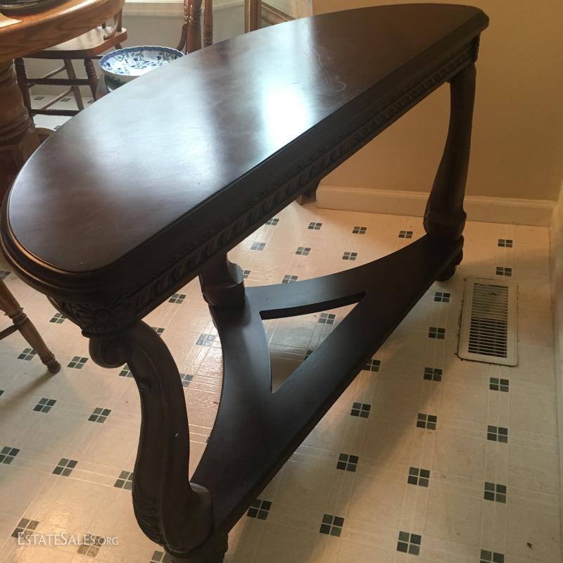 Dark wood finished table made in China, with detailed edges and legs. Very few scratches or marks. Item measures 50" x 20" x2 9.5". This lot is available for local pick up in Mills River, NC only.