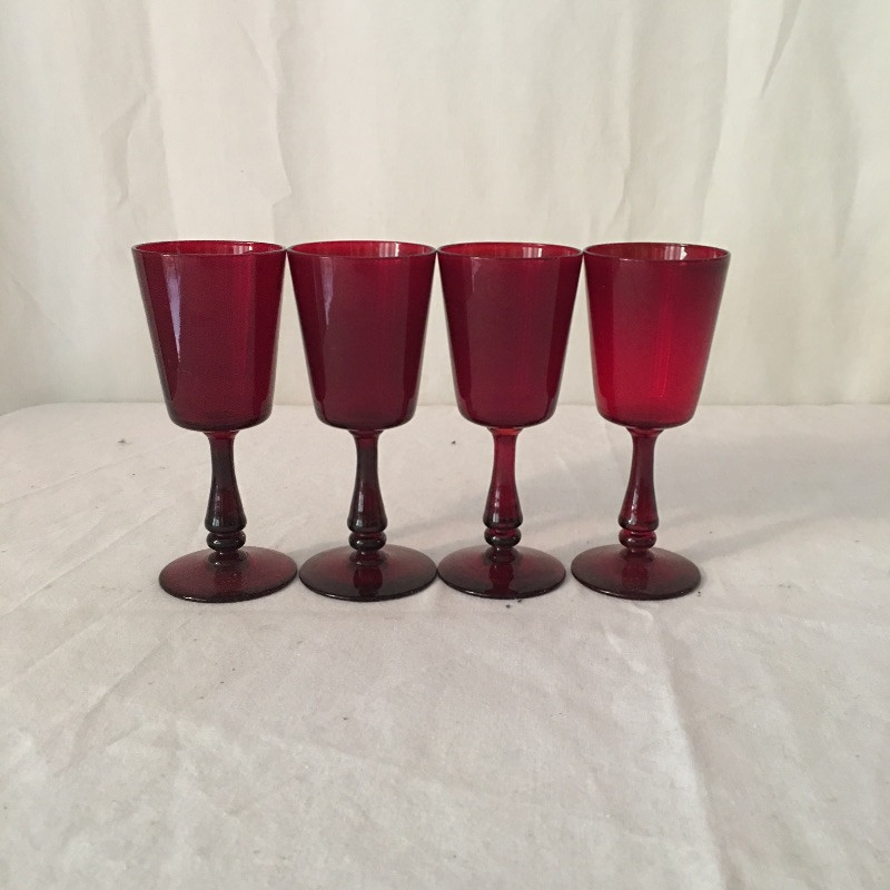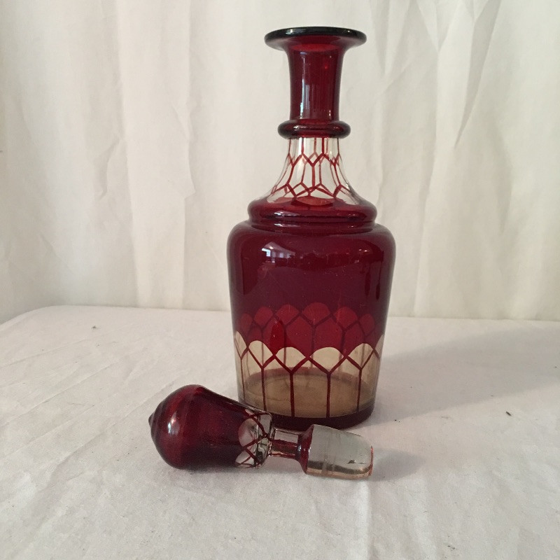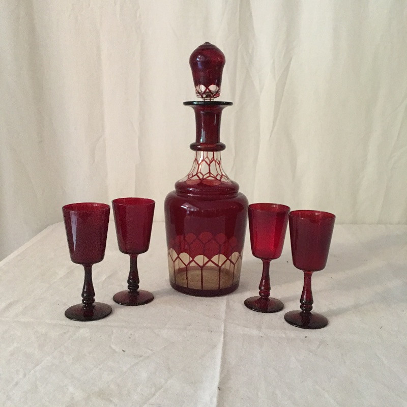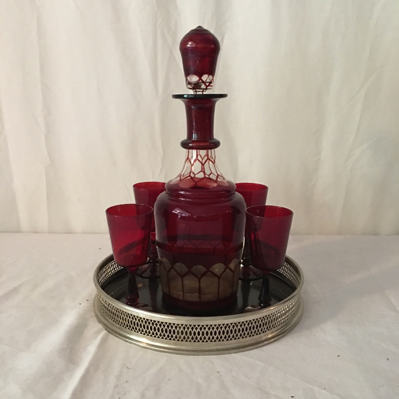 This stunning Art Deco inspired ruby red glass decanter is a real treasure and will look amazing displayed on your bar or in any space. The decanter has some clear glass design elements on the lower third and on the neck and has a matching red and clear glass stopper. Also included are 4 small matching 5” cordial glasses Comes with a silver tray with black Formica . Decanter measures 3.75” D x 13” tall.
