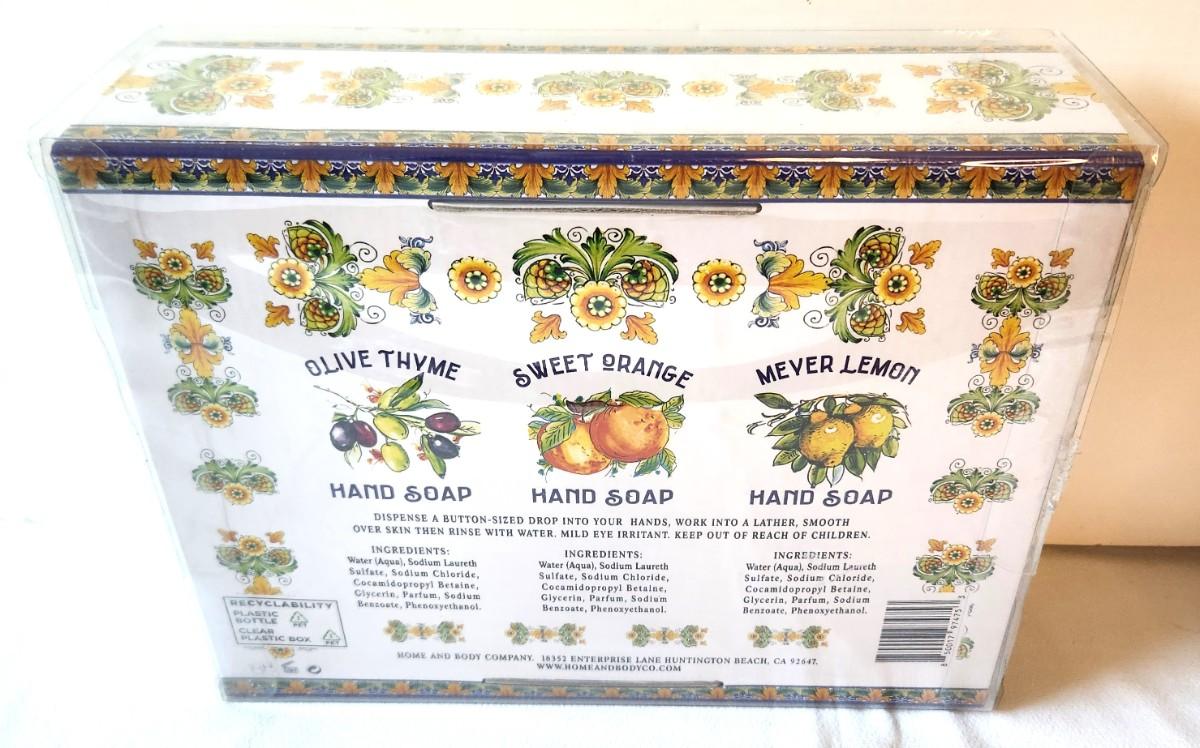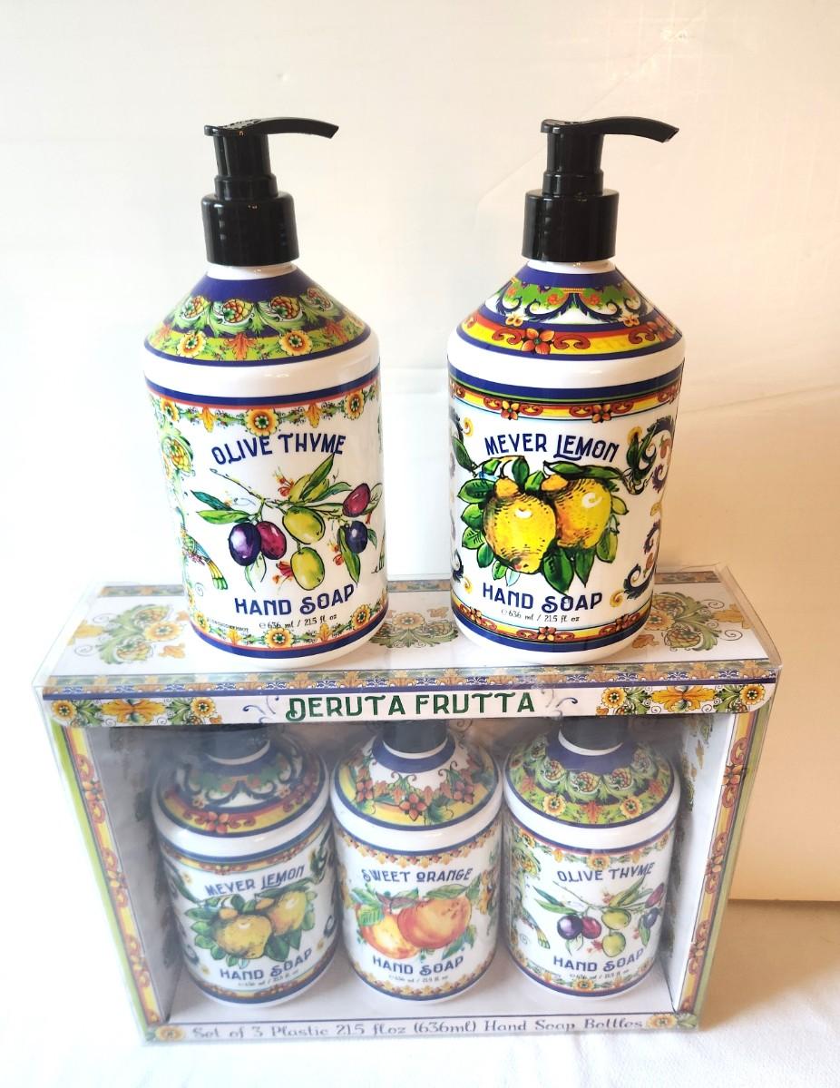 You get all you see here - box of 3 Deruta Frutta luxury hand soaps in in package - Meyer Lemon, Sweet Orange, and Olive Thyme, along with 2 unused extras - 1 Meyer Lemon, 2 Olive Thyme. These make great gifts. Each is a generous 21.5 ounces.
