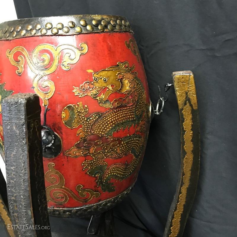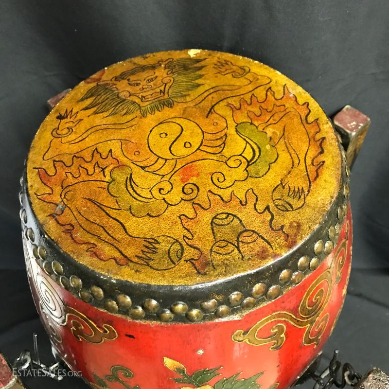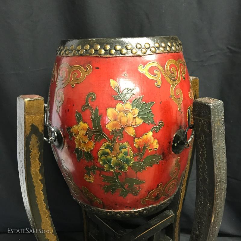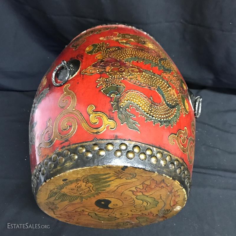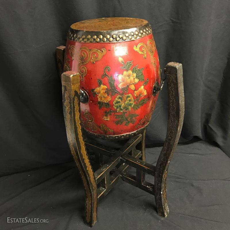 Two-sided drum on display stand. Hangs on four hooks. Stand folds away if not needed. One leg on stand has lost some of its color and has some glue residue. Drum is 13.5" tall by 13" wide at widest part. Can sit on its own. When on stand it is 26" tall by 17" wide. Shipping available or local pick up in Waynesville, NC.