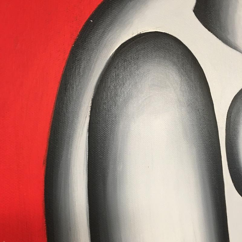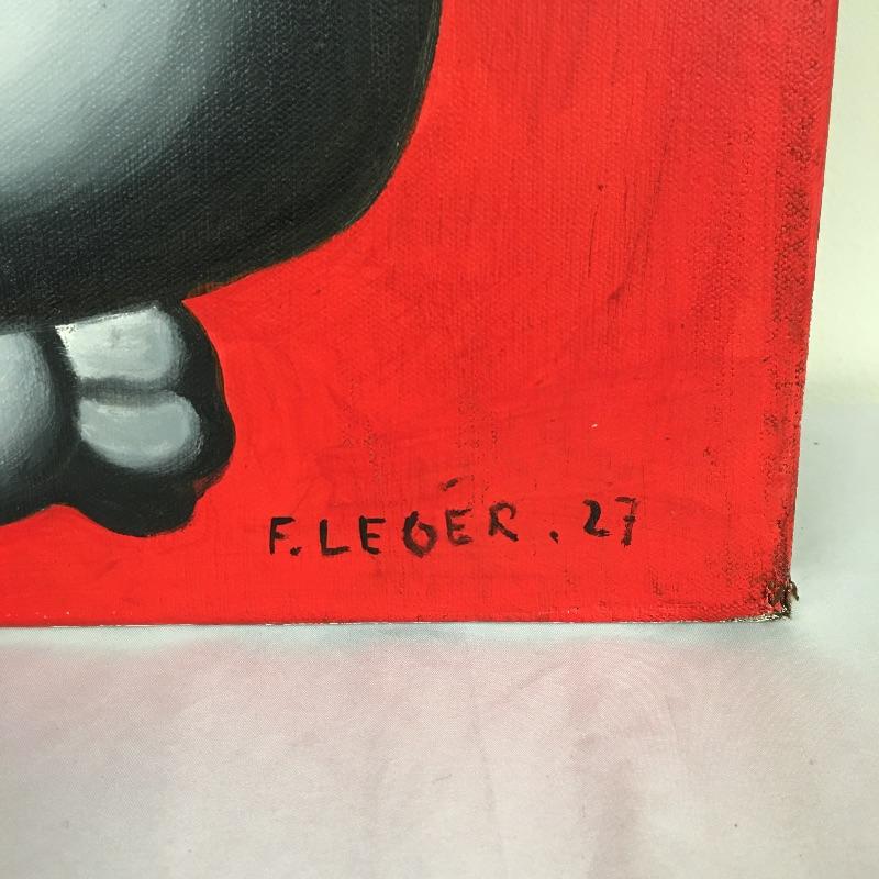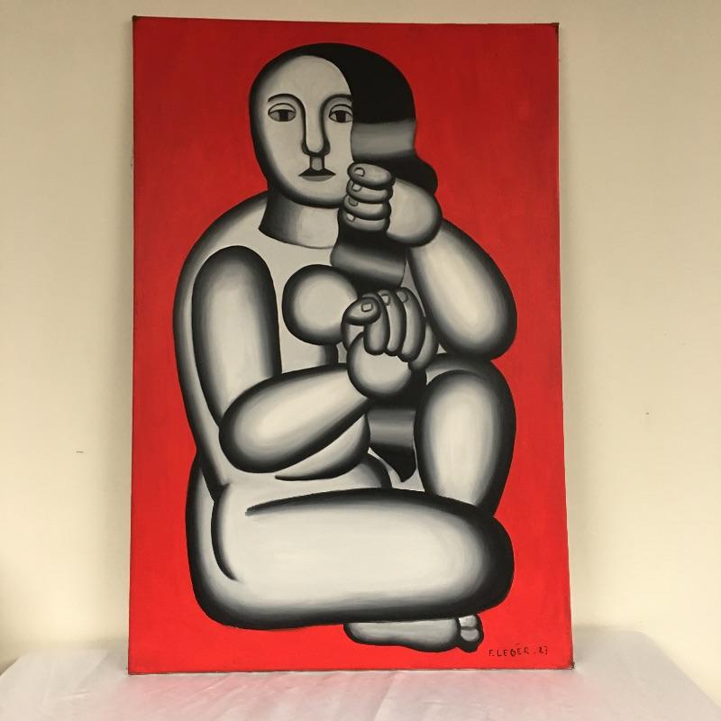 This large painting is done in the style of Fernand Leger. It is acrylic on canvas painting and measures 24” x 36”.
