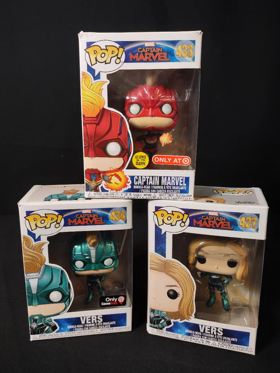 3 Brand New in Box Funko Pop: Cpt. Marvel #433 Target Exclusive, Vers #434 Gamestop exclusive, & Vers #427.Please see all pictures as they are the best representation of the items. The pictures show condition, measurements if taken, and what is included in the lot. Due to the large amount that we photograph and the time frame, we are not always able to take measurements. All items unless noted, are pre-owned and have been used. If you purchased furniture, you must bring help. We do not allow one person to carry large furniture out on their own. Bring help, tools and a truck for the safety of our client’s homes, and your personal safety. Company policy. Thank you.