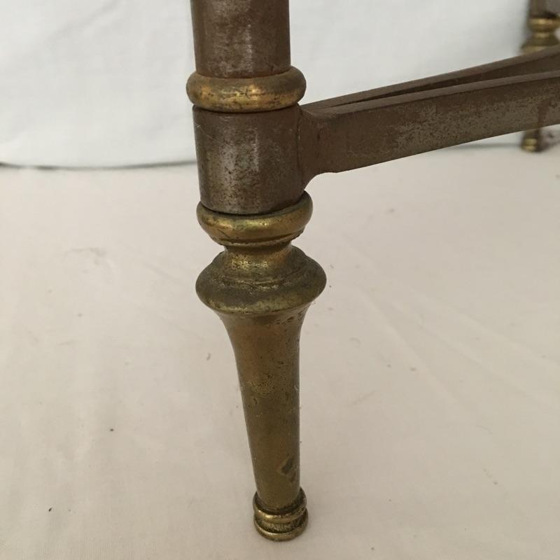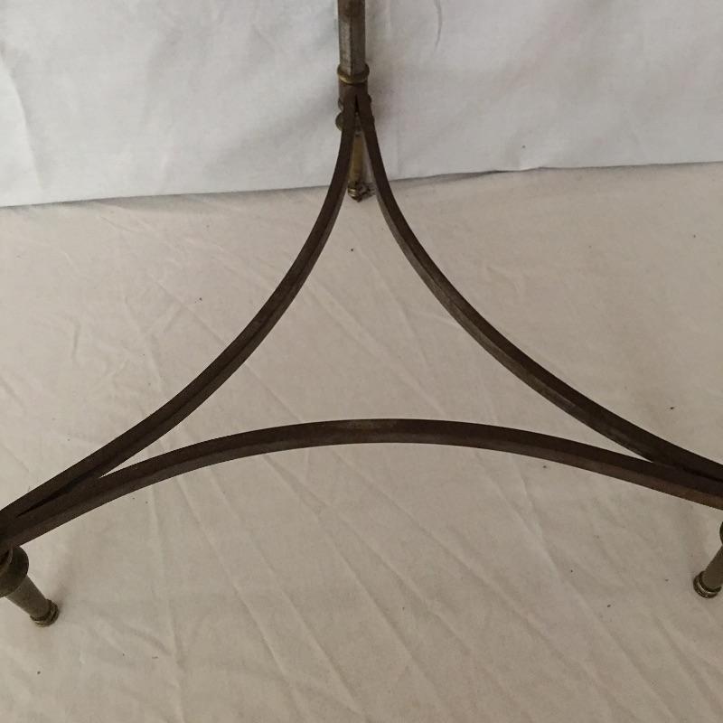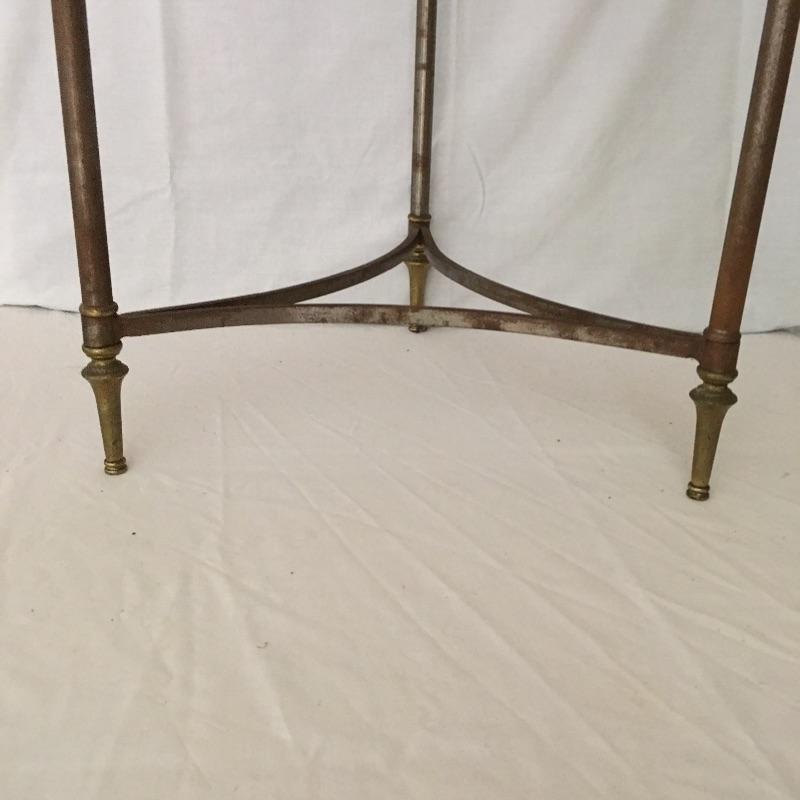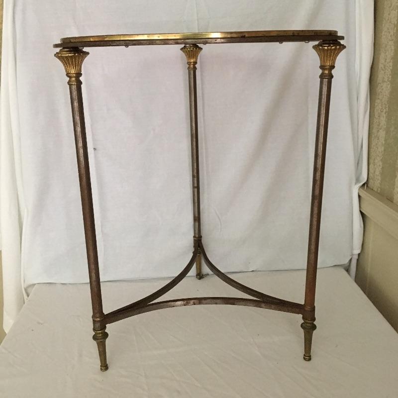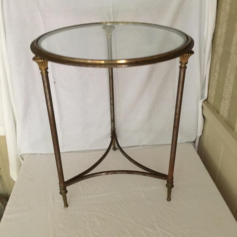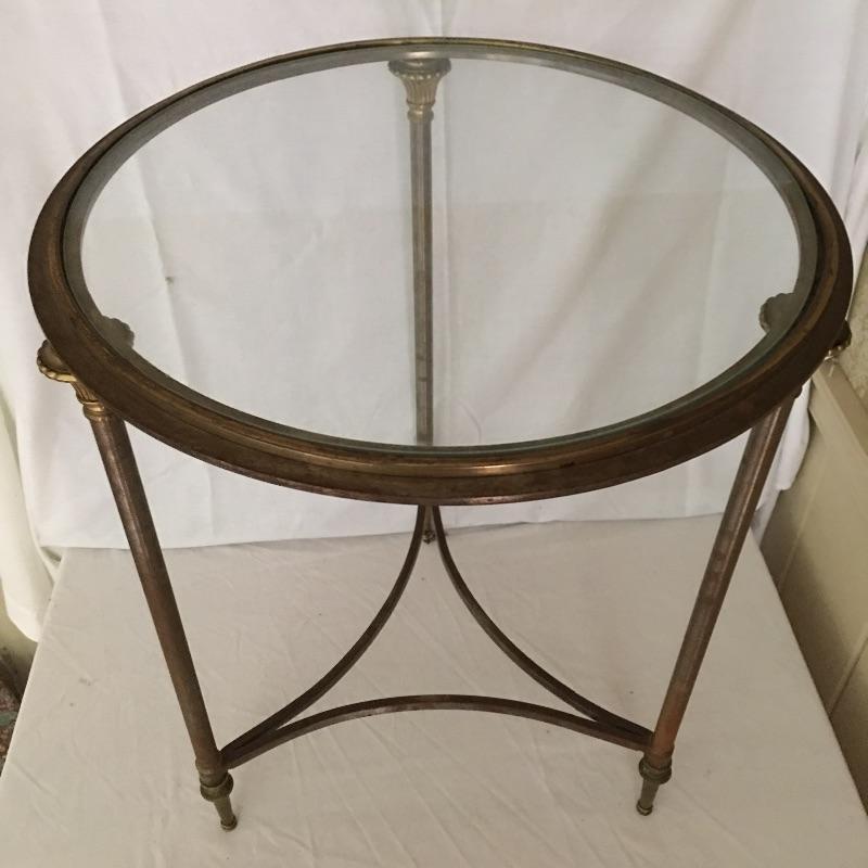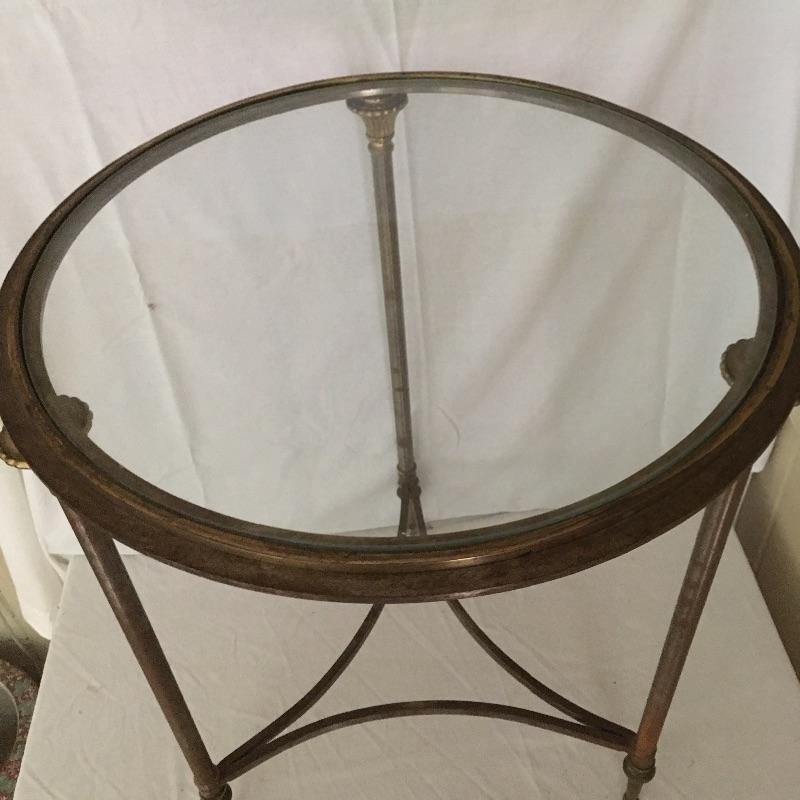 Unique glass top metal side table. A great piece for your loft or industrial setting. Table measures 20”D x 24.5” tall.