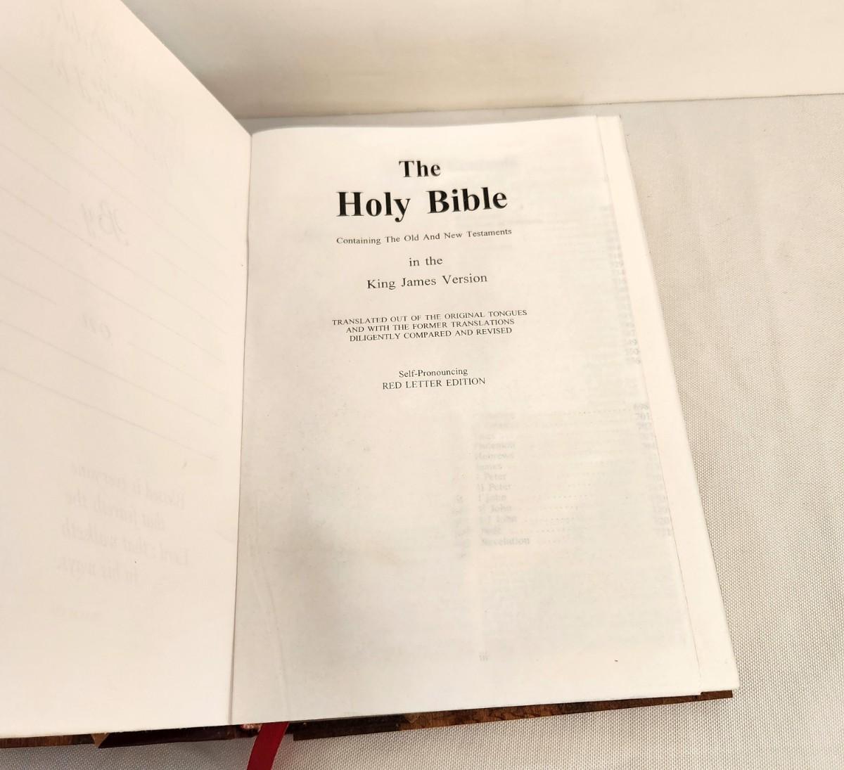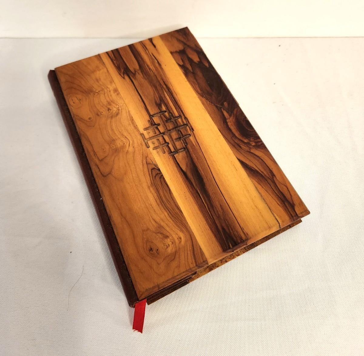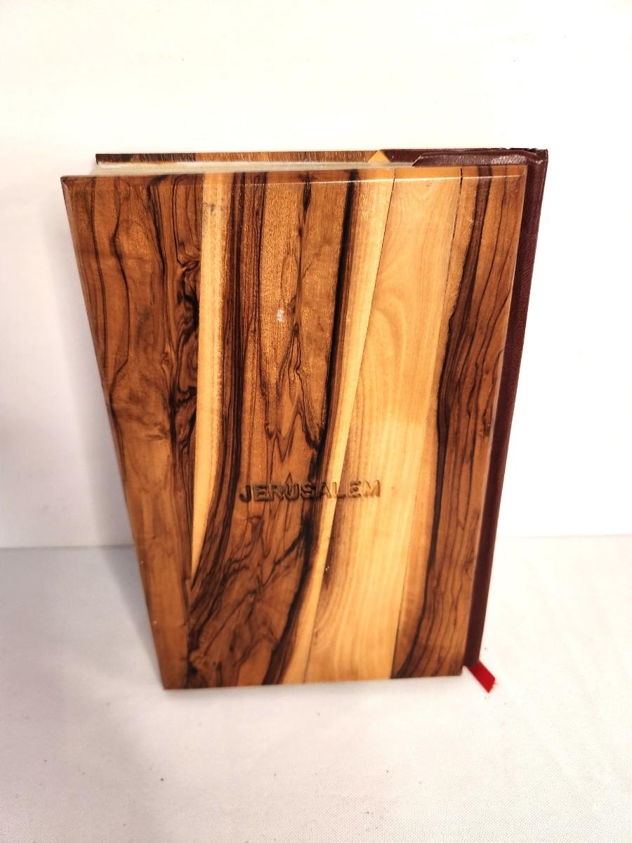 Made in Jerusalem, with Jerusalem Cross carved on the front - Holy Bible, red letter edition - 8" tall, 5.5" across. Good condition.