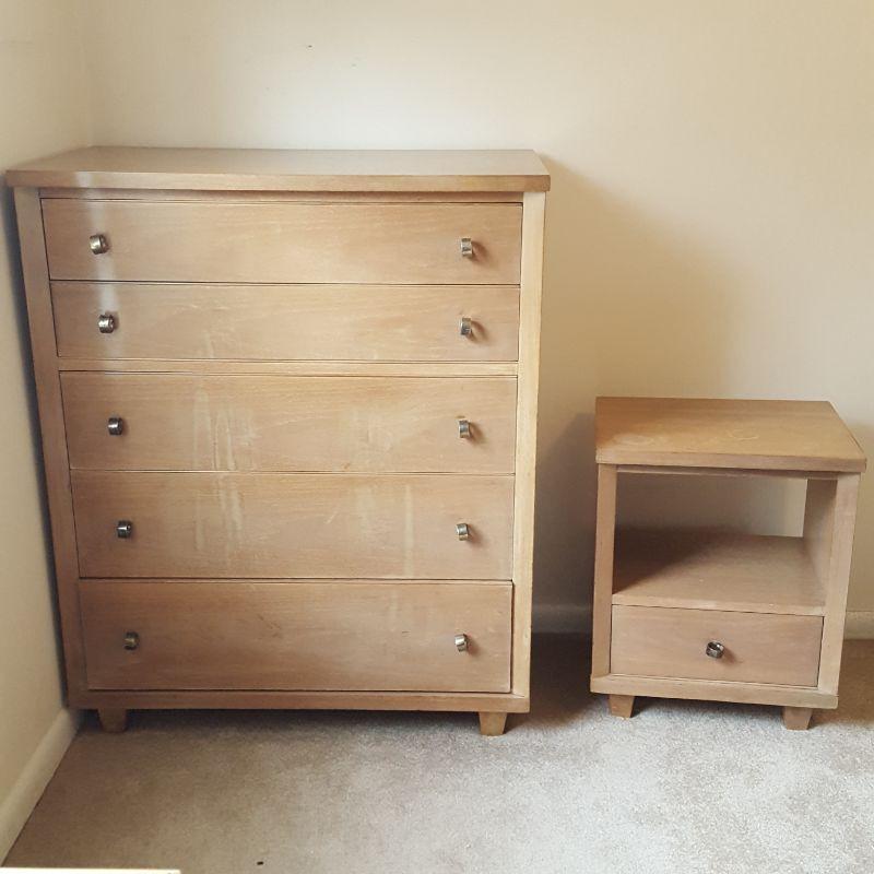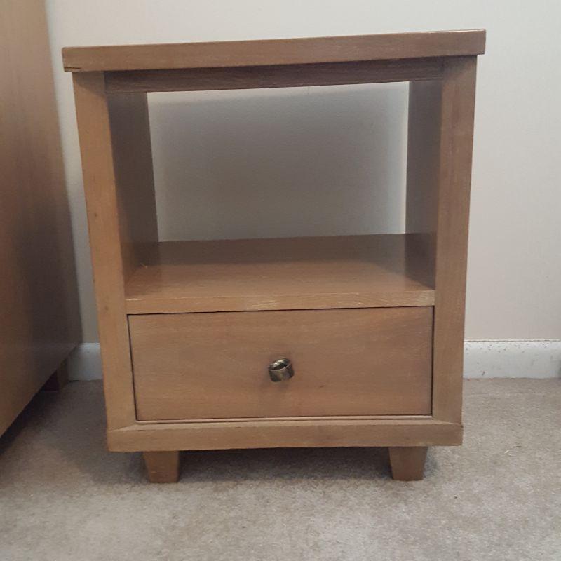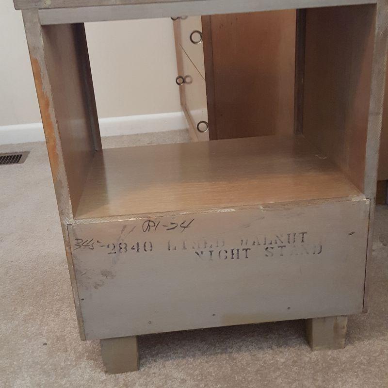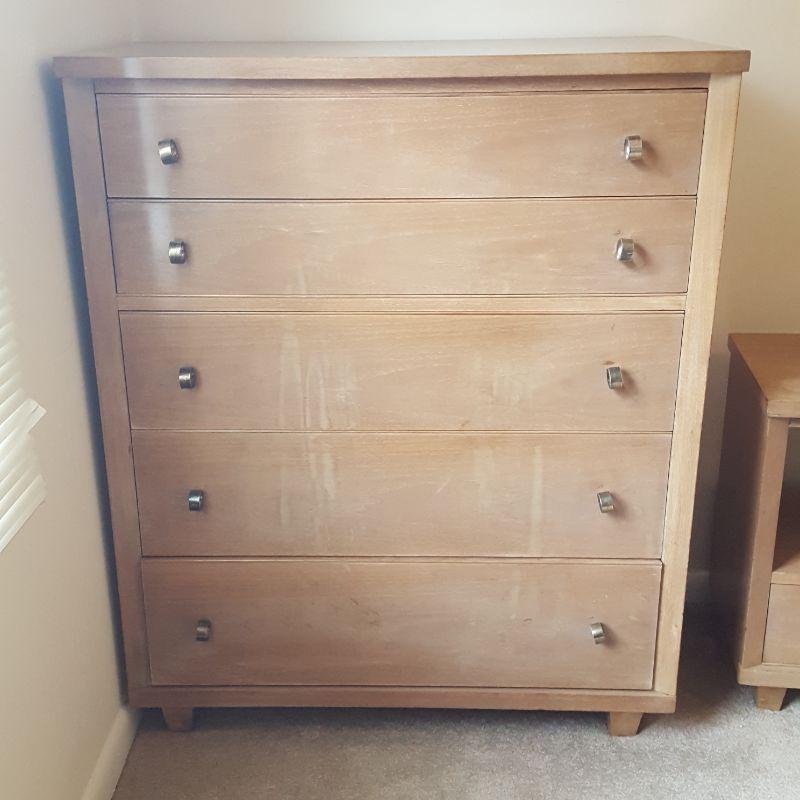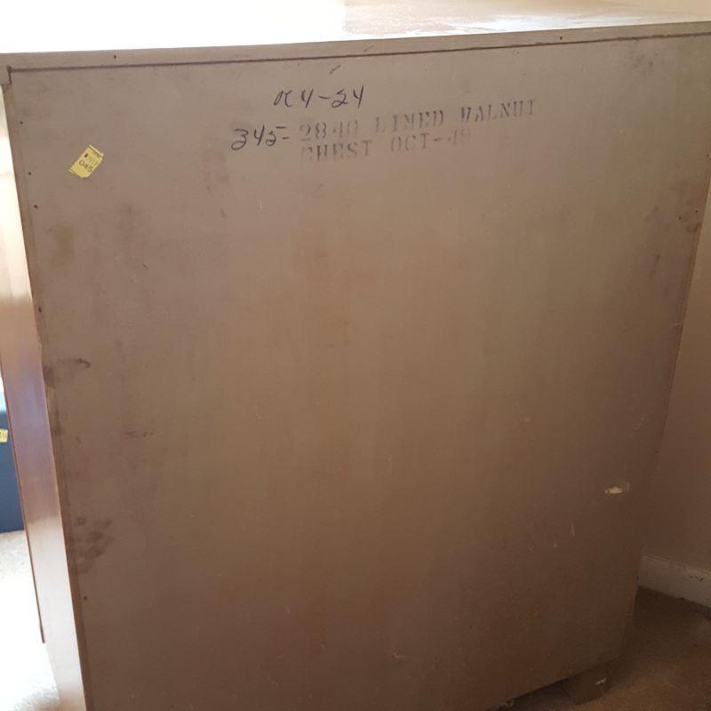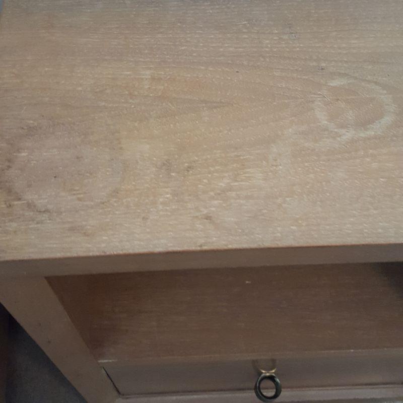 This lot includes a matching side table and tall dresser. Both items have some wear, but will last a lifetime! The side table measures 20x15x25 inches. The top has some glass ring stains that you can refinish or put a dowlie on...brand new! The tall dresser also has some wear on the top, but specifically on the front, that look like water stains. The tall dresser stands 38x20x46.5 inches. Reference lot 5 for other matching items. Local pick up only.