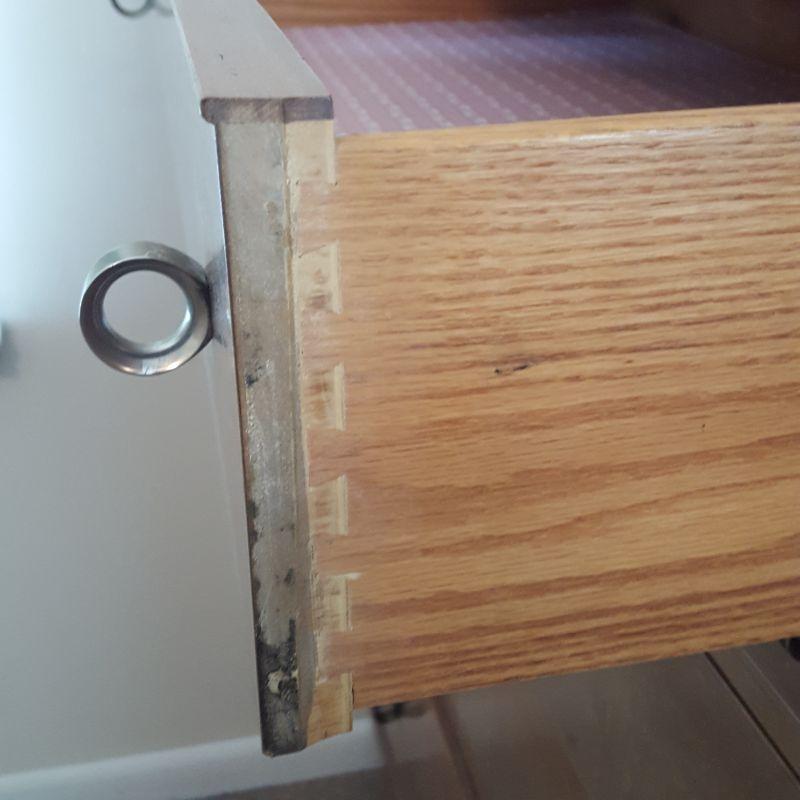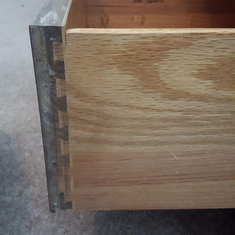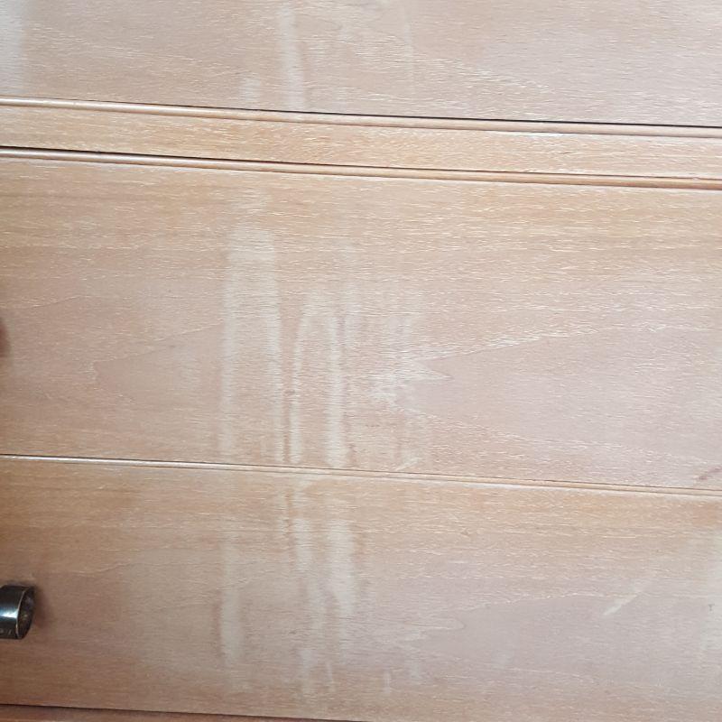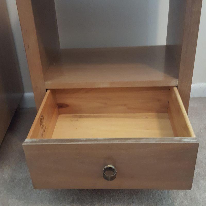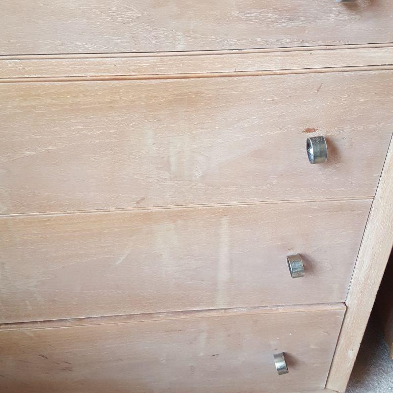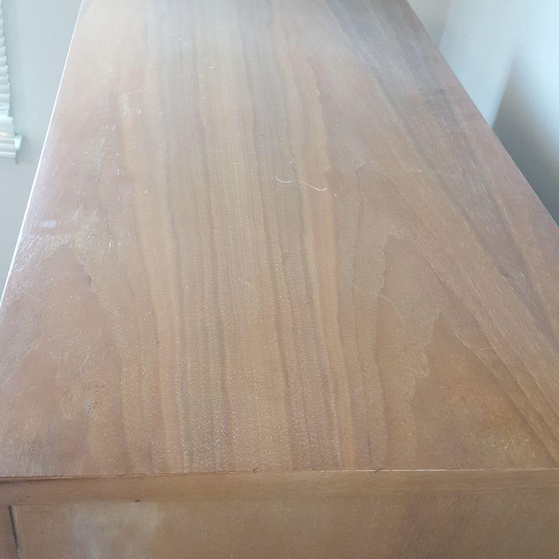 This lot includes a matching side table and tall dresser. Both items have some wear, but will last a lifetime! The side table measures 20x15x25 inches. The top has some glass ring stains that you can refinish or put a dowlie on...brand new! The tall dresser also has some wear on the top, but specifically on the front, that look like water stains. The tall dresser stands 38x20x46.5 inches. Reference lot 5 for other matching items. Local pick up only.