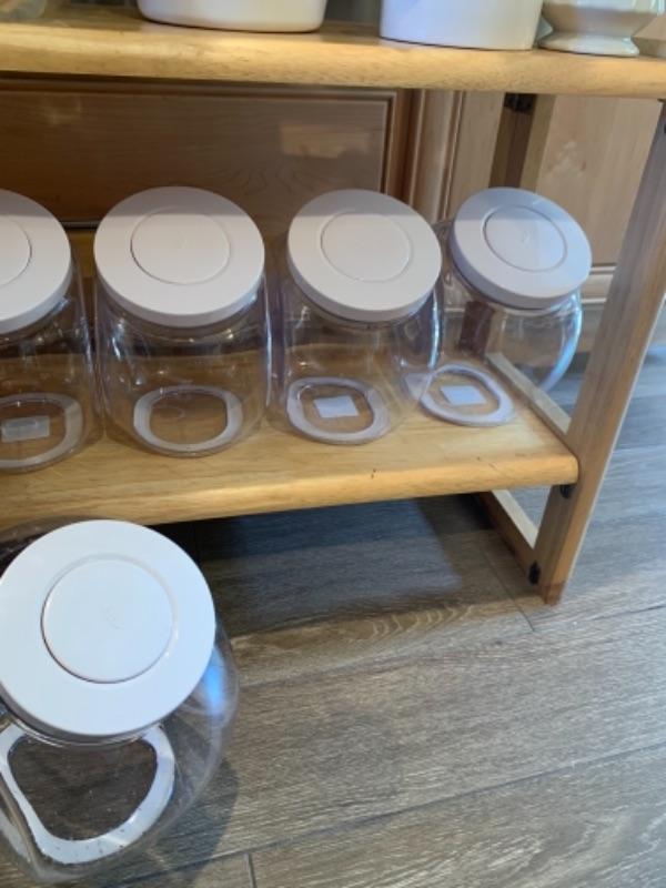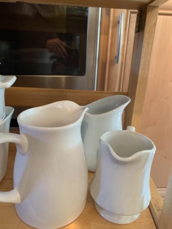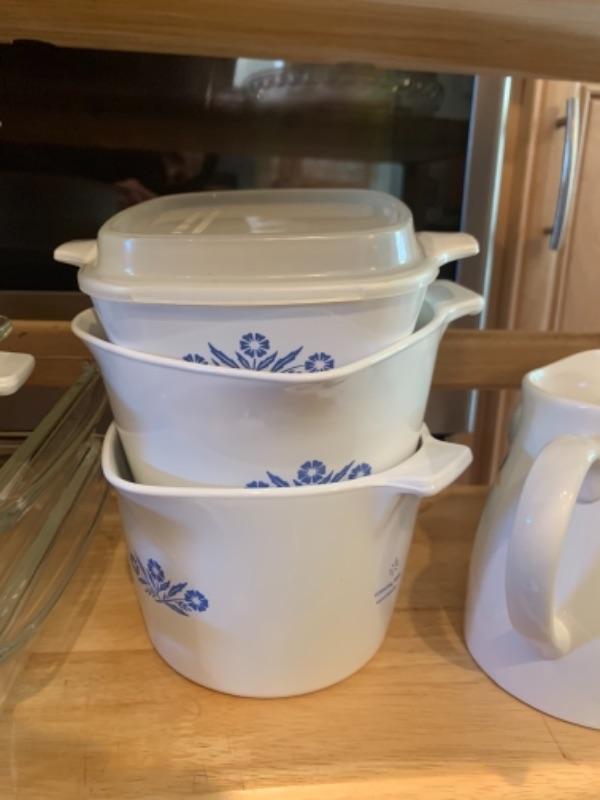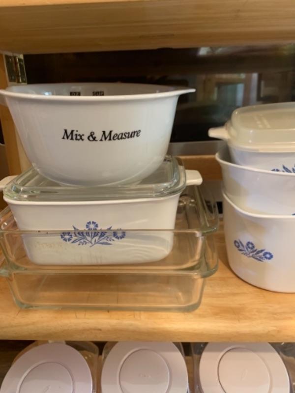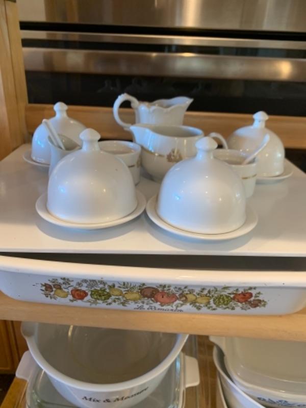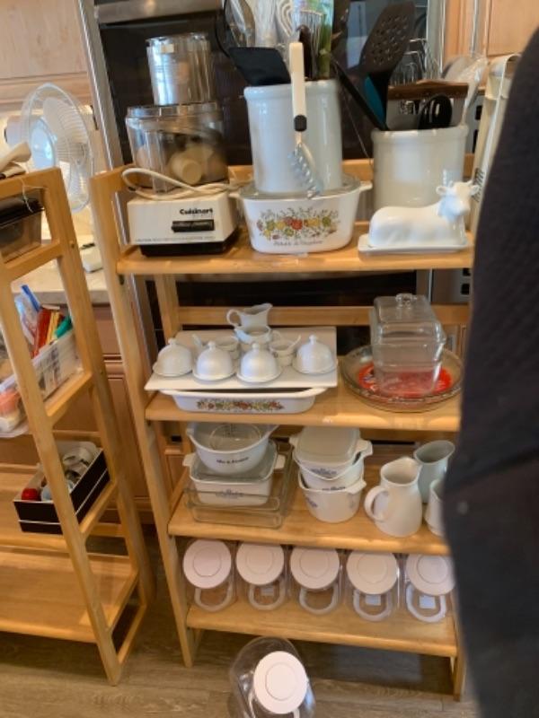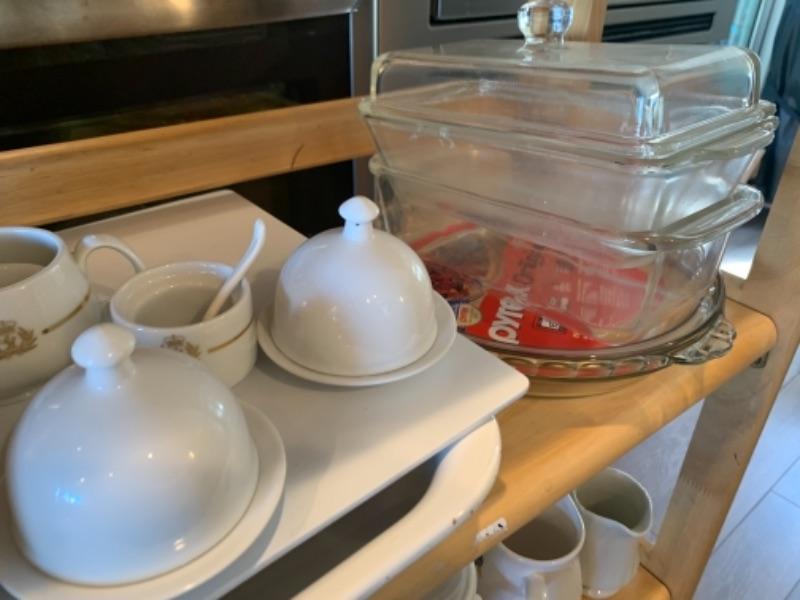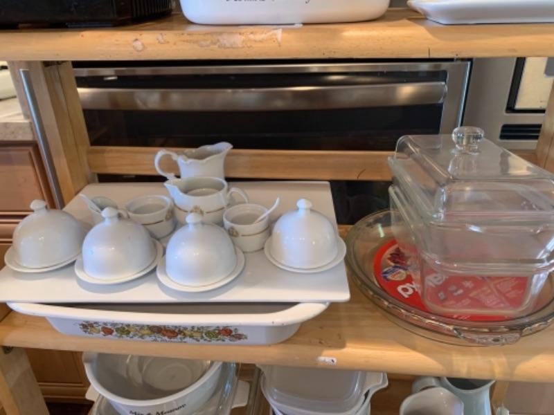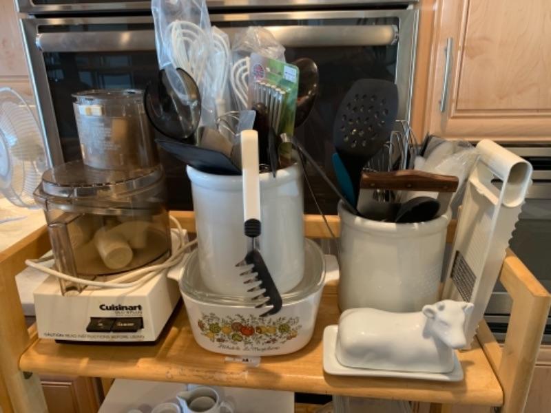 Lot 7. Large assortment of Corning ware, Cuisinart food processor, kitchen utensils, white china individual butter dishes, Pyrex, pitchers, canister set--$95