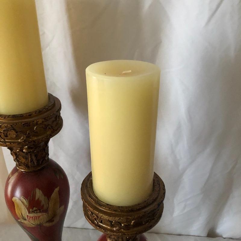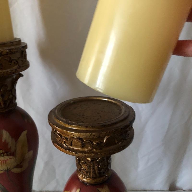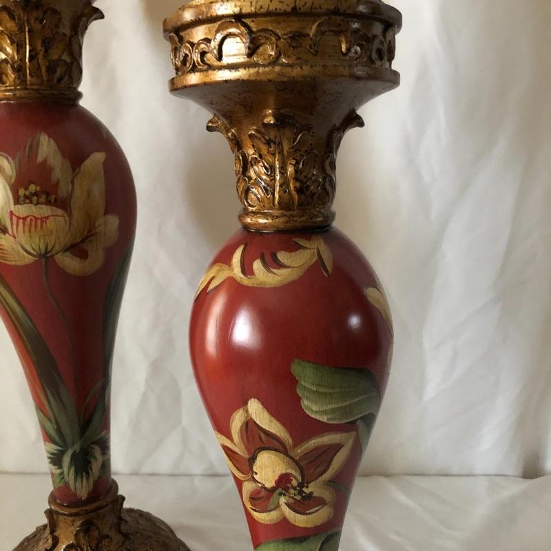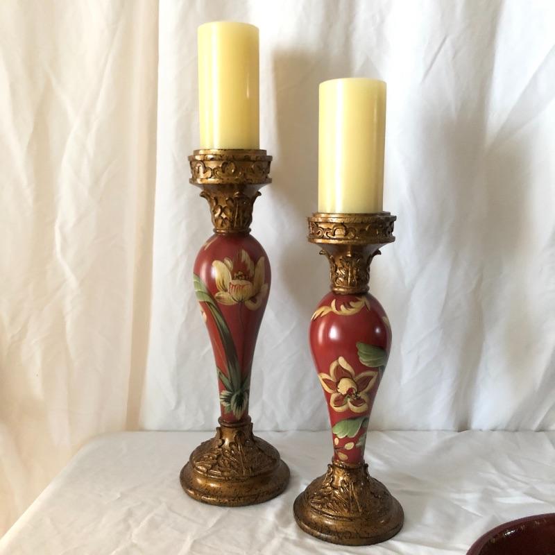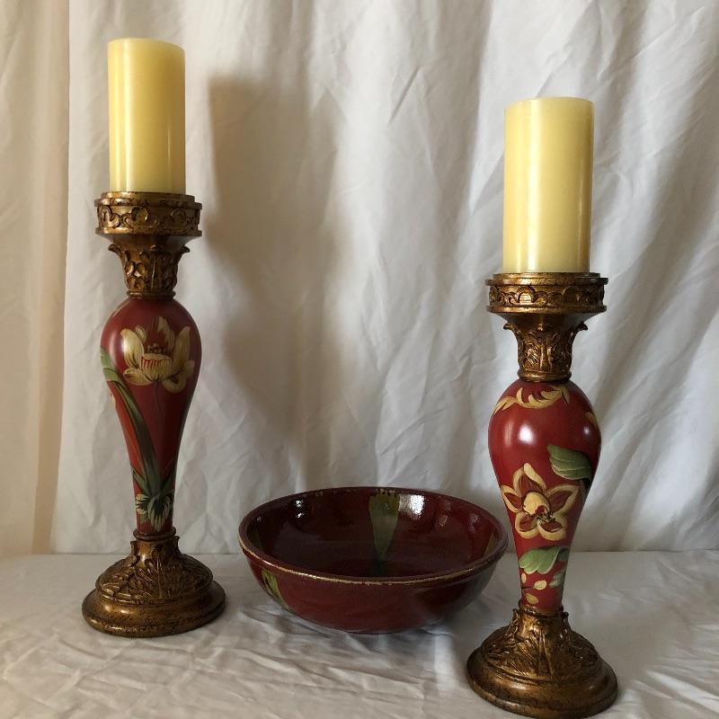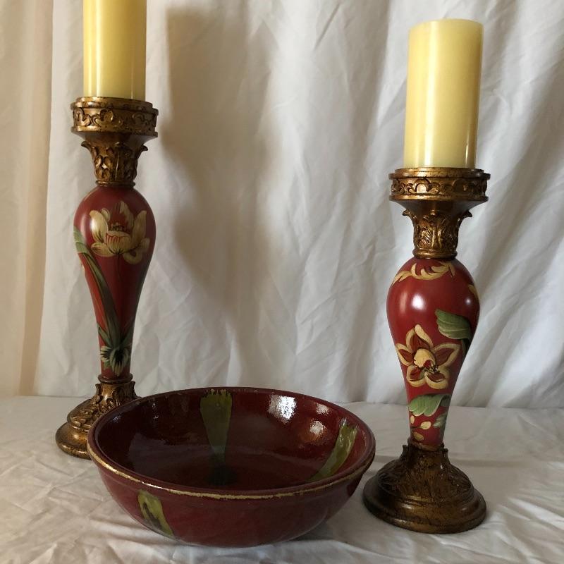 We have paired this large ceramic bowl with two ornate pillar candle holders. The bases appear to be wood or wood like with a floral design on a dark red background.