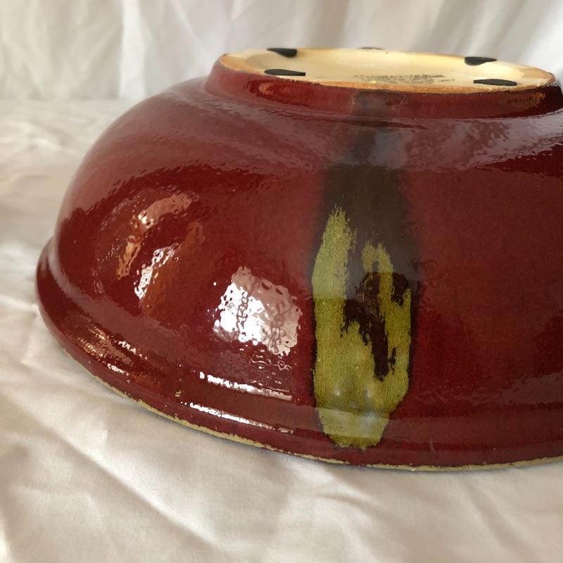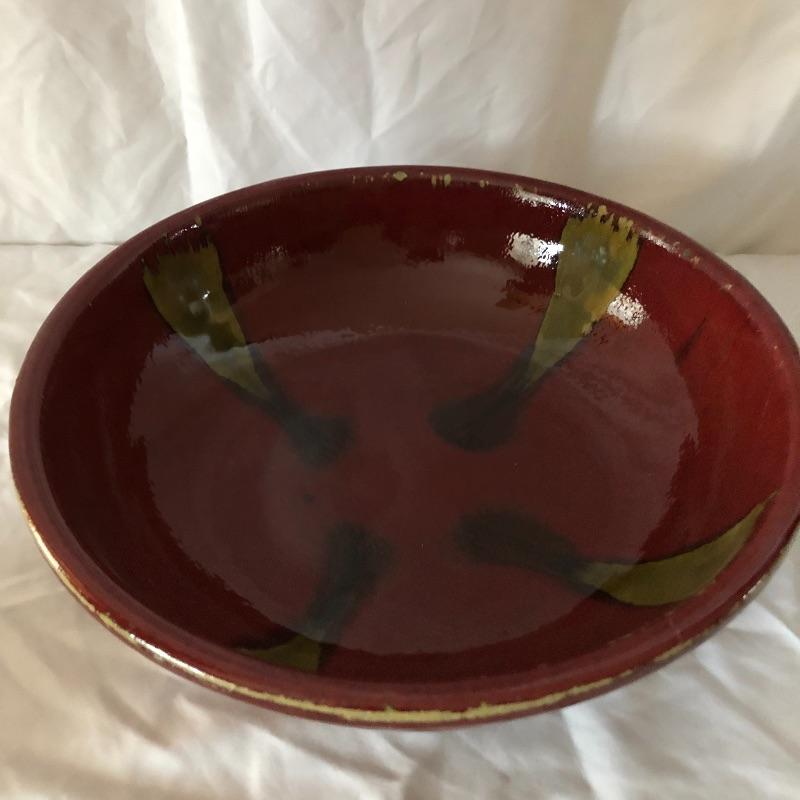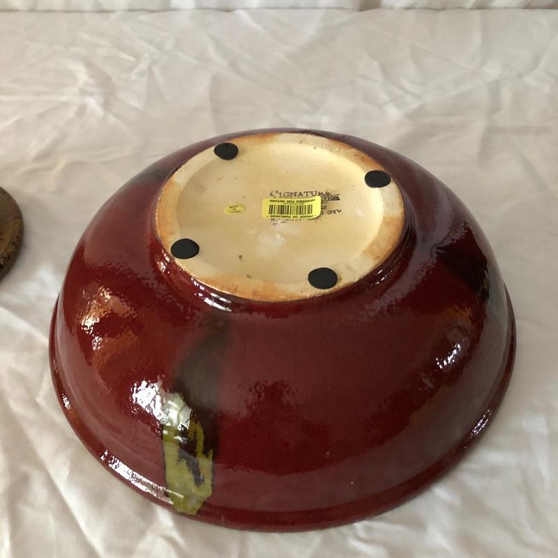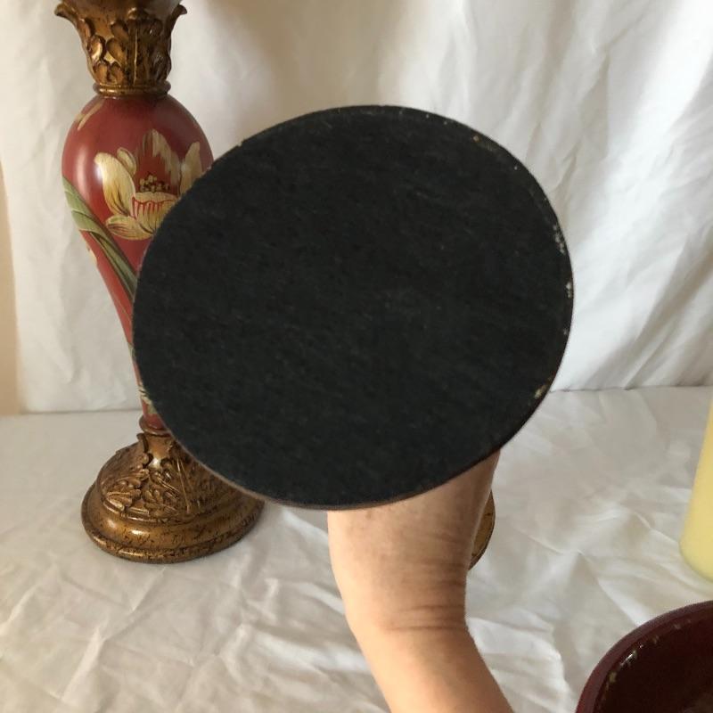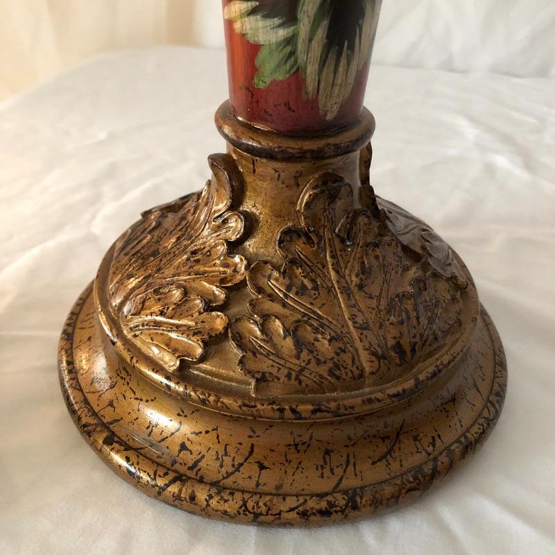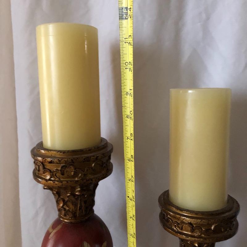 We have paired this large ceramic bowl with two ornate pillar candle holders. The bases appear to be wood or wood like with a floral design on a dark red background.