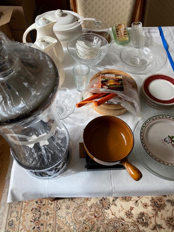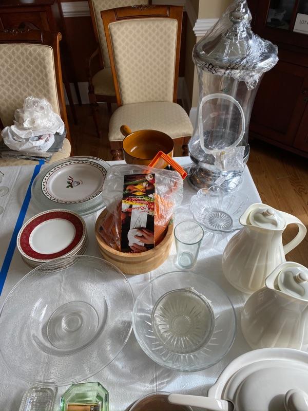 This lot includes New Shannon Crystal Drink Dispenser, Serving Bowls , Covered white soup tureen, 2 Carafes and more.
