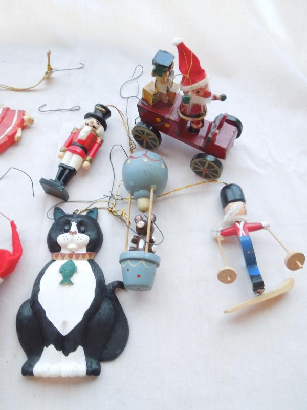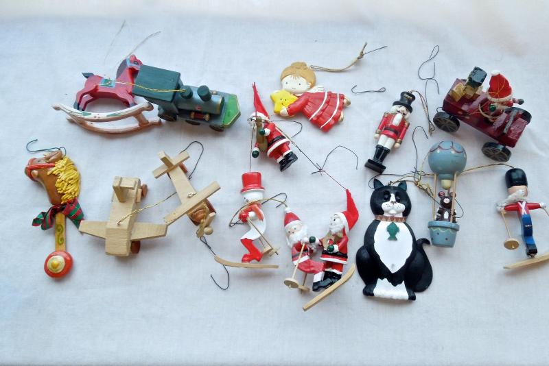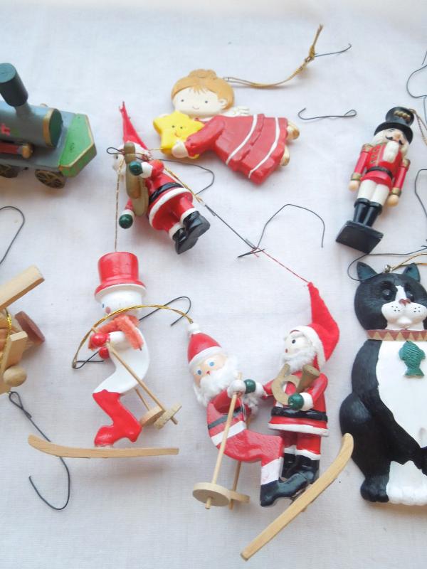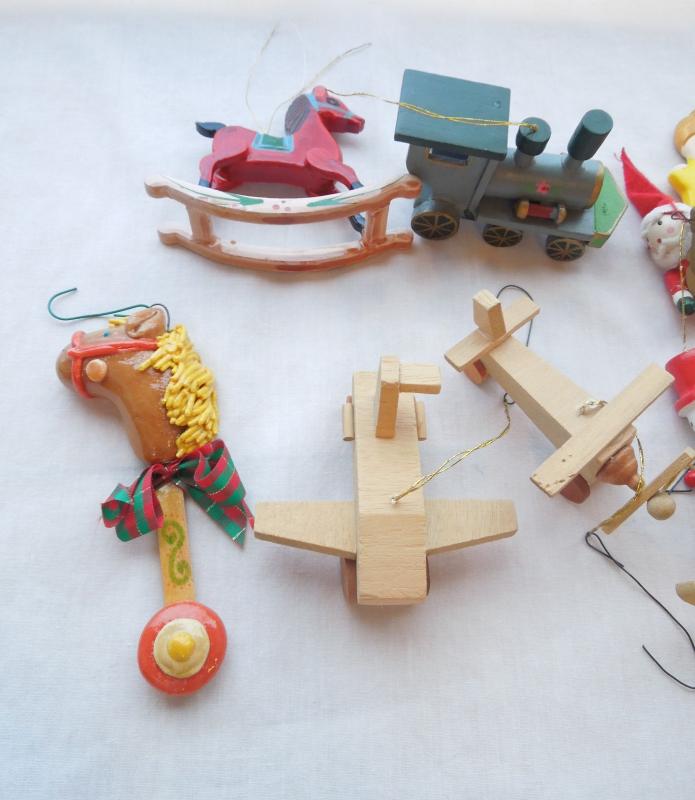 12 wooden ornaments. 3 are resin: angel, cat, and stick horse. Includes hooks. One plane has broken tail.