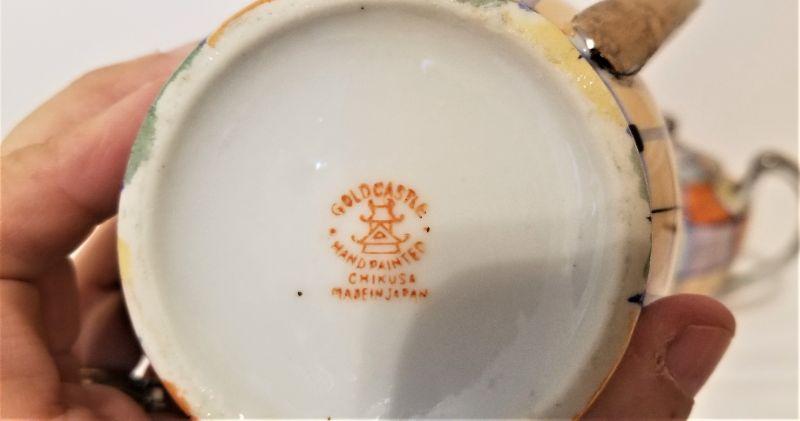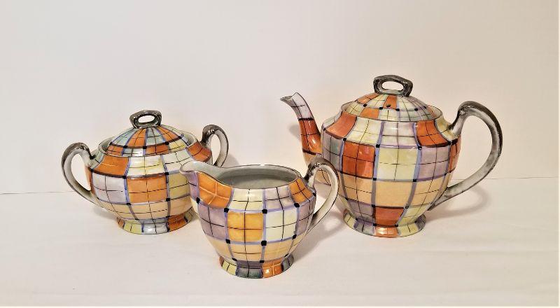 Sweet three piece Lustre Ware Tea set made in Japan - tea pot, creamer and sugar. Good vintage condition. Teapot is 5.5" tall, sugar is 4.75" inches tall, and creamer is 3.75" tall. Made by Goldcastle & Co.