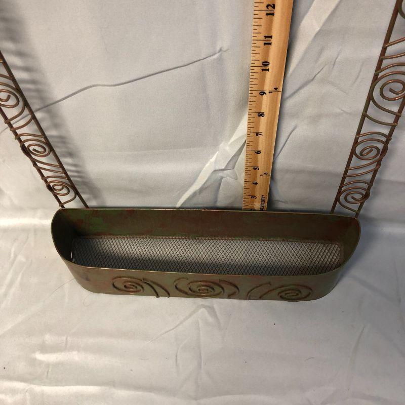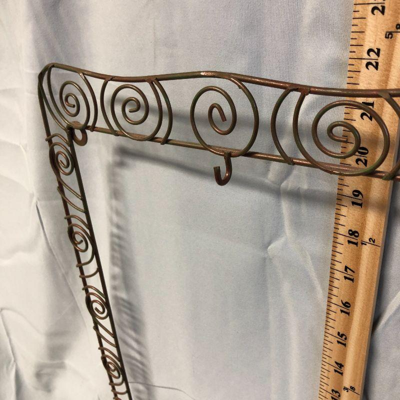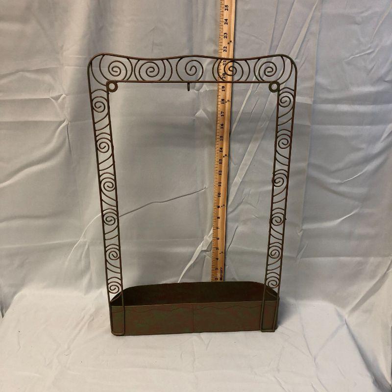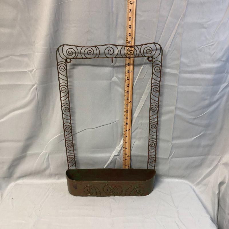 This piece is in great condition. It has a basket at the bottom and a hook at the top to hang something from. It is 21.75" x 14".