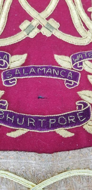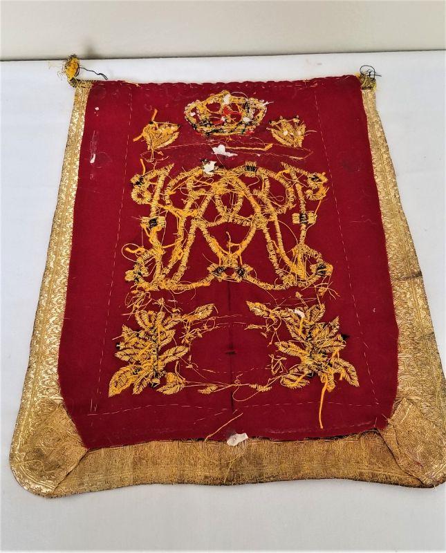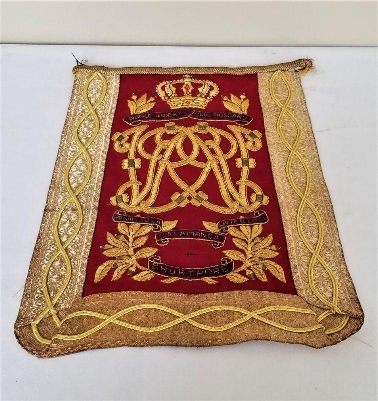My client was a British ex-pat who was an expert on the Napoleonic Wars and many other aspects of British Military History. He was an avid reenactor, collector, and maker of reenactment costumes and gear, many times using antique elements that he obtained from abroad. This little banner is a work of art, commemorating Price Albert's Own Hussars and noting their involvement in the following campaigns: Penninsula, Sulamanca, Waterloo, and Bhurtpore. Measures 14" x 11" I honestly can't tell if this is original or a partial re-pop using antique elements - he was THAT good. I believe it is old, but I'll let the buyer be the judge. SO - we are making no claims as to date of manufacture or authenticity - know what you are buying.