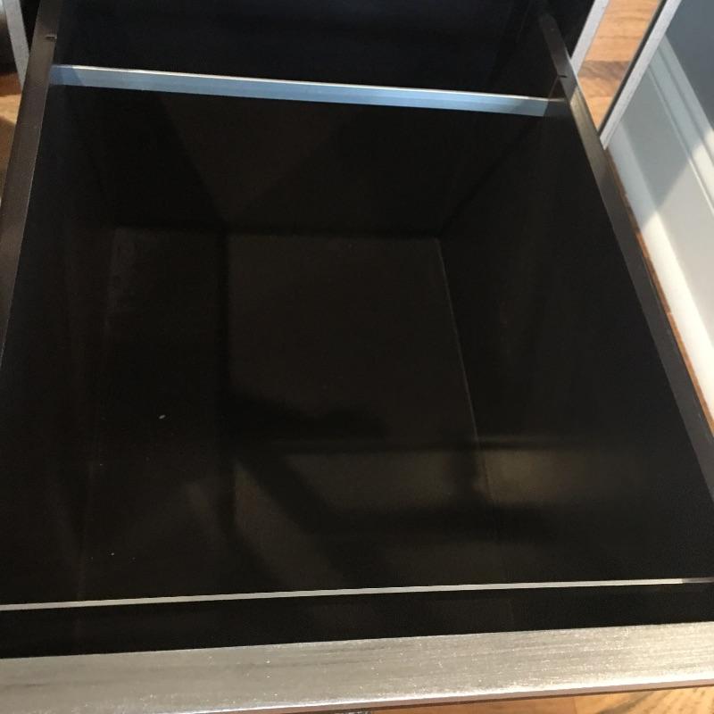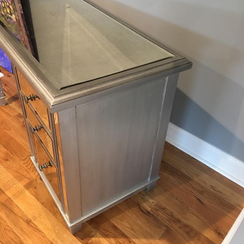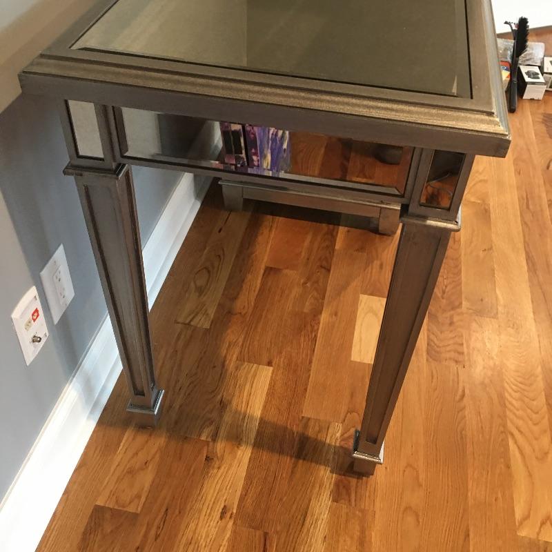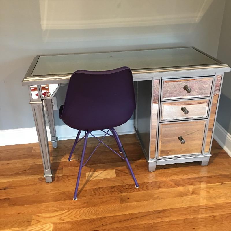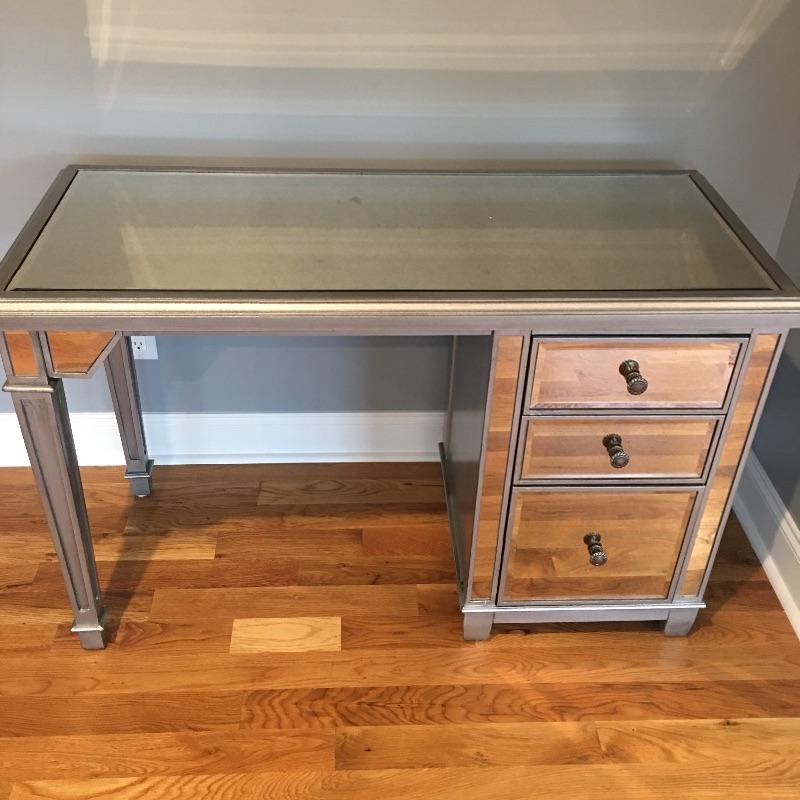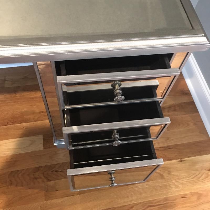 Stunning mirrored three drawer desk by Pier One. Add some serious bling to your home office or bedroom with this dazzling desk that catches the light with its sleek mirrored appeal. Desk measures 21.5” x 48.5” x 30.75” and is less than a year old.