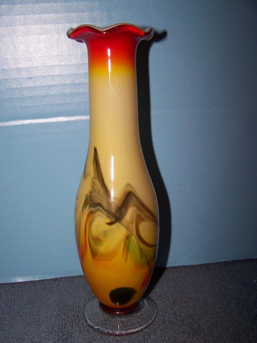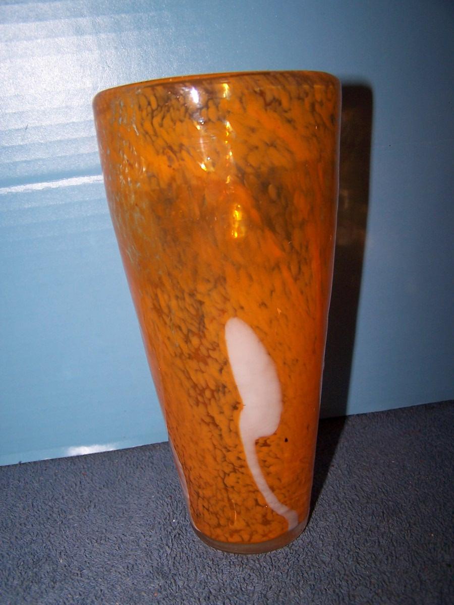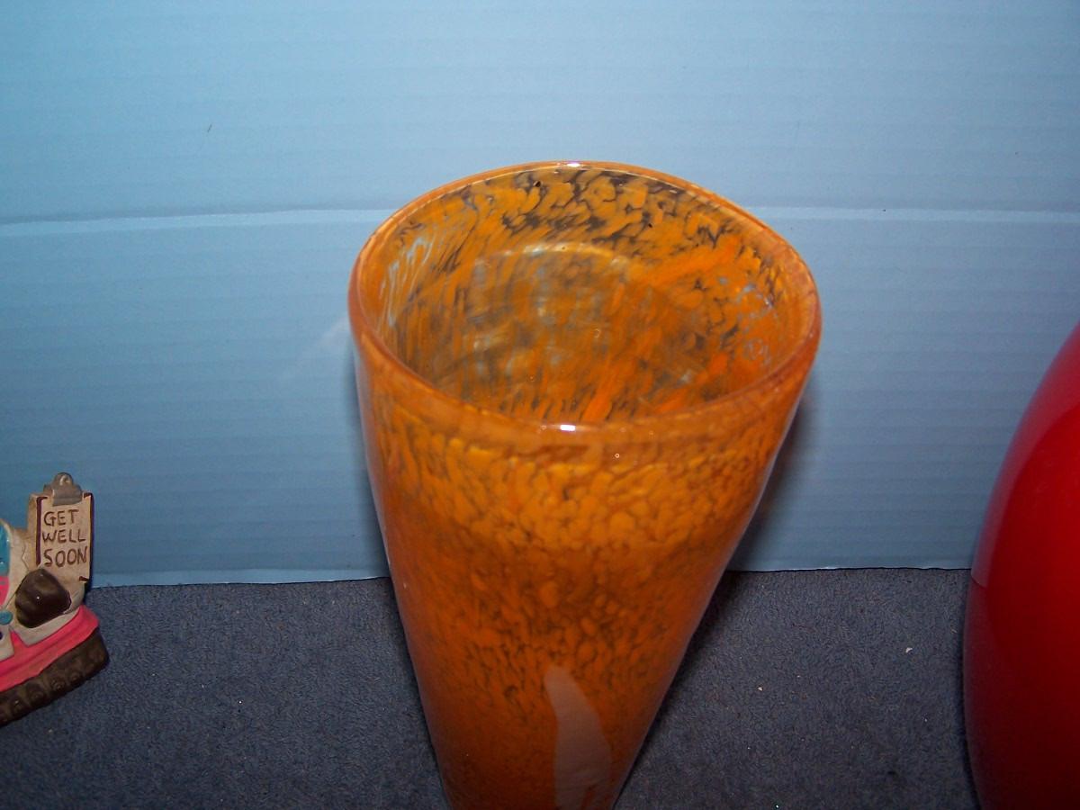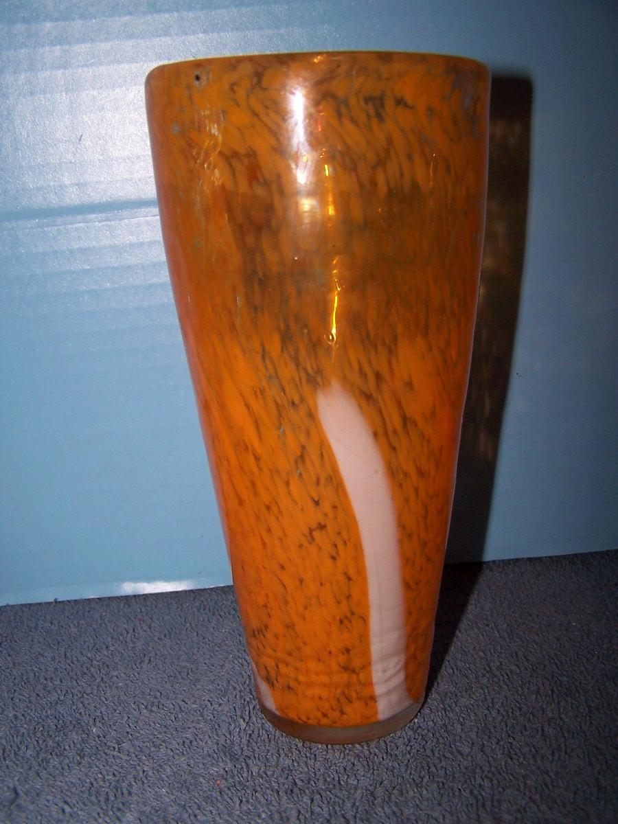 GREAT VINTAGE MCM ART GLASS UNMARKED ORANGE VASE IS 8 INCHES TALL LIGHT WEAR