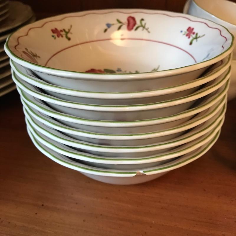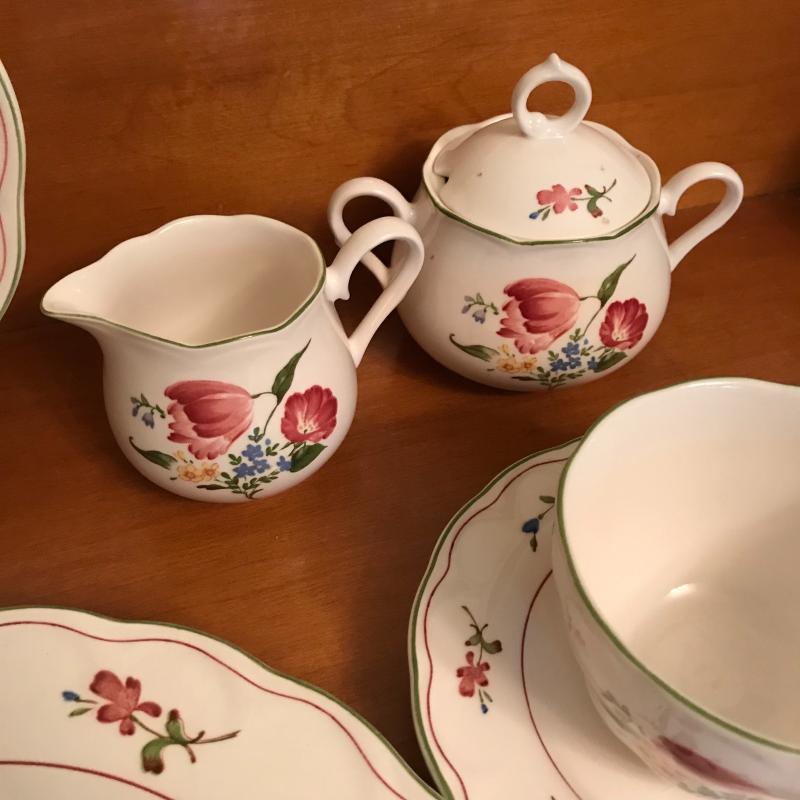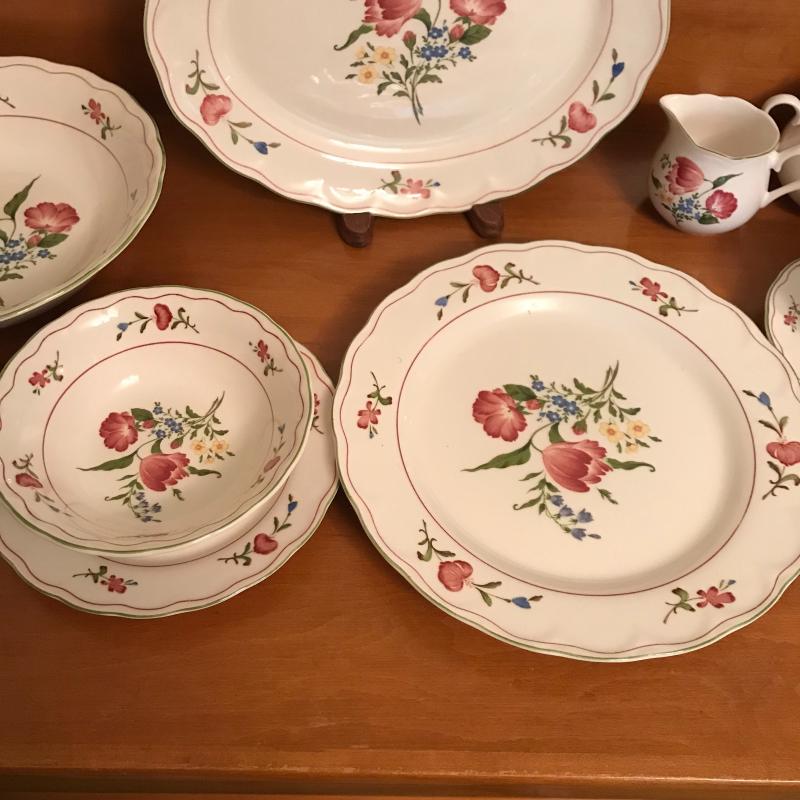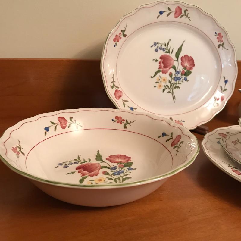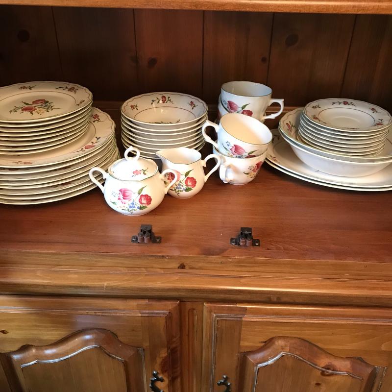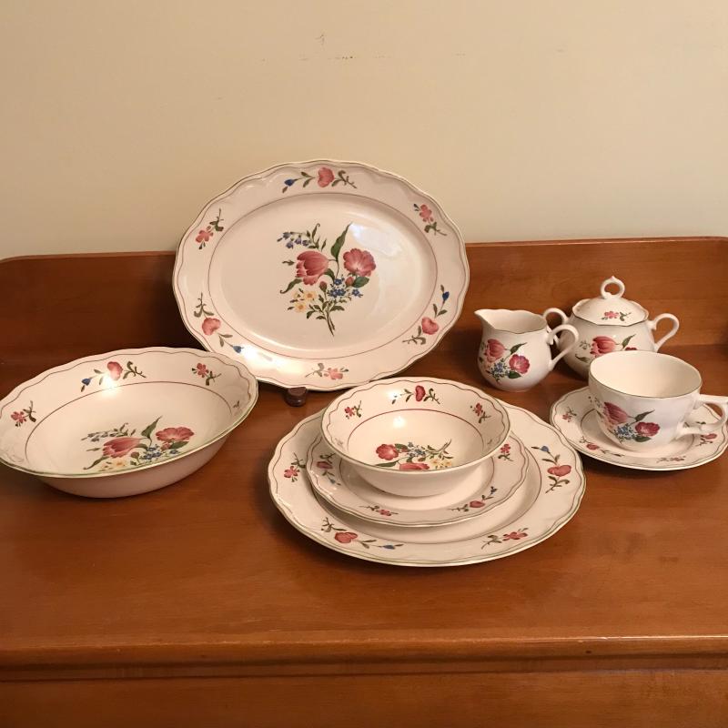 Beautiful Provencial Designs collection includes cream and lidded sugar bowl, two platters (11.75”x9.25”), two serving bowls (9.25”d x 2.25”h), five teacups and eight each: saucers, soup bowls, bread plates and 10” dinner plates. Some chips noted in pics. Local pick up only.