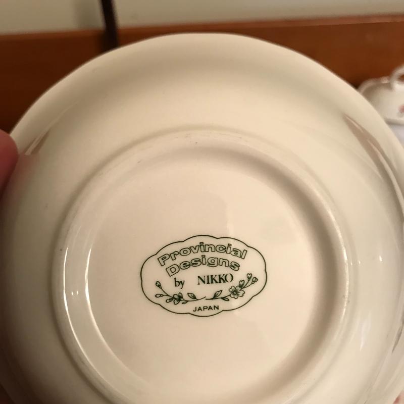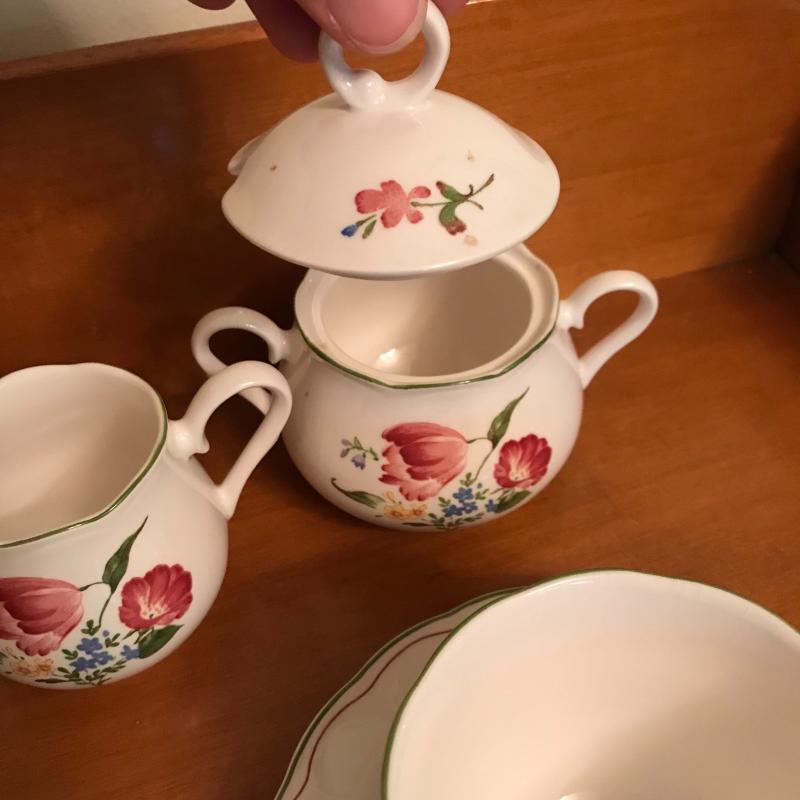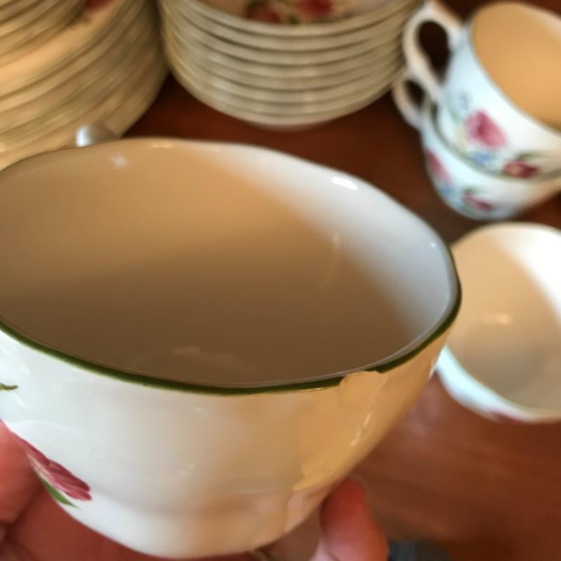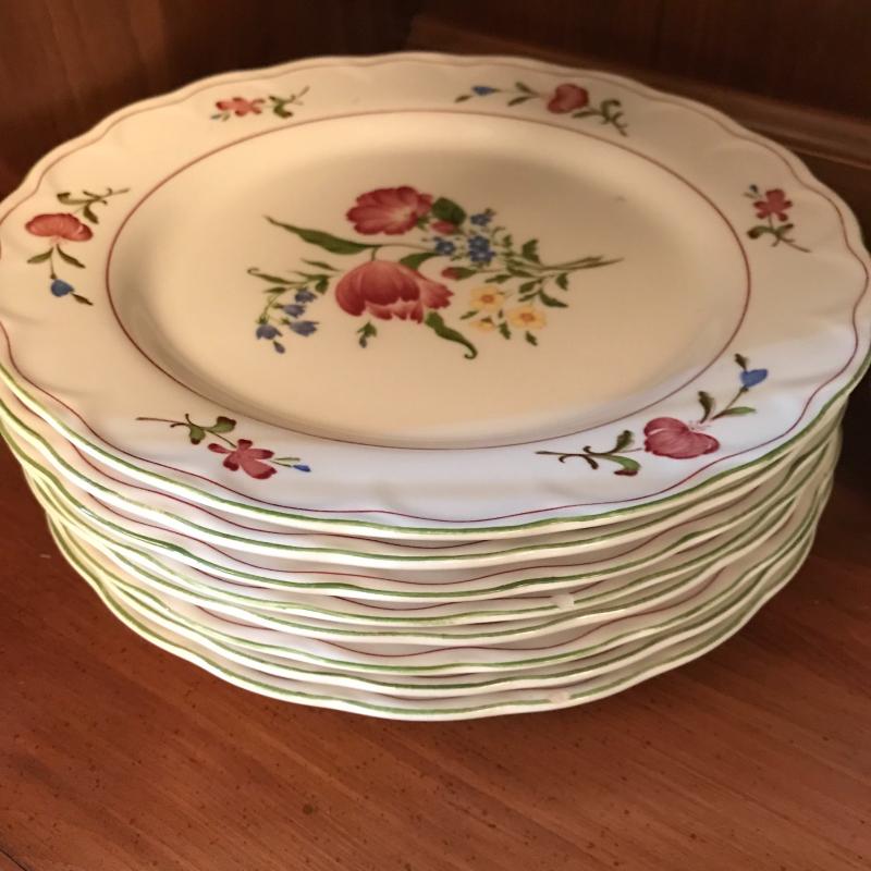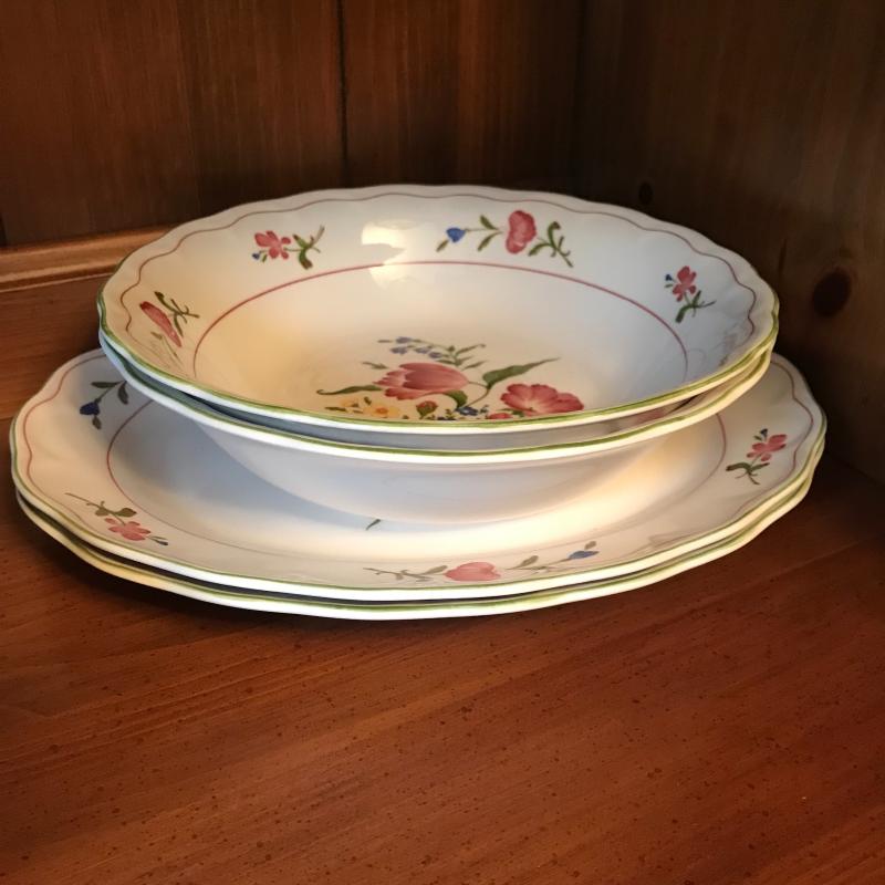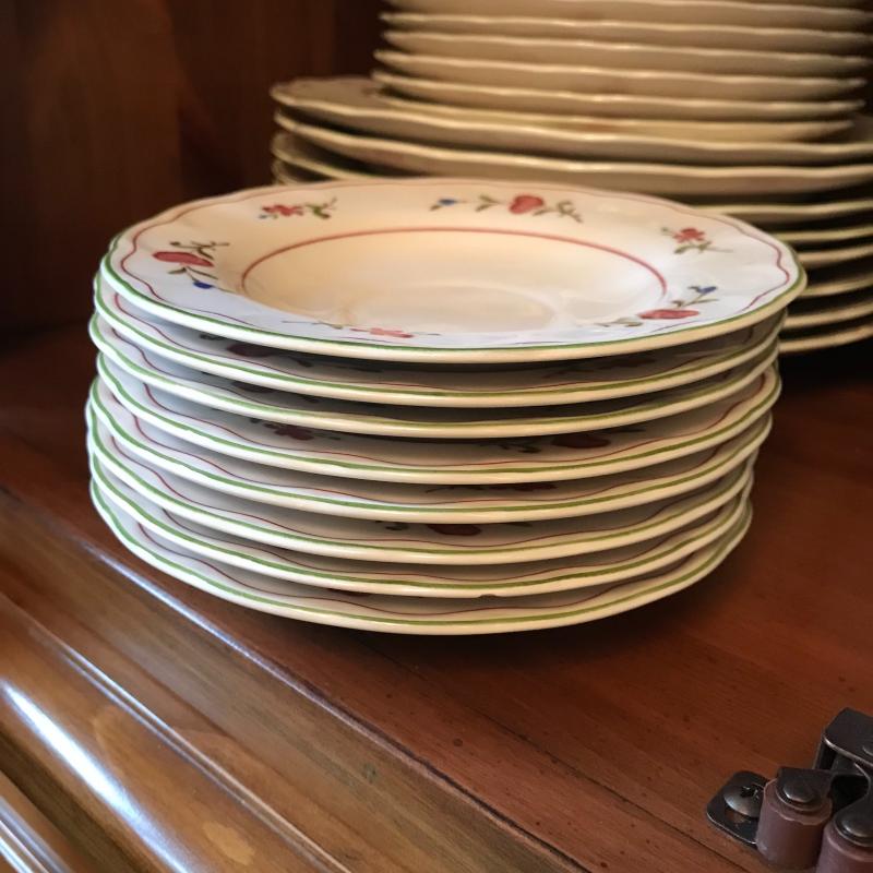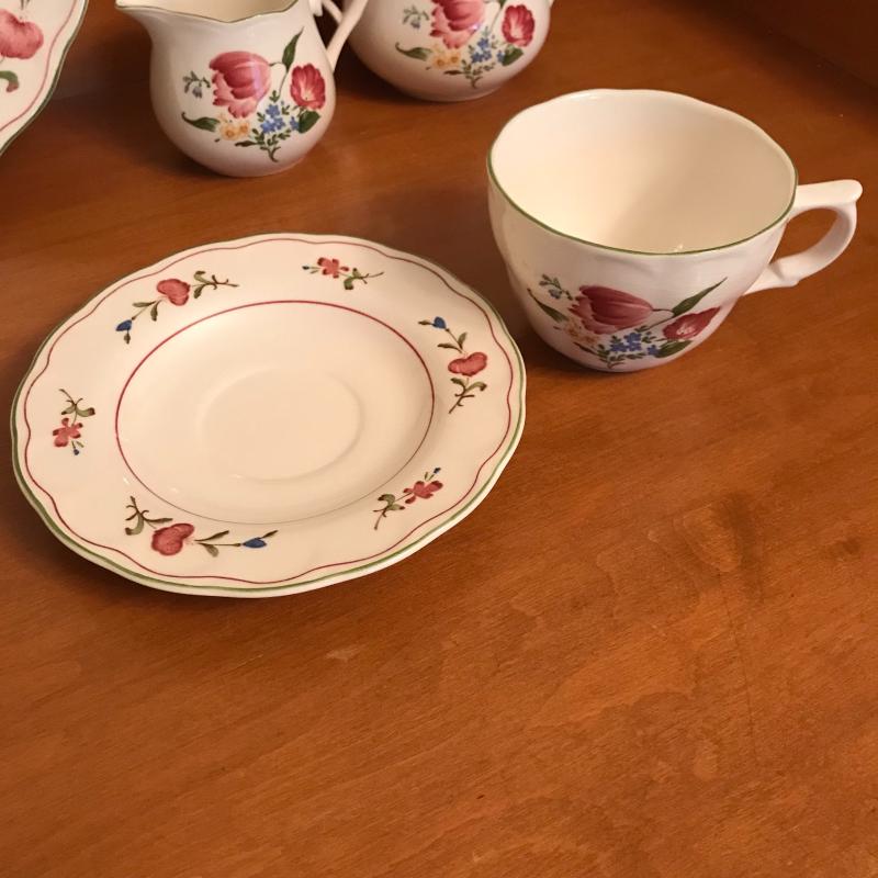 Beautiful Provencial Designs collection includes cream and lidded sugar bowl, two platters (11.75”x9.25”), two serving bowls (9.25”d x 2.25”h), five teacups and eight each: saucers, soup bowls, bread plates and 10” dinner plates. Some chips noted in pics. Local pick up only.