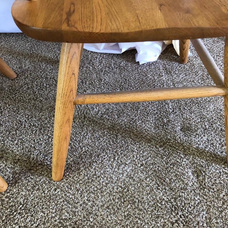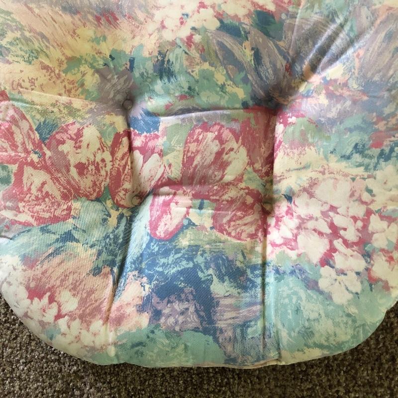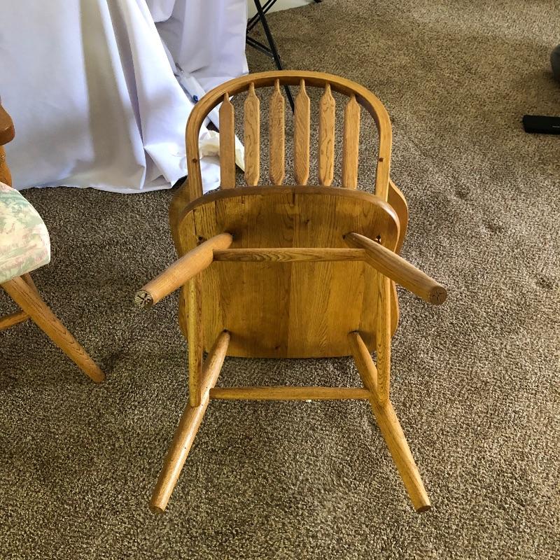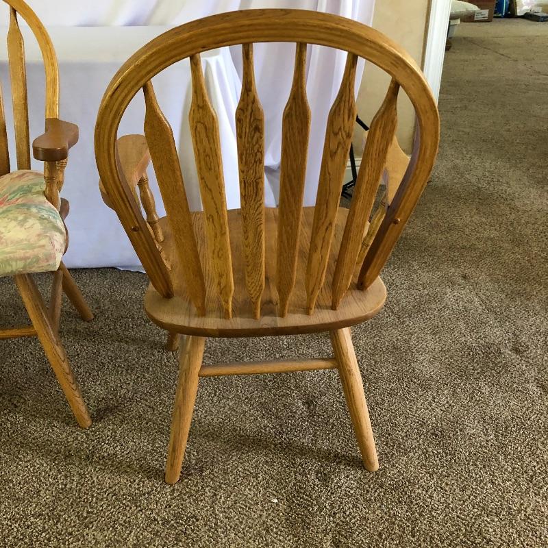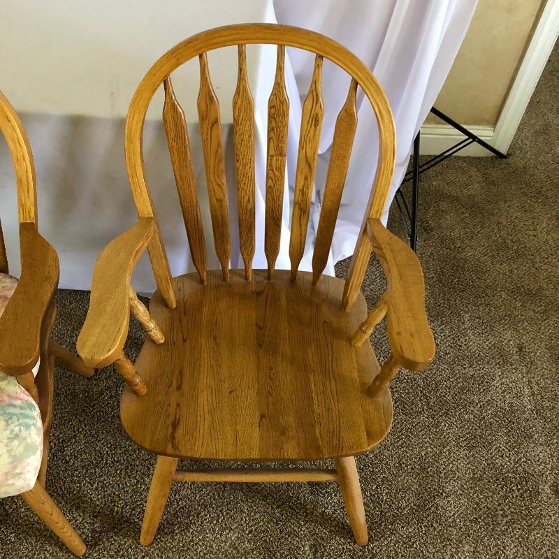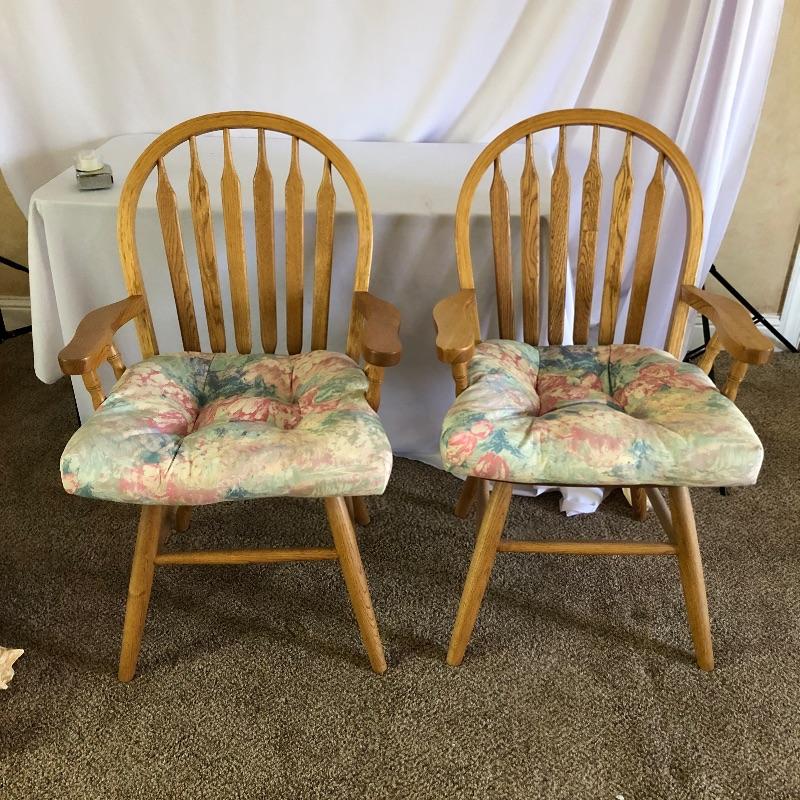 Two sturdy, well made pine wood chairs here with pretty floral chair cushions. The chairs measure 20” x 23” x 30” and the seats are 17” tall with the cushion.