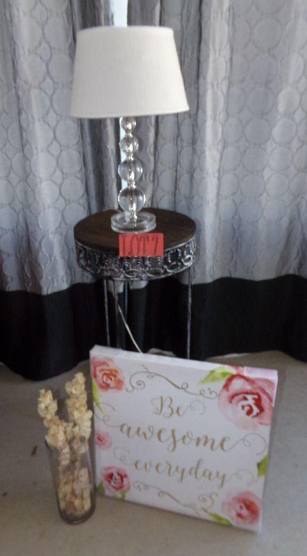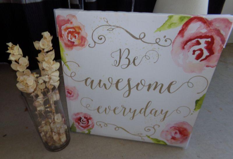 Table lamp with a plastic base, canvas picture "Be awesome everyday" that measures 20"x20" and a glass vase with dried flowers